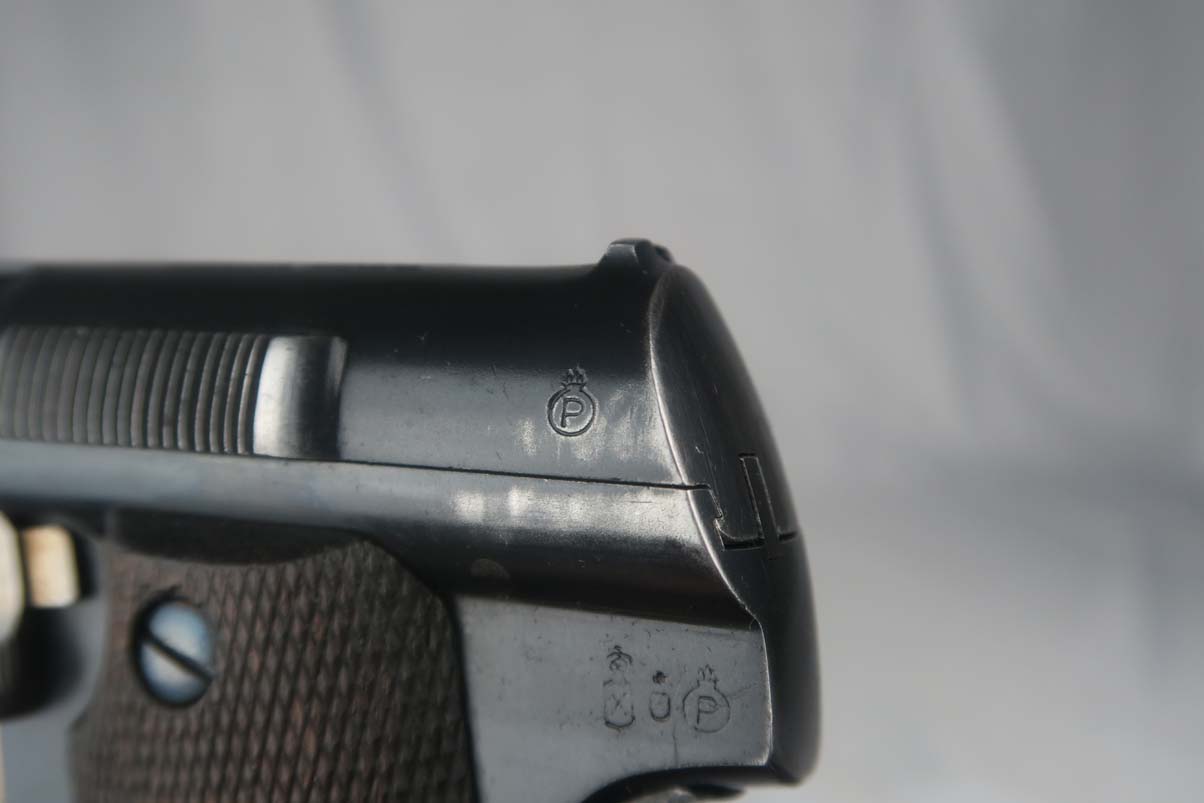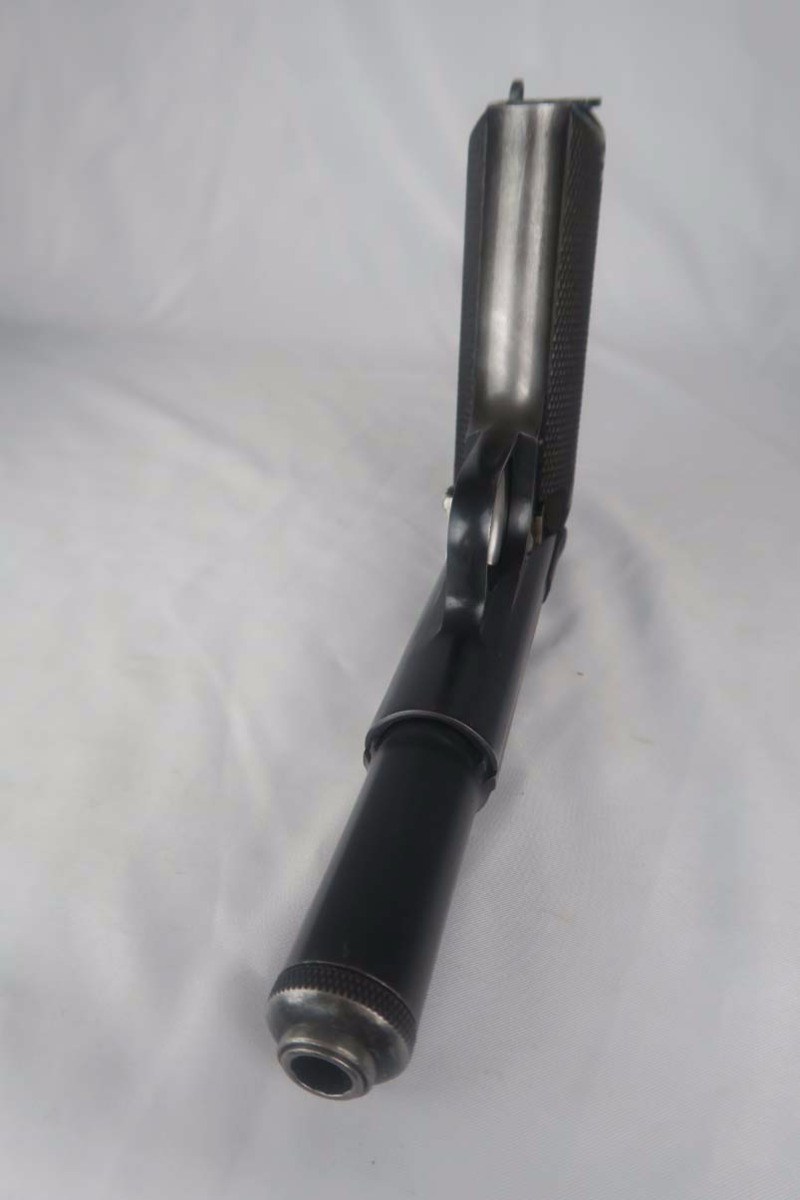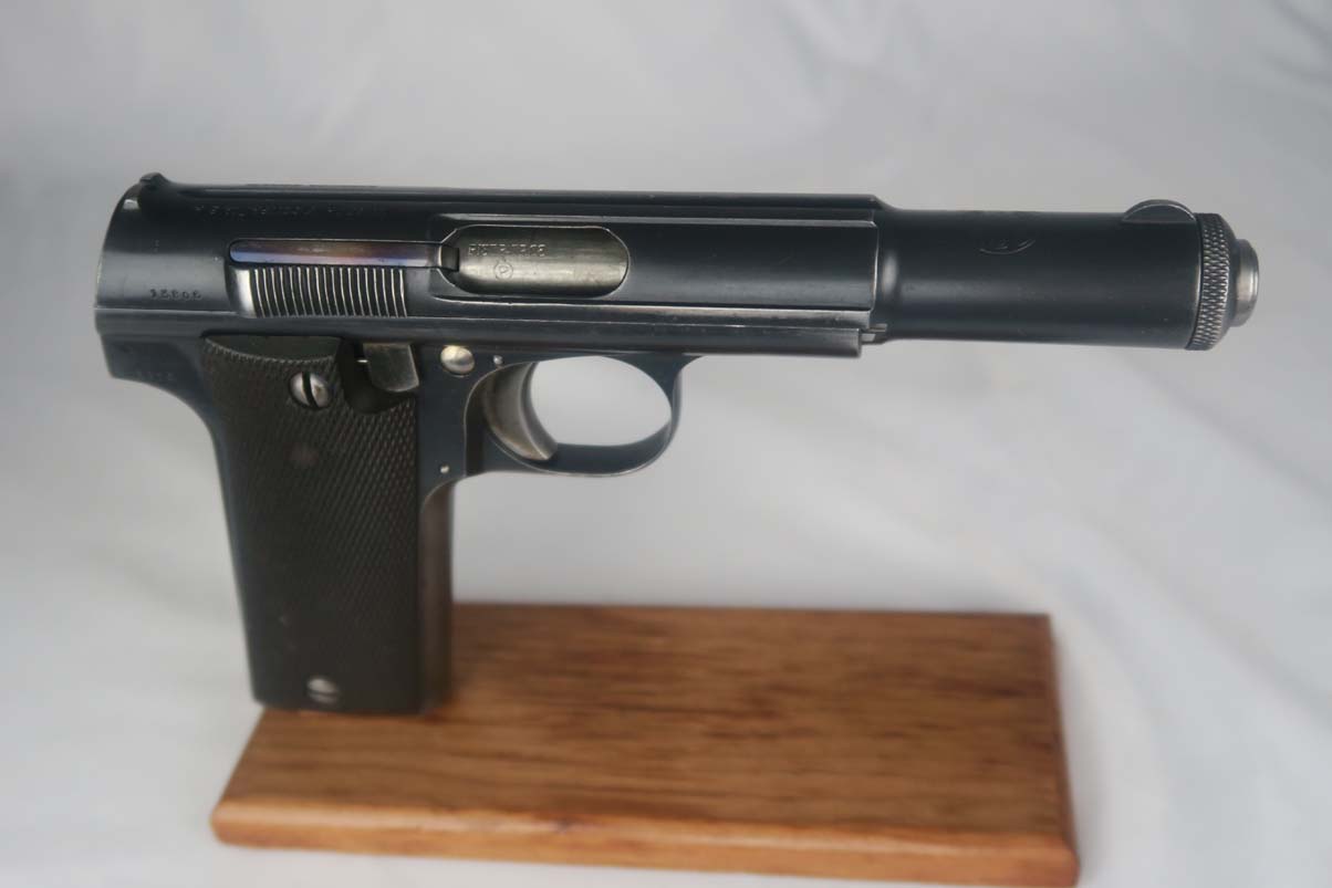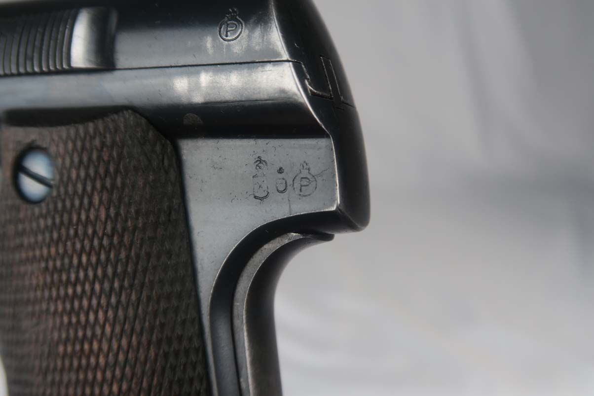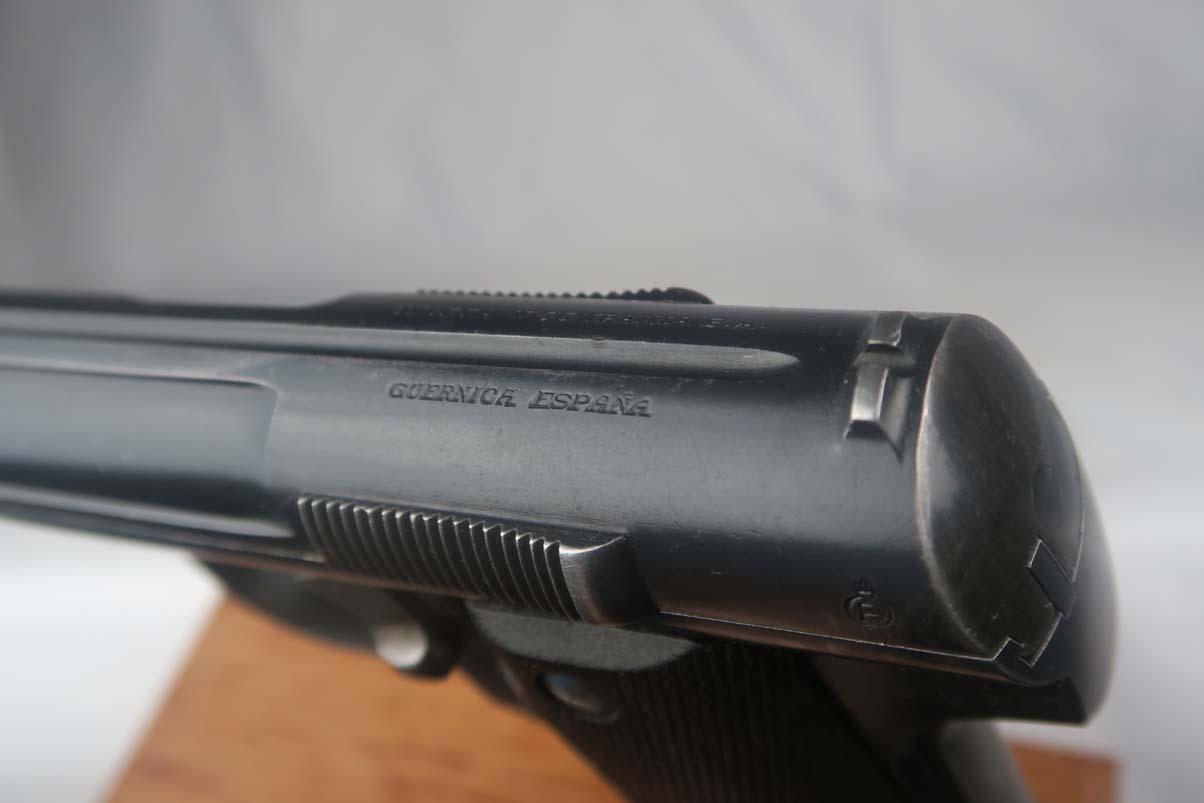 5/24/17 – This is Astra 600 rig, with two magazines (one matching) and correct holster.  These were developed starting in 1943 at the request of the German Army, which wanted a smaller version of the Astra 400.  The first 50 were delivered as sales samples, then a little over 10,000 were delivered across the Spanish-French border to German Army, and were waffen stamped.  This pistol falls into the range just beyond those, as 28,000 Astra 600’s went undelivered due to the Allied landings in France and subsequent battles sealing the border.  This undelivered range is known as the “second contract”, and this pistol falls in that serial block.  The original finish rates at abotu 90%, with most of the wear on the front strap.  One magazine is numbered to the pistol on the bottom, in a style similar to a police numbering.  Spare magazine and holster are in good condition and are correct for this piece.  Excellent bore.