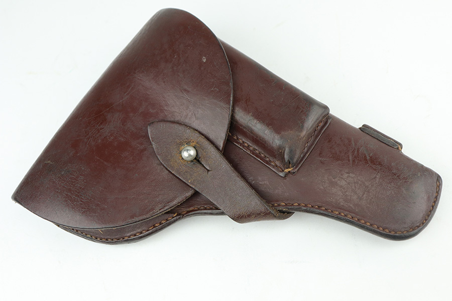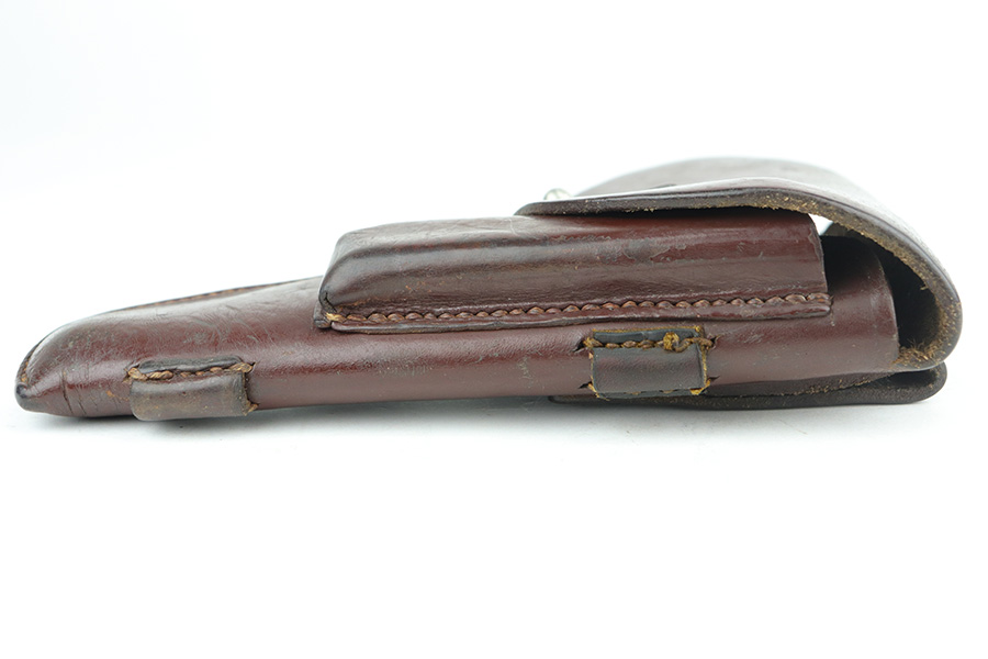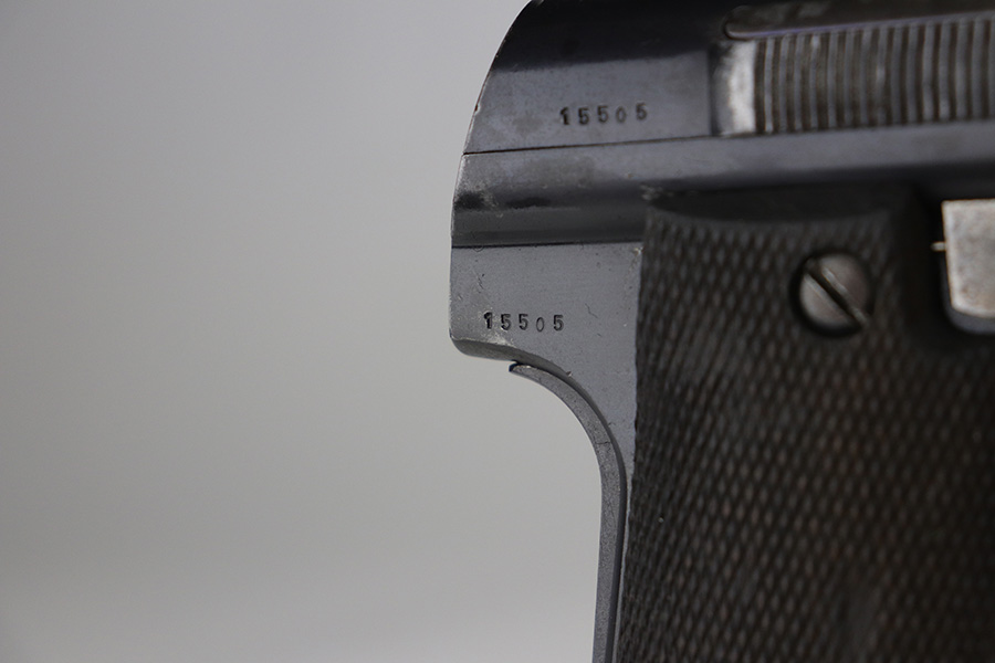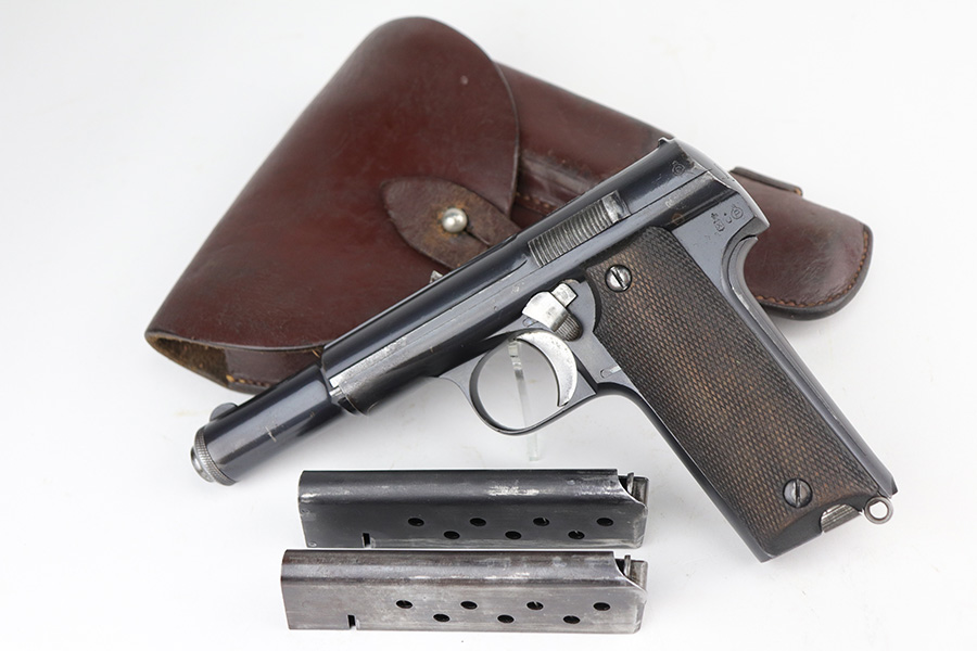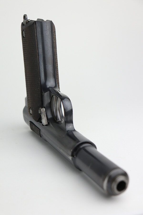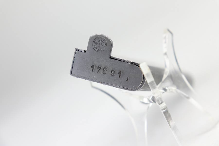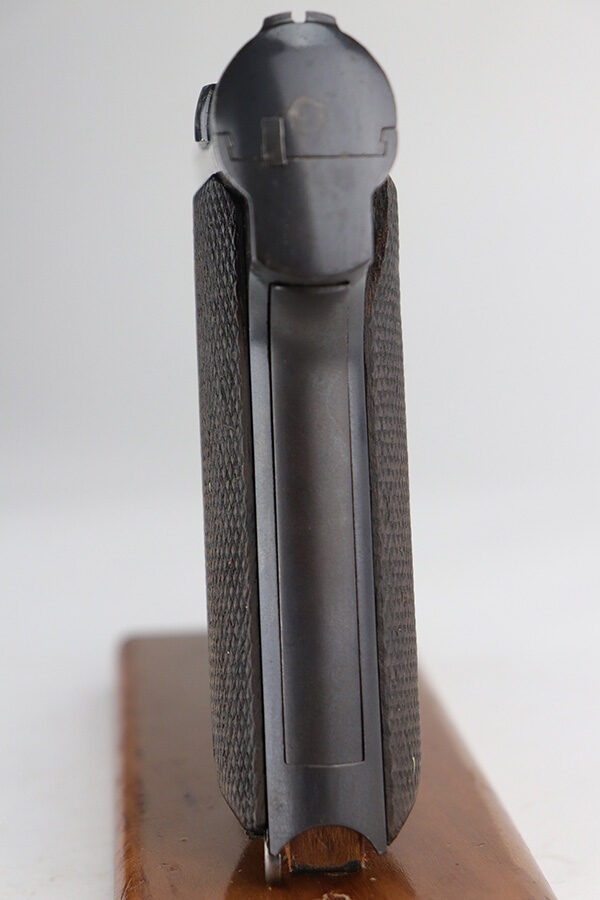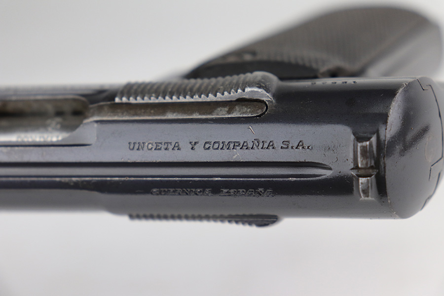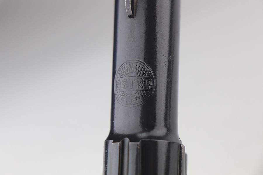 9/1/21 – This is a very nice example of an Astra 600 rig that was part of a 1943 contract with the Nazi military but were never actually delivered. These guns are in the 10501-38500 serial range and are not waffen proofed. This one is all matching and has the proper Spanish proofs. The rig comes with a nice post-war holster, one un-numbered magazine, and one mismatched numbered magazine. It is possible this gun went into police service after the war, given the holster and numbered magazine. It has nice wood grips that are slightly worn. It has retained about 92-93% of its original finish. There is spotty freckling and oxidation on the straps. Minor splotchy, scratchy wear along both sides of the slide and on the barrel. An area of pin-pricking on the left side of the barrel and frame. Very nice bore – shiny with good rifling.