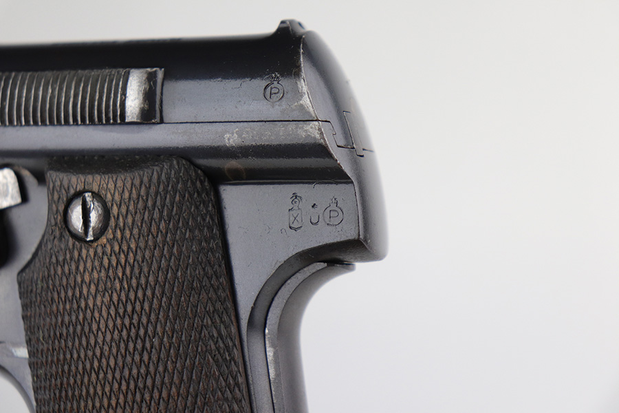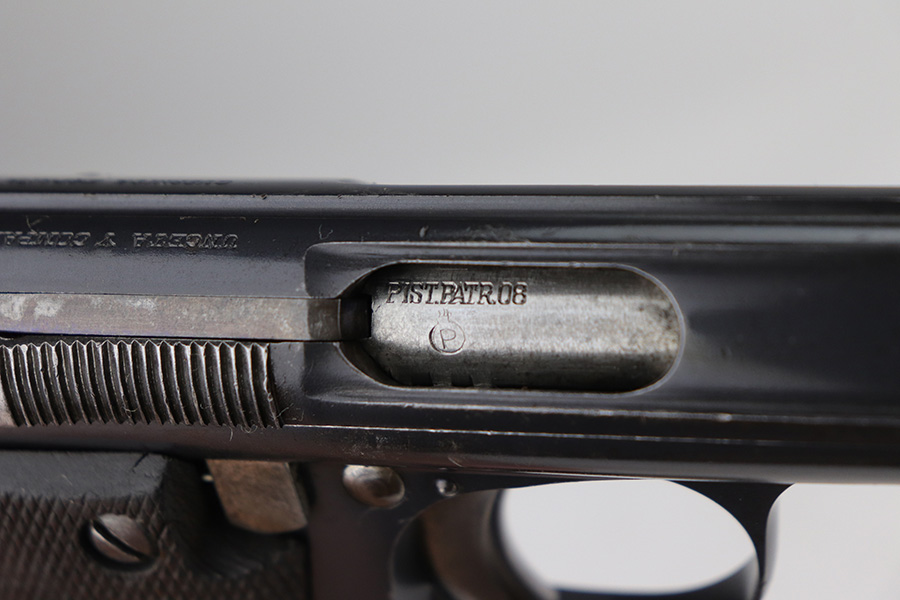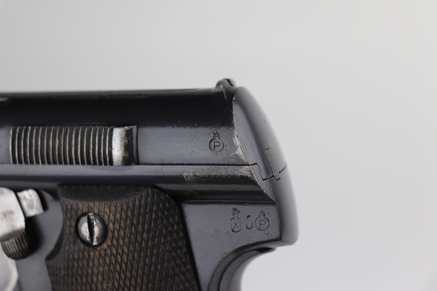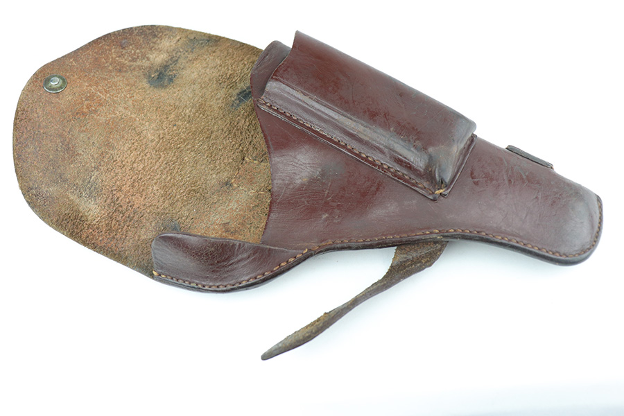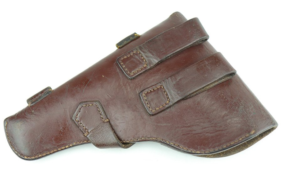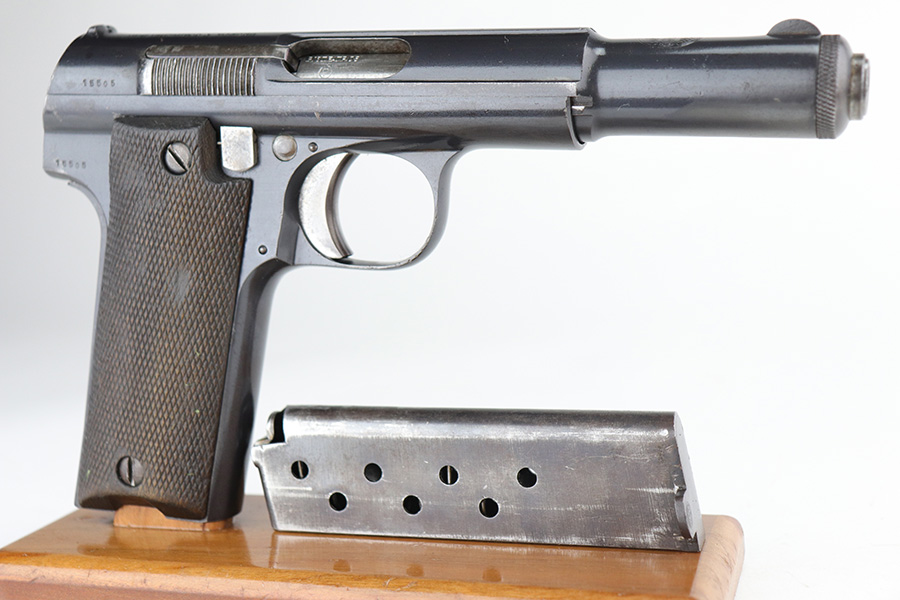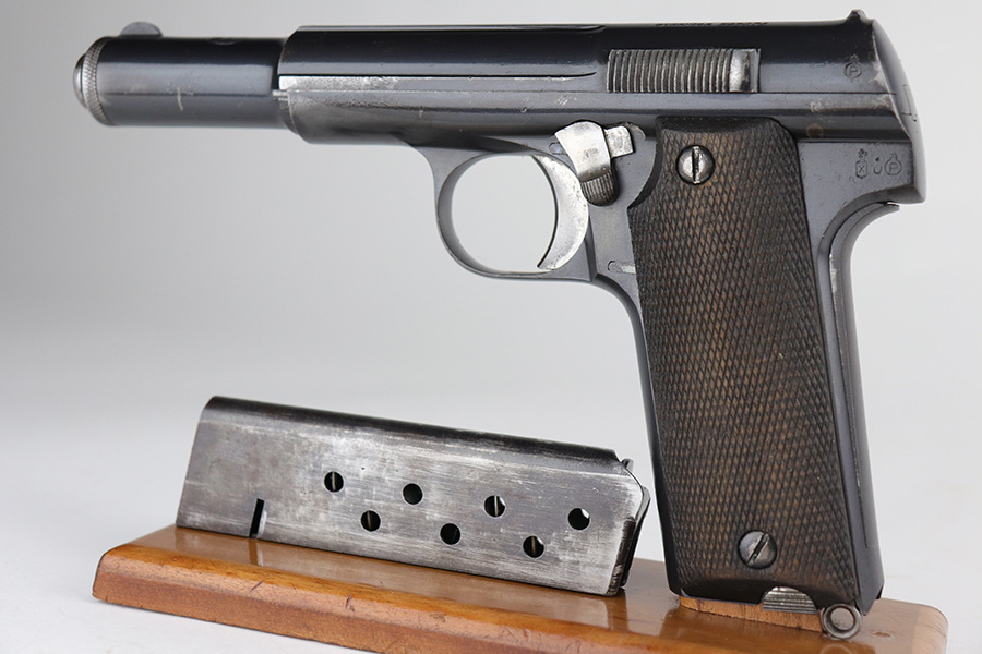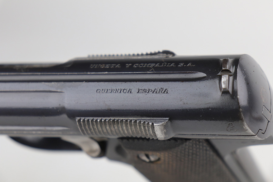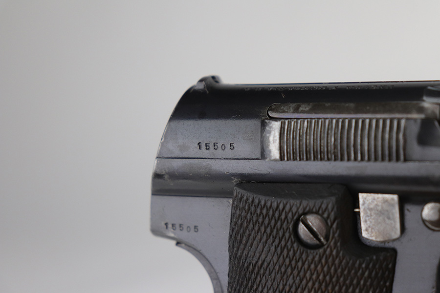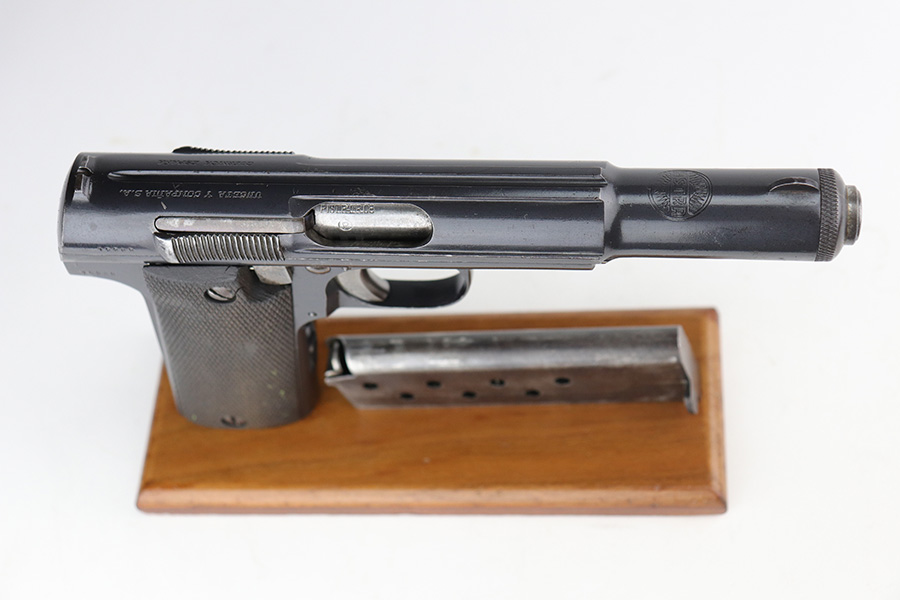 9/1/21 – This is a very nice example of an Astra 600 rig that was part of a 1943 contract with the Nazi military but were never actually delivered. These guns are in the 10501-38500 serial range and are not waffen proofed. This one is all matching and has the proper Spanish proofs. The rig comes with a nice post-war holster, one un-numbered magazine, and one mismatched numbered magazine. It is possible this gun went into police service after the war, given the holster and numbered magazine. It has nice wood grips that are slightly worn. It has retained about 92-93% of its original finish. There is spotty freckling and oxidation on the straps. Minor splotchy, scratchy wear along both sides of the slide and on the barrel. An area of pin-pricking on the left side of the barrel and frame. Very nice bore – shiny with good rifling.