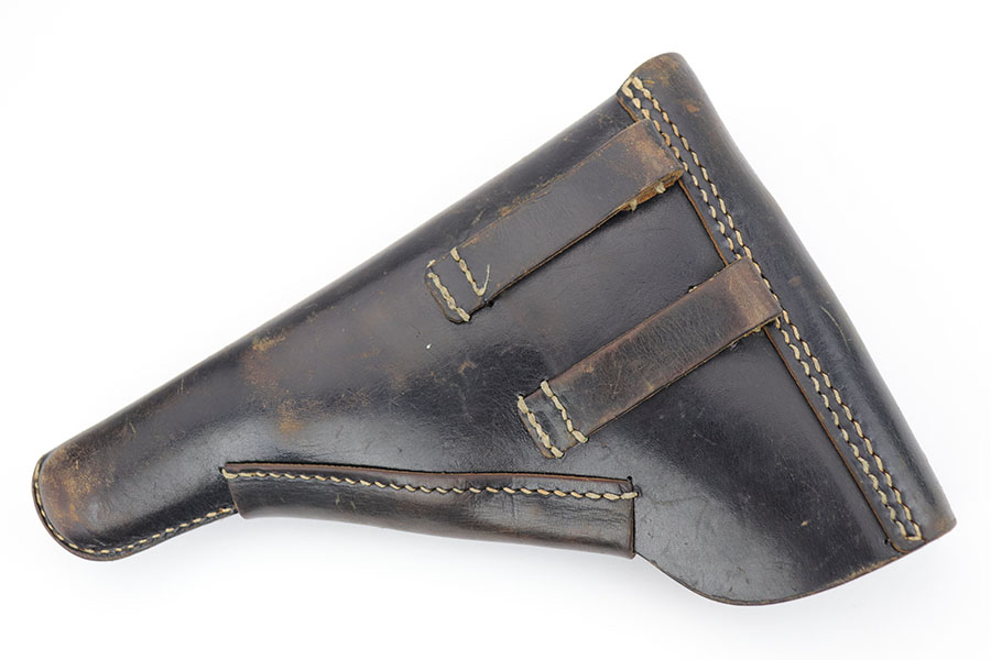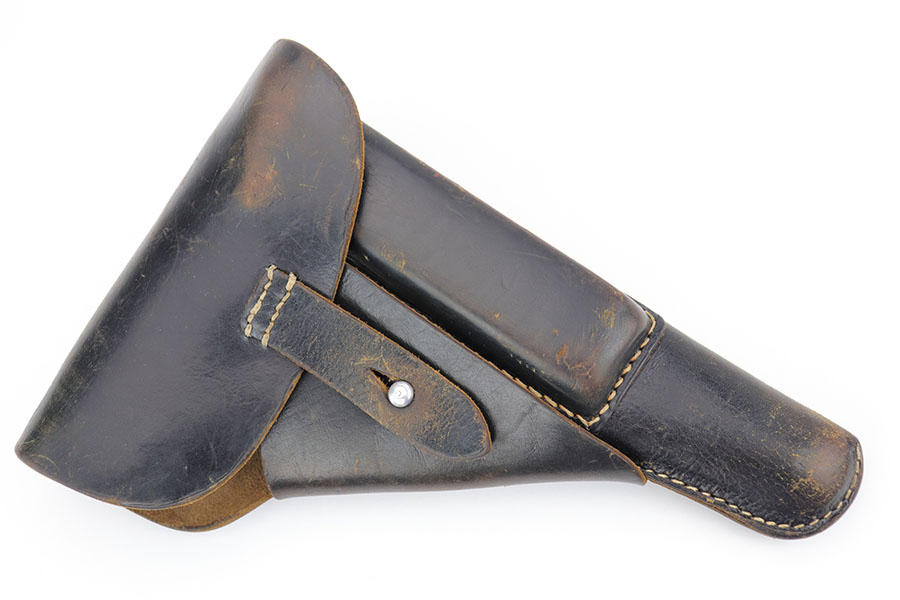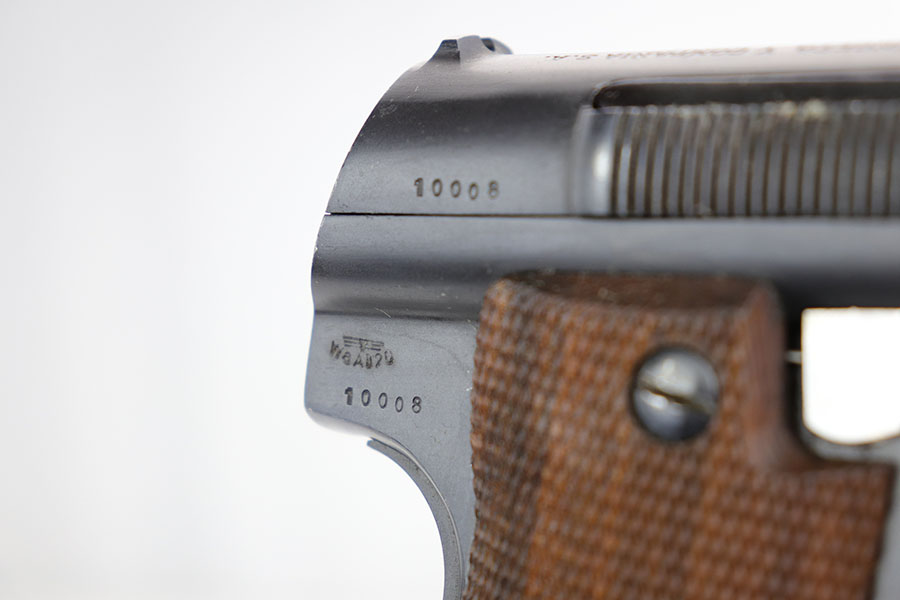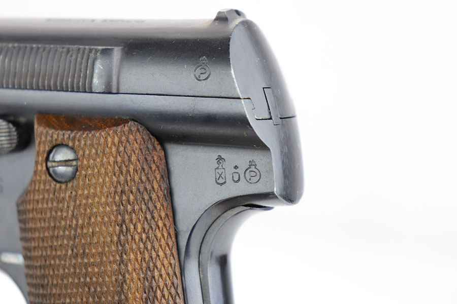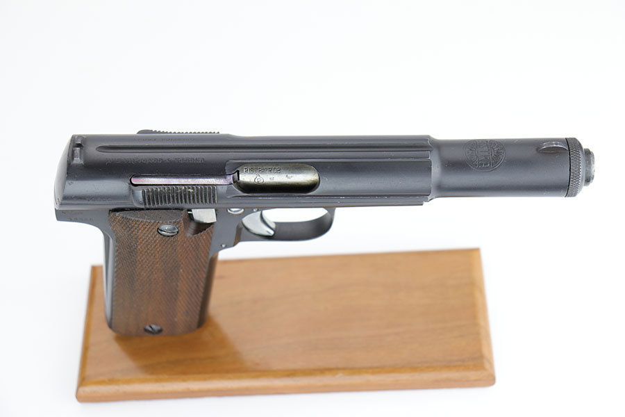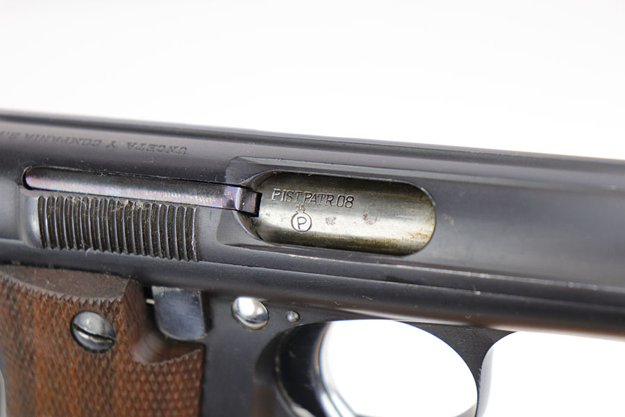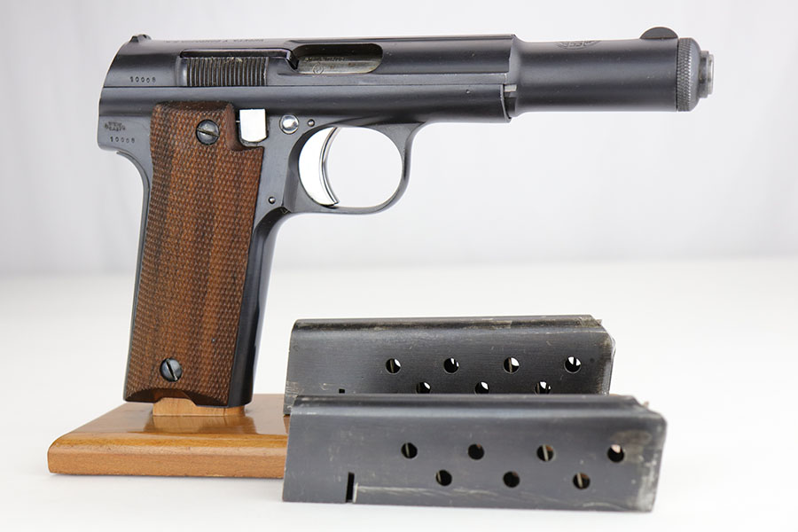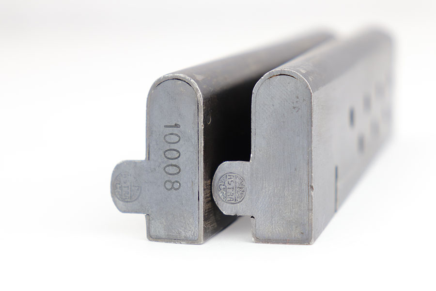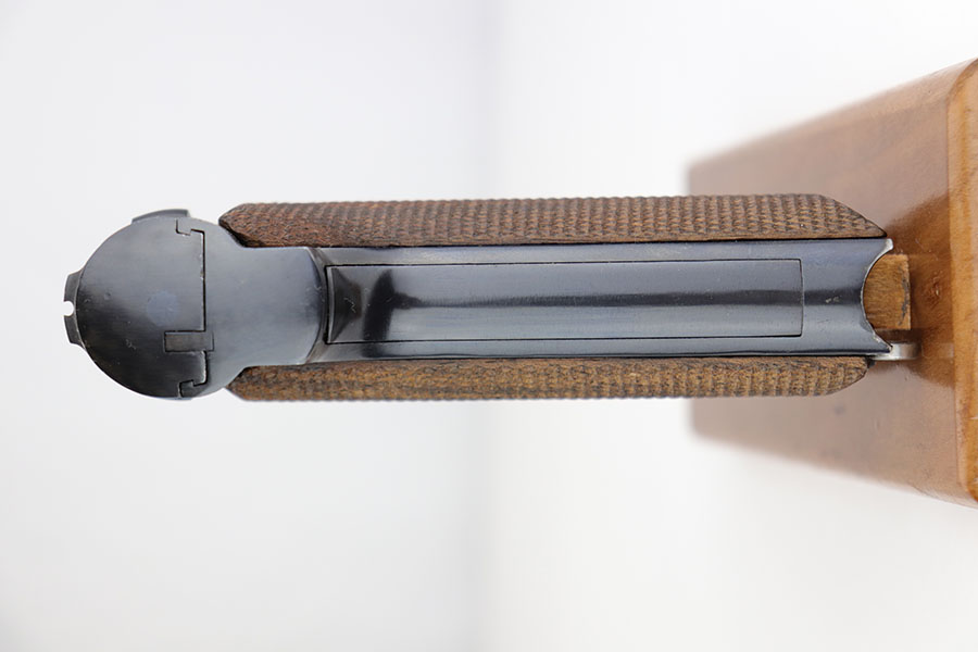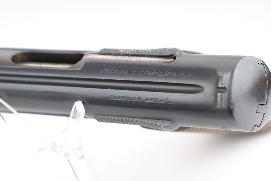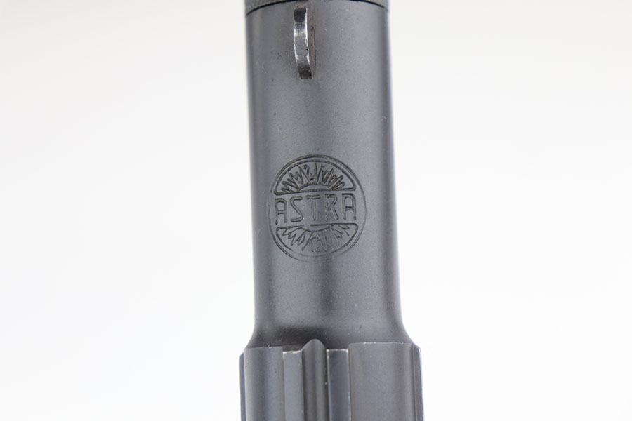 1/10/19 – This is a WW2 era production Spanish Astra 600 made during nazi occupation. The pistol comes with two magazines and a waffen proofed, 1944 dated holster. One of the magazines is matching numbered to the pistol, but this is not a factory number. The pistol is beautiful with very little to no wear. Near mint condition! The small parts (trigger, safety lever) appear polished and are very shiny. This gives us pause about the overall condition of the pistol, as the bluing is almost too good to be true. The bore is similar to the condition of the exterior of the pistol – very clean with only minor traces of use. The wood grips are very sharp as well, another indicator that perhaps the finish is real. Please see photos and decide for yourself!