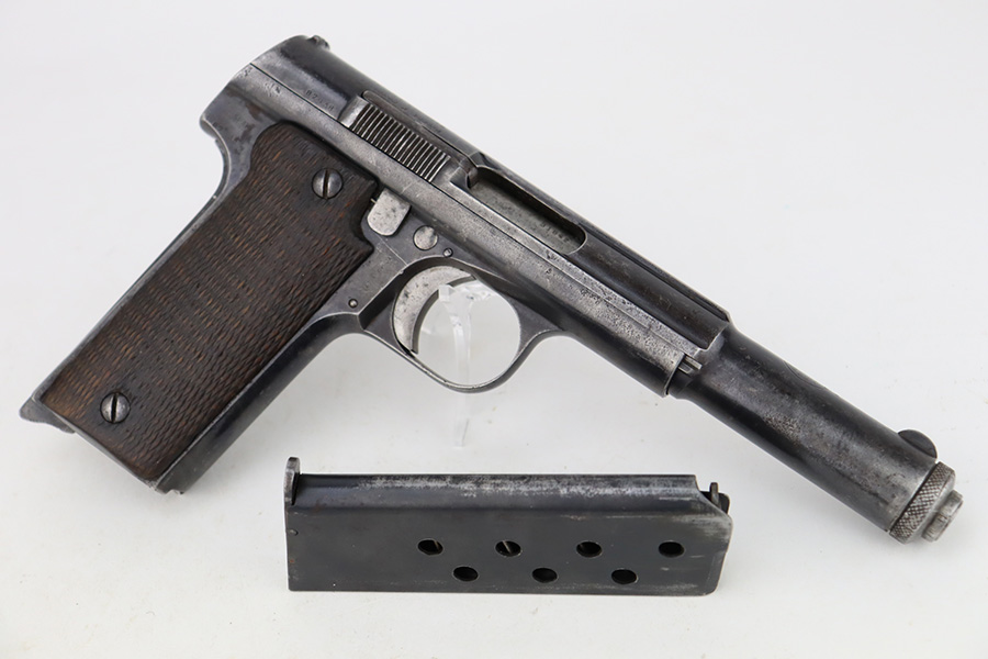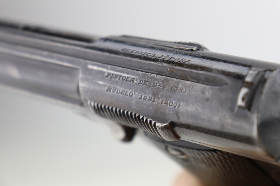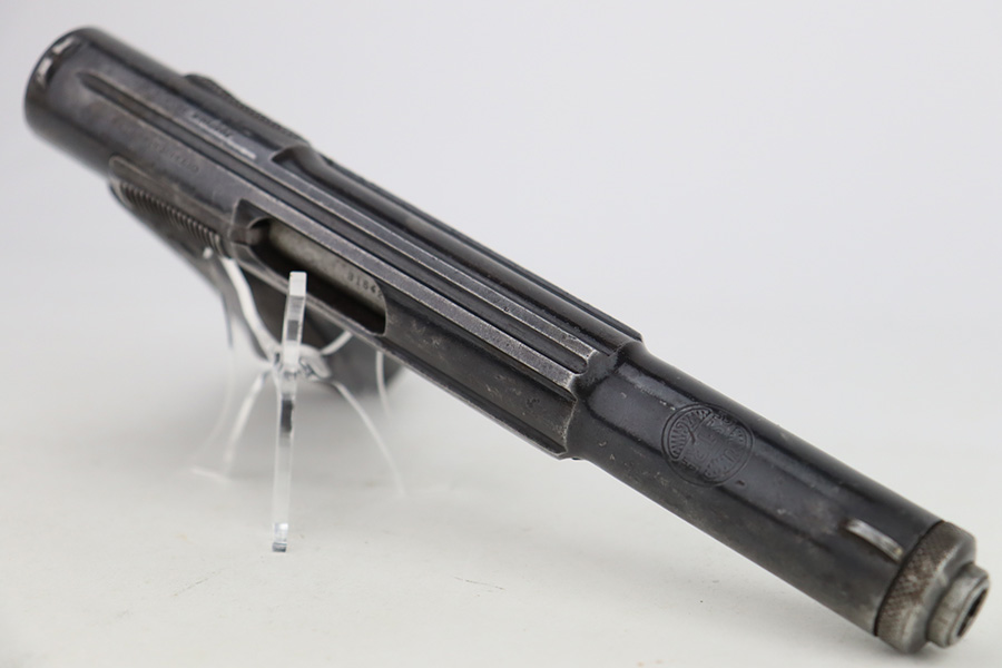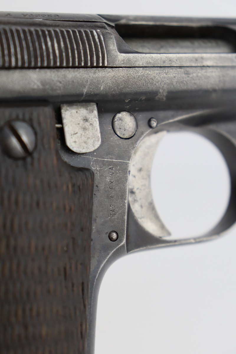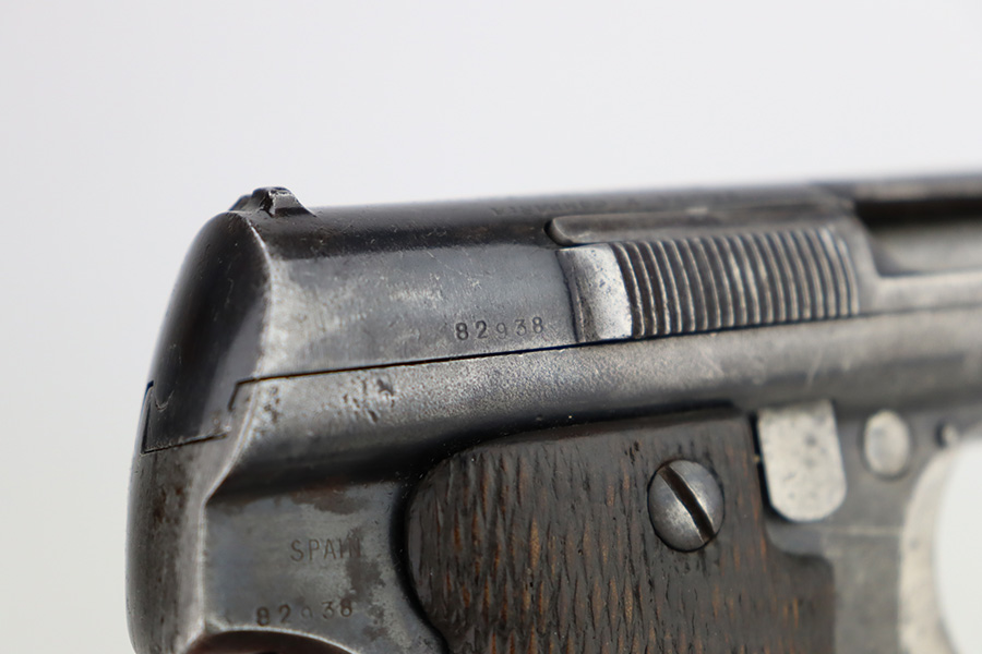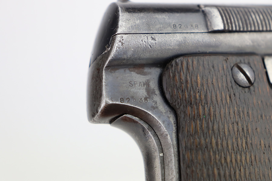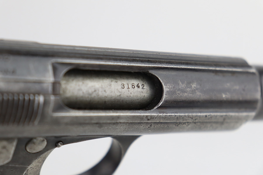 2/5/24 – This is an Astra Model 400/1921 likely manufactured in the 1930’s. This Model was adopted for use by the Spanish Army and was the standard sidearm during the Spanish Civil War and saw service in Germany during WWII. This one has a matching slide and frame but a mismatched barrel. Import mark on the right side of the frame. The finish rates roughly 50% with obvious finish loss throughout and some areas of pitting here and there (most noticeable on the barrel and around the high edges of the frame). Fitted with fairly worn matching-numbered wood grips. Comes with one proper magazine. The rifling in the bore is pretty worn with pitting in the grooves.