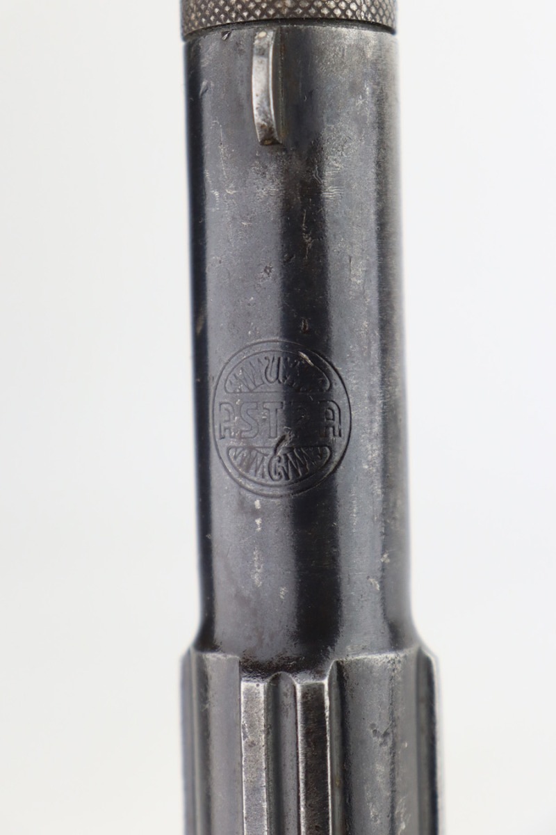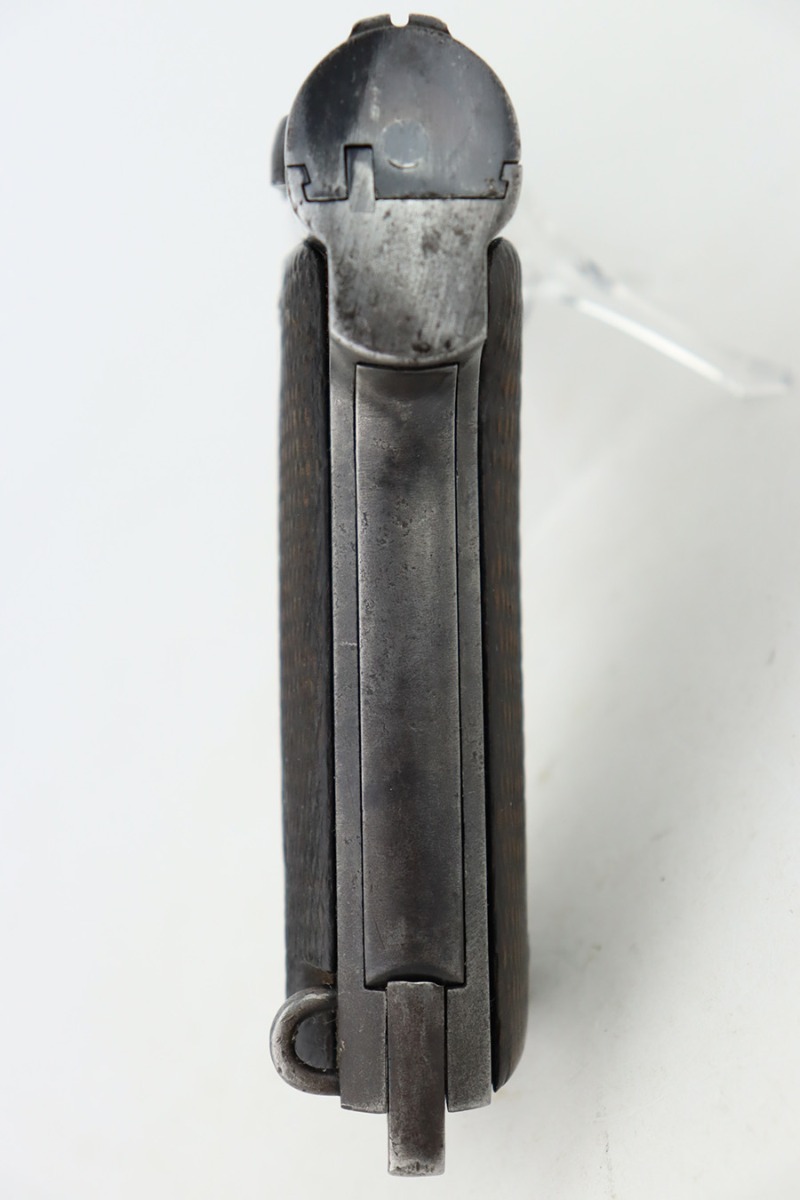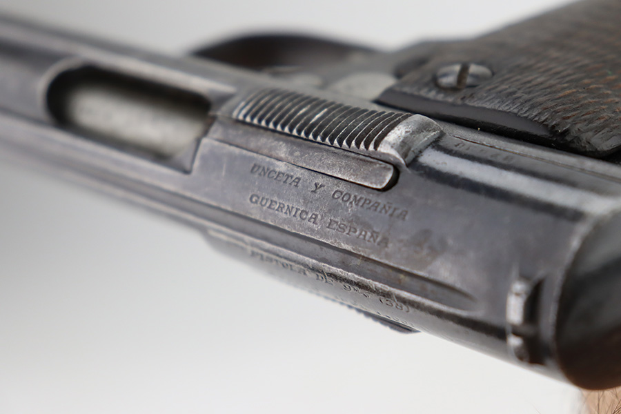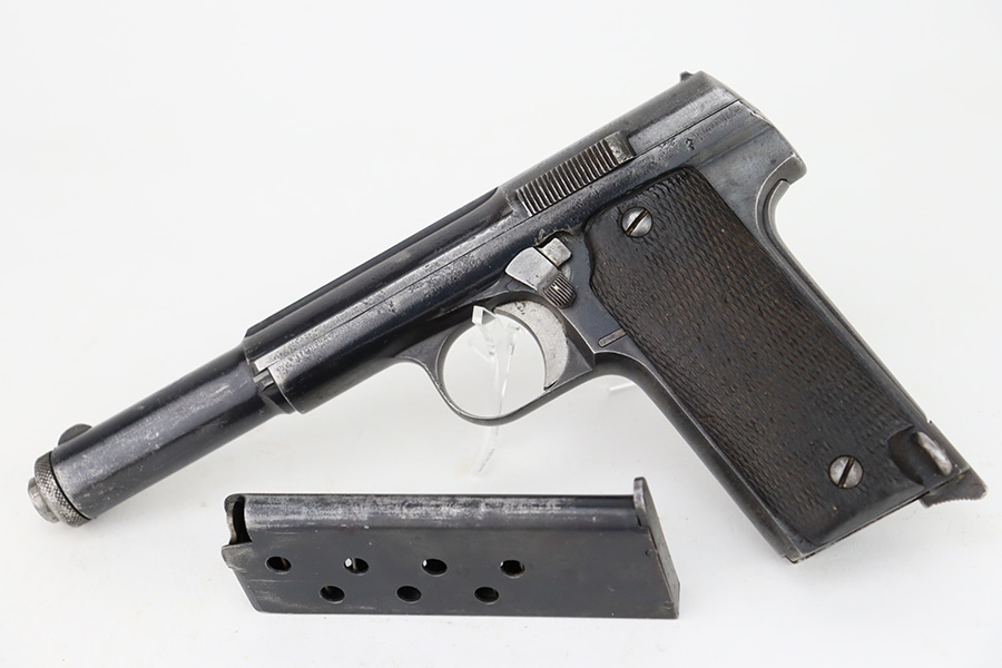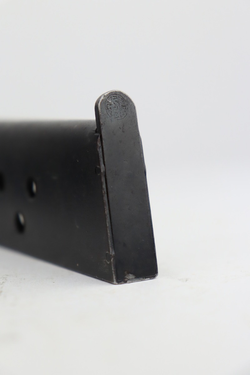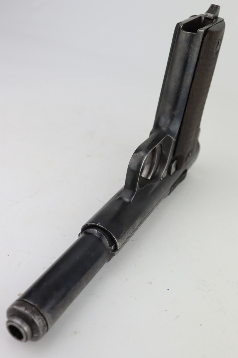 2/5/24 – This is an Astra Model 400/1921 likely manufactured in the 1930’s. This Model was adopted for use by the Spanish Army and was the standard sidearm during the Spanish Civil War and saw service in Germany during WWII. This one has a matching slide and frame but a mismatched barrel. Import mark on the right side of the frame. The finish rates roughly 50% with obvious finish loss throughout and some areas of pitting here and there (most noticeable on the barrel and around the high edges of the frame). Fitted with fairly worn matching-numbered wood grips. Comes with one proper magazine. The rifling in the bore is pretty worn with pitting in the grooves.