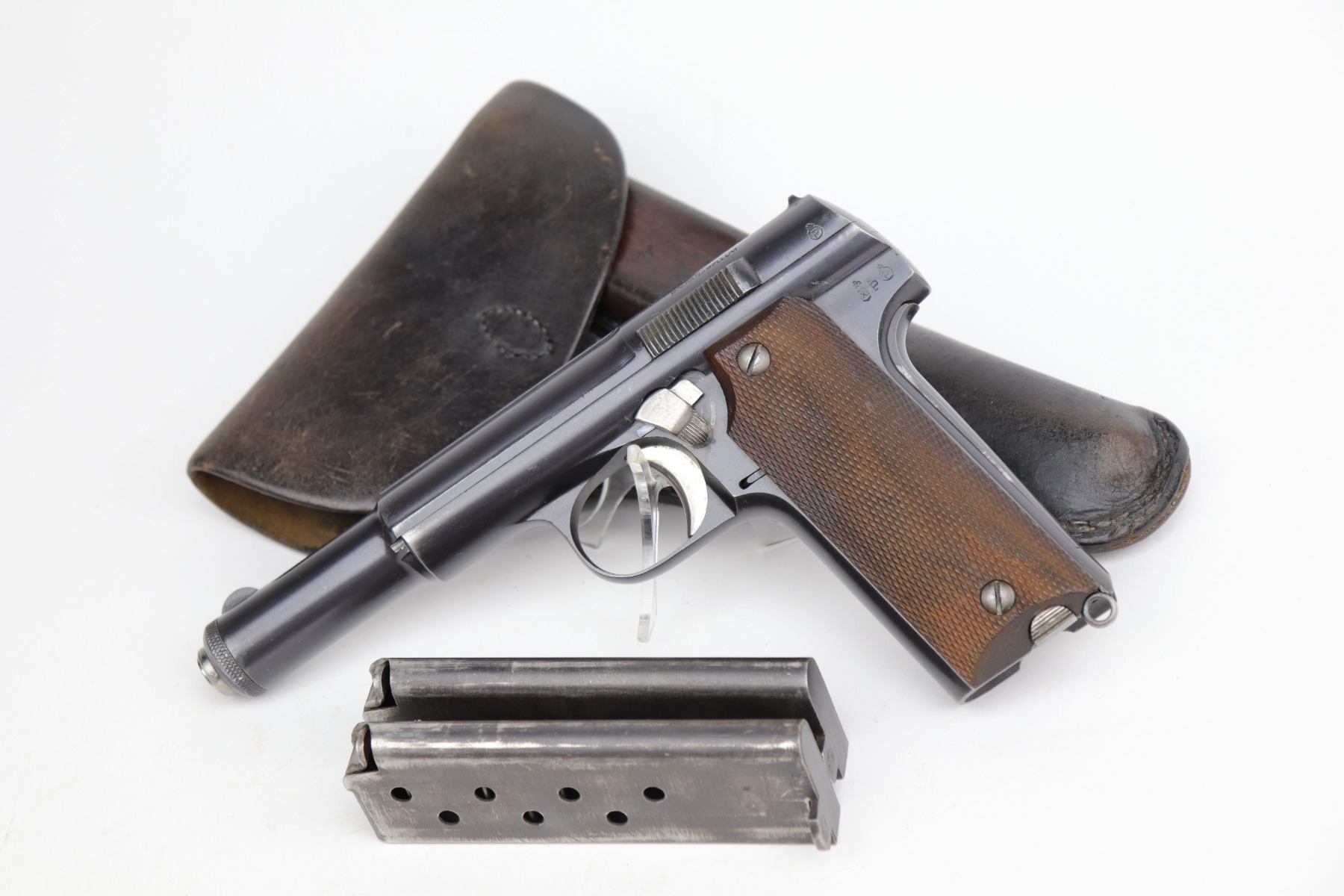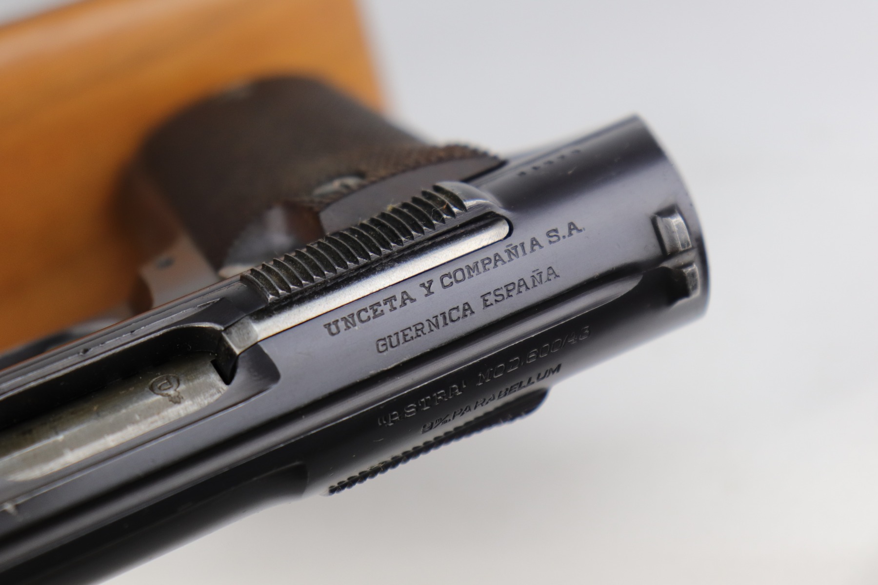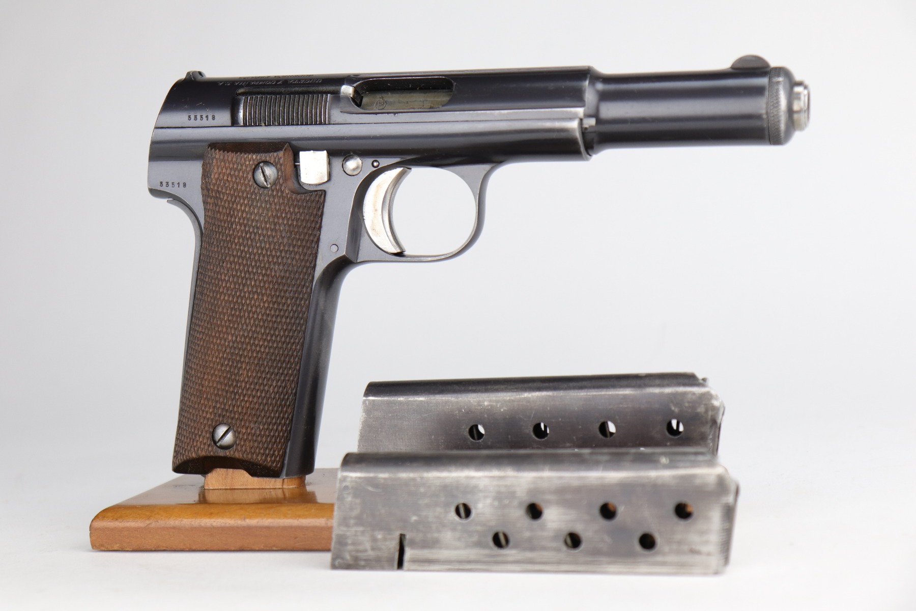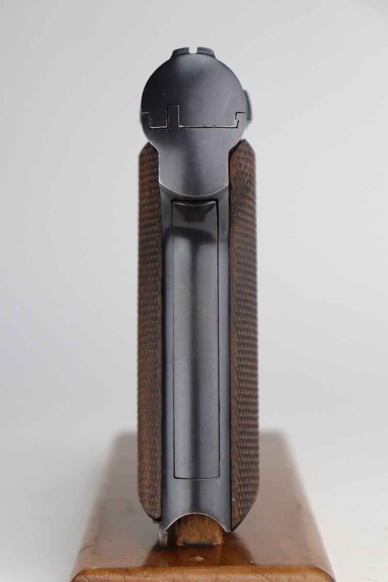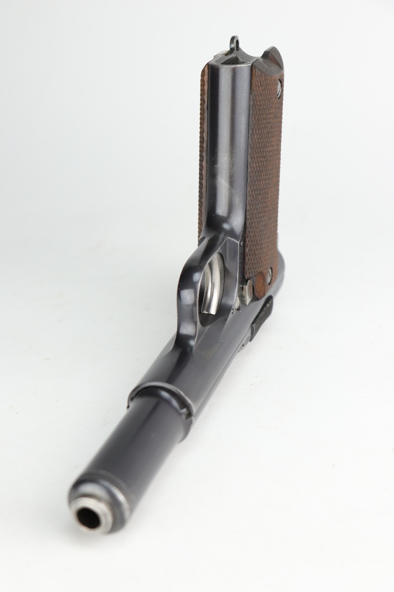 11/20/20 – This is a very nice example of a complete Astra Model 600/43 Rig. It comes with an original holster and two magazines. The gun is all matching and has retained about 92-93% of its original bluing. There is minor wear on the straps and on some of the high edges. It is fully functional and chambered in 9mm. The bore is excellent – shiny with strong rifling.