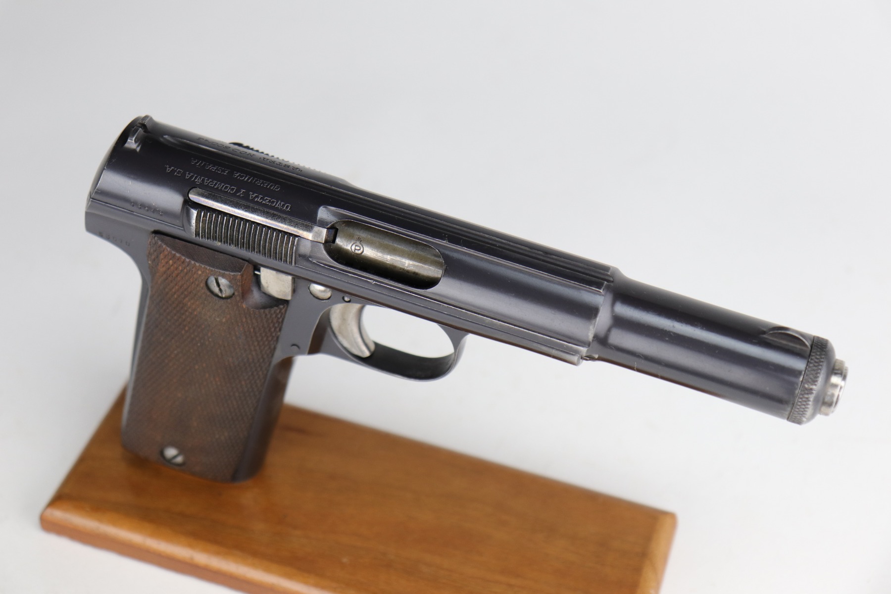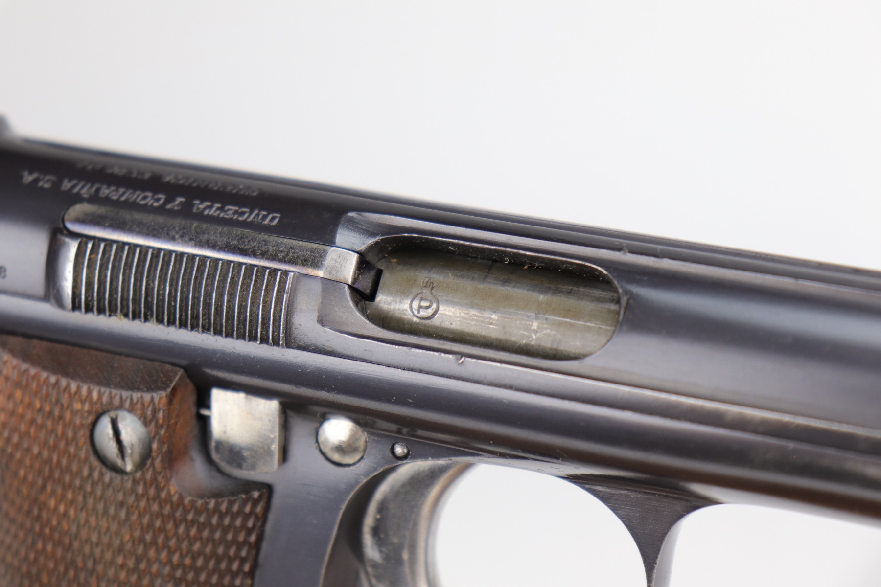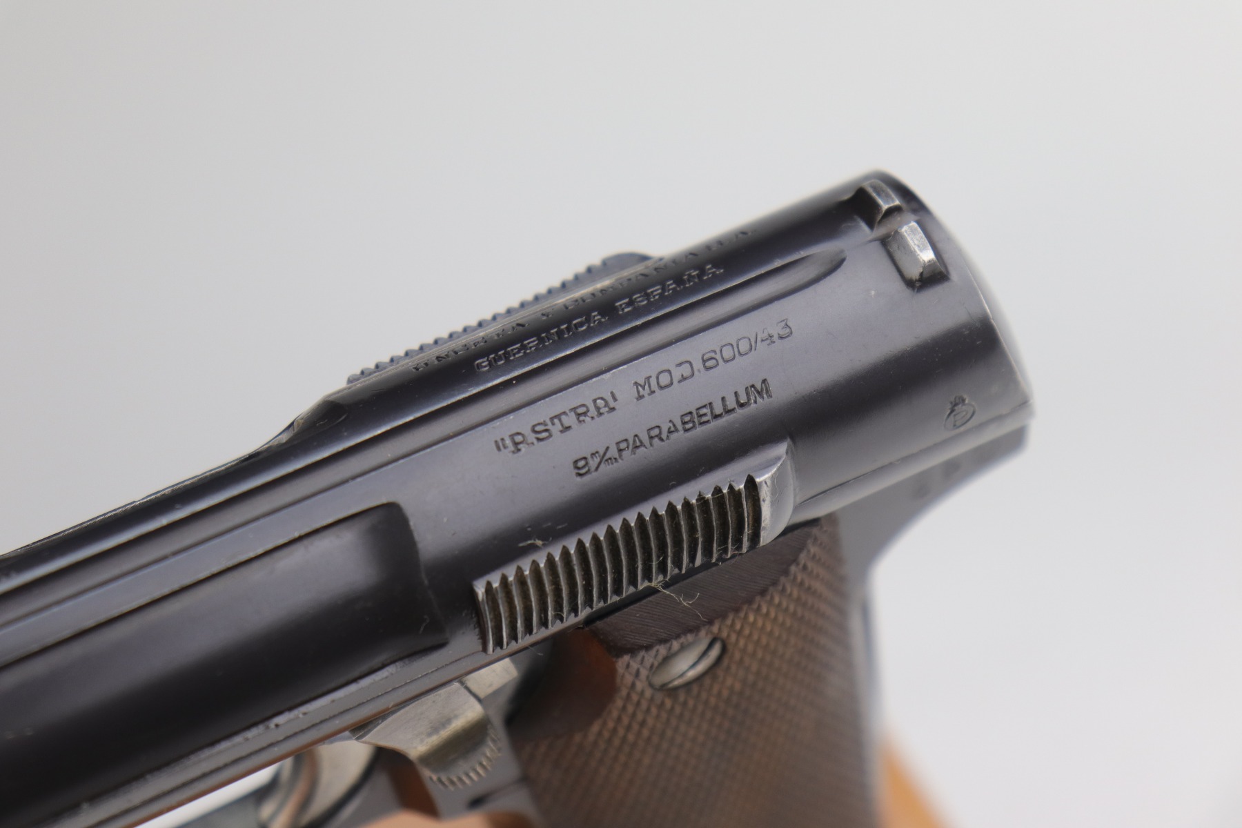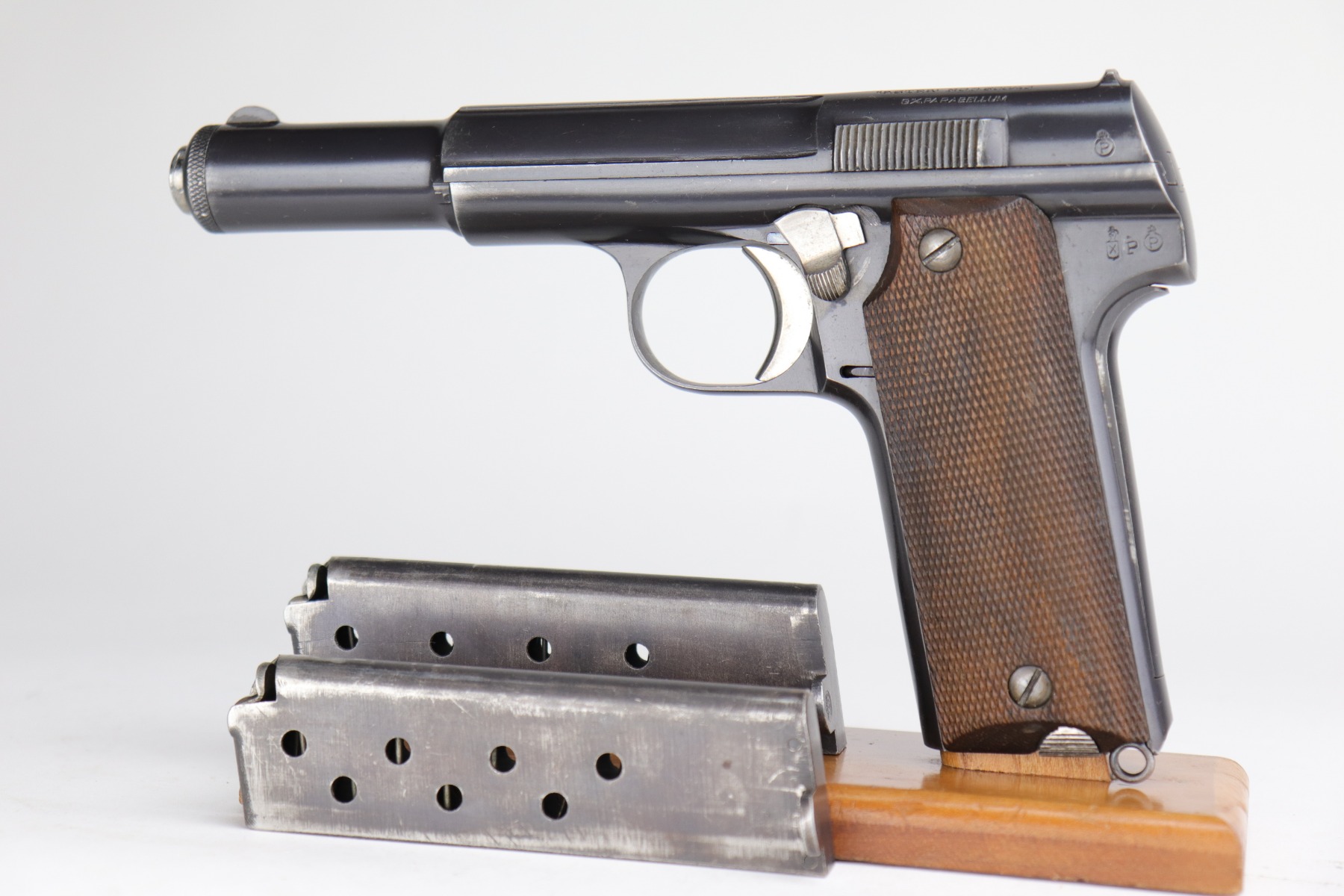 11/20/20 – This is a very nice example of a complete Astra Model 600/43 Rig. It comes with an original holster and two magazines. The gun is all matching and has retained about 92-93% of its original bluing. There is minor wear on the straps and on some of the high edges. It is fully functional and chambered in 9mm. The bore is excellent – shiny with strong rifling.