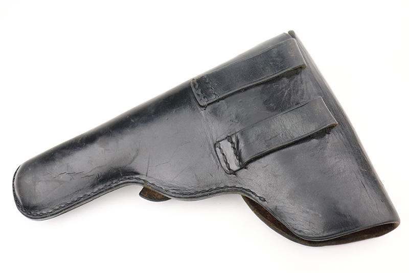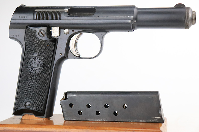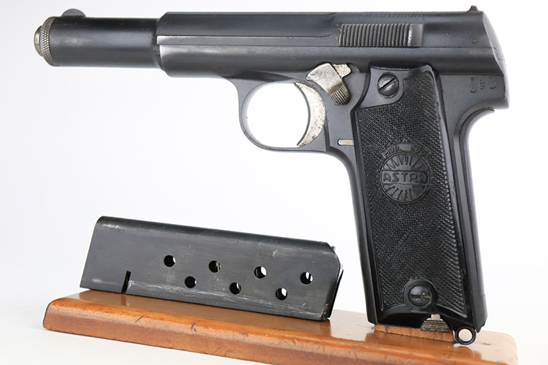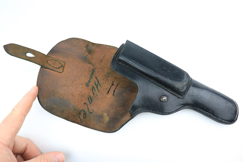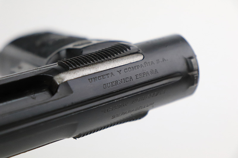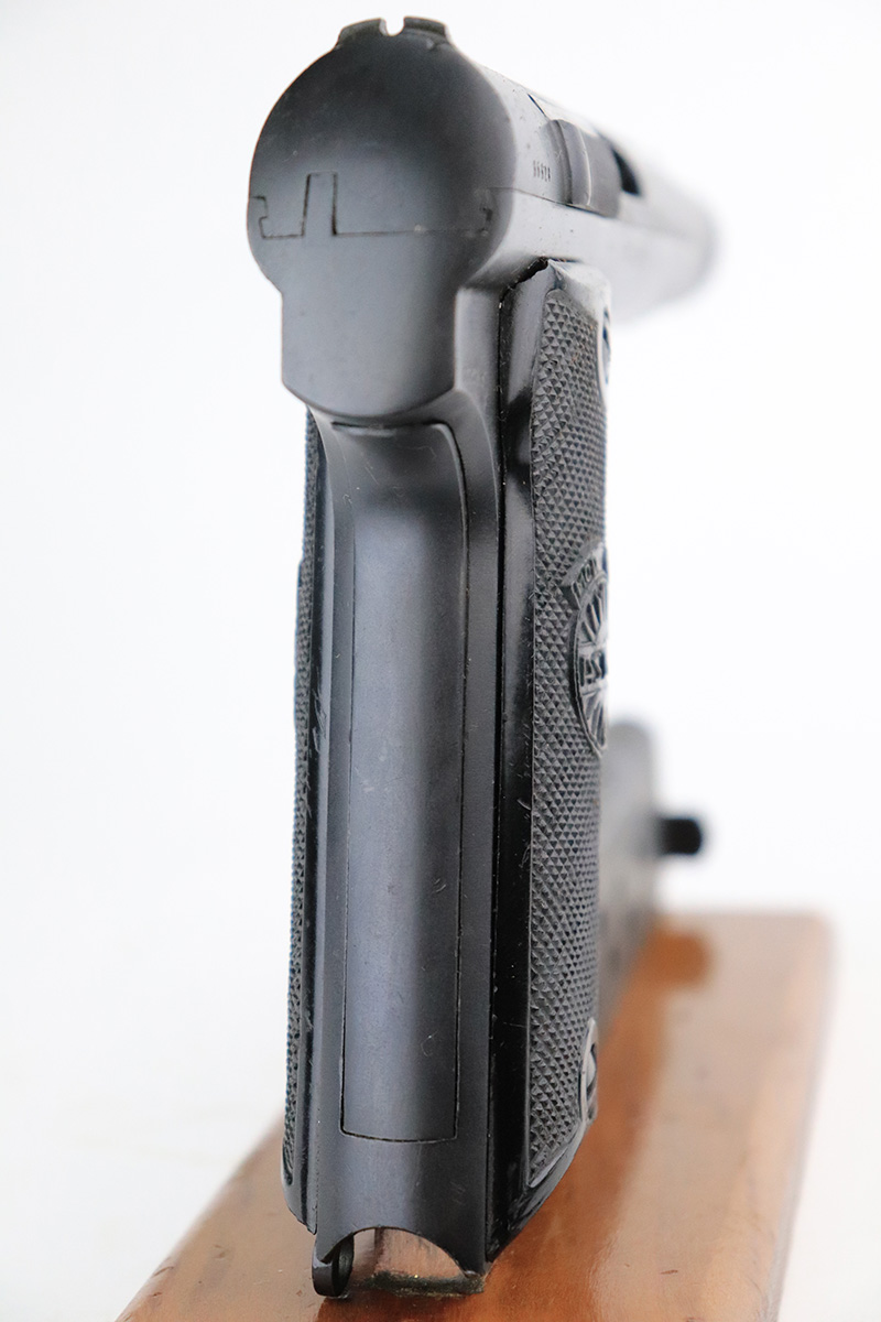 8/25/22 – This is an excellent example of an Astra 600. From the “Star P” date code, this gun was made immediate after WW2, in 1945. It is all matching and has the proper Spanish proofs. It comes as a rig with a very nice period-correct black leather holster and two proper magazines. It has retained about 98% of its finish with minor wear on the front edges of the frame. There are some small dings on both sides of the slide. There are areas of very light pin-pricking / dulling in the finish throughout – most noticeable on the grip straps. Comes with nice black plastic grips. Excellent bore with strong rifling.