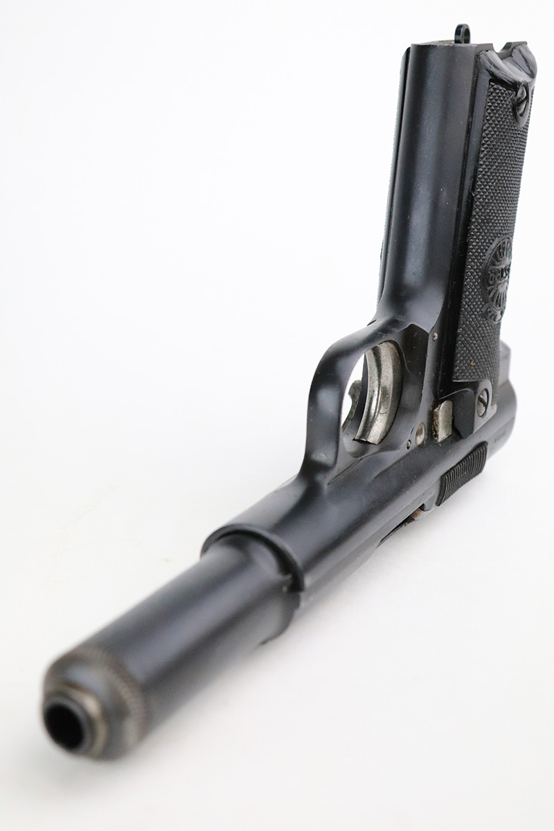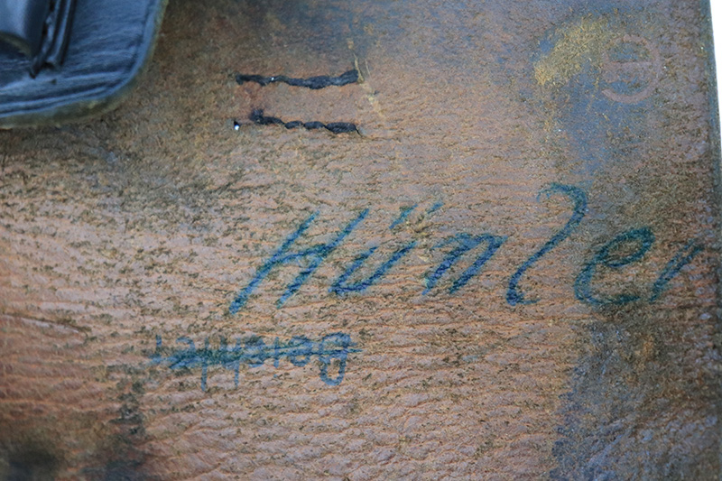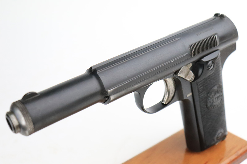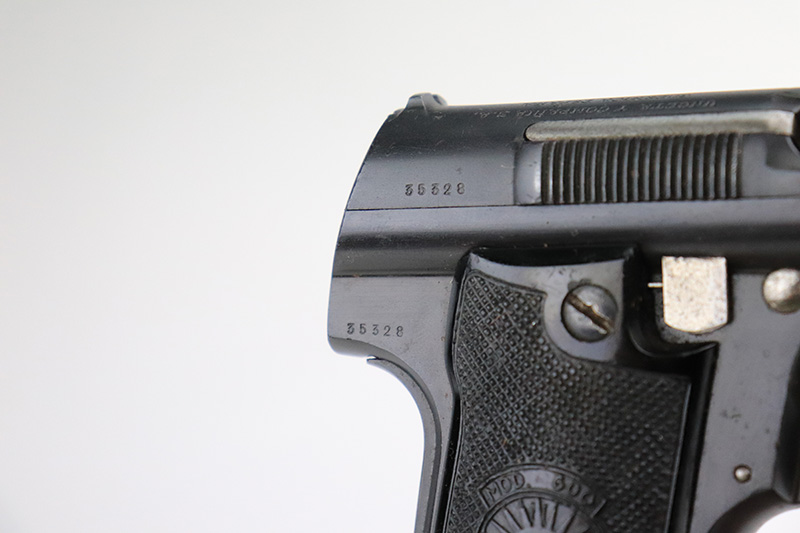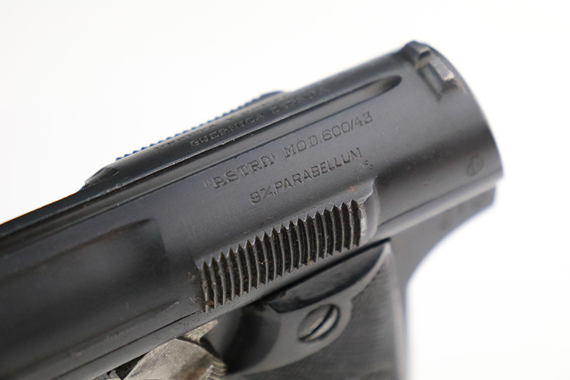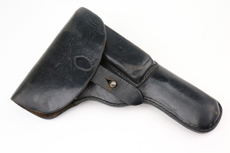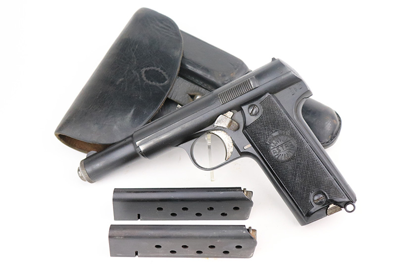8/25/22 – This is an excellent example of an Astra 600. From the “Star P” date code, this gun was made immediate after WW2, in 1945. It is all matching and has the proper Spanish proofs. It comes as a rig with a very nice period-correct black leather holster and two proper magazines. It has retained about 98% of its finish with minor wear on the front edges of the frame. There are some small dings on both sides of the slide. There are areas of very light pin-pricking / dulling in the finish throughout – most noticeable on the grip straps. Comes with nice black plastic grips. Excellent bore with strong rifling.