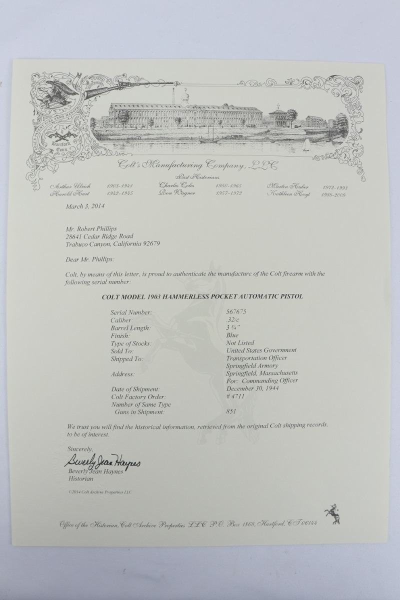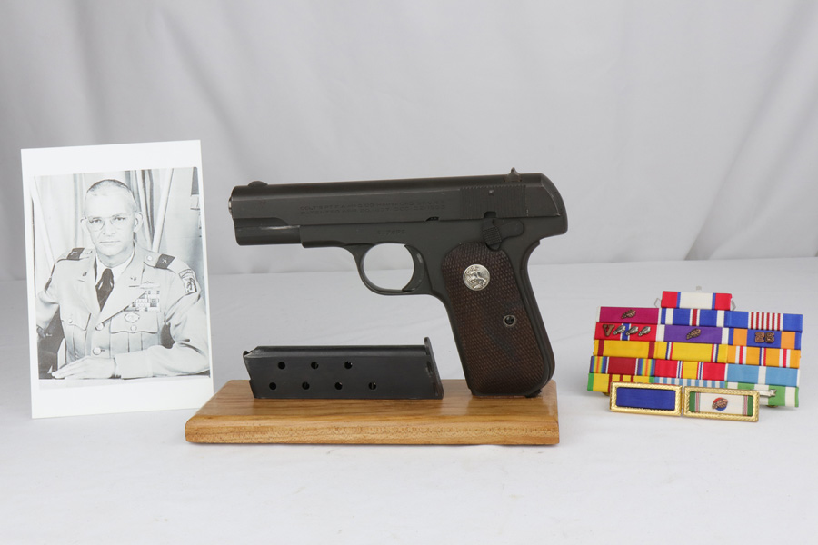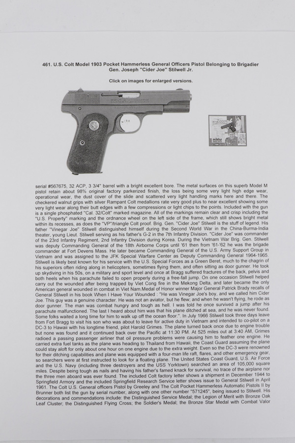 12/7/18 – This is a near-mint US Property Colt M1903 that was issued to the legendary Brigadier General, Joseph “Cider Joe” Stilwell Jr. Made in 1942, this pistol retains 98-99% original parkerized finish. It comes with Colt factory letter stating it was issued to Stilwell and shipped in 1944, and a Springfield Research Service letter shows issue to Stilwell in 1961. It has minor high edge wear and some handling wear, but is otherwise beautiful. Brigadier General Stilwell is best known for his service with the US Special Forces as a Green Beret, often sitting as door gunner or pilot of their helicopters. Medal of Honor winner, Major General Patrick Brady, talks about Stilwell in his book. “This guy was a genuine character. He was not an aviator, but he flew…The man was combat hungry and tough as hell. I was told he once survived a jump after his parachute malfunctioned. The last I heard about him was that his plane ditched at sea, and he was never found. Some folks waited a long time for him to walk up off the ocean floor.” Stilwell’s decorations and commendations are listed in full in the accompanying description (pictured). Photos of Stilwell and a facsimile of his service and decoration medal ribbon bars are included.