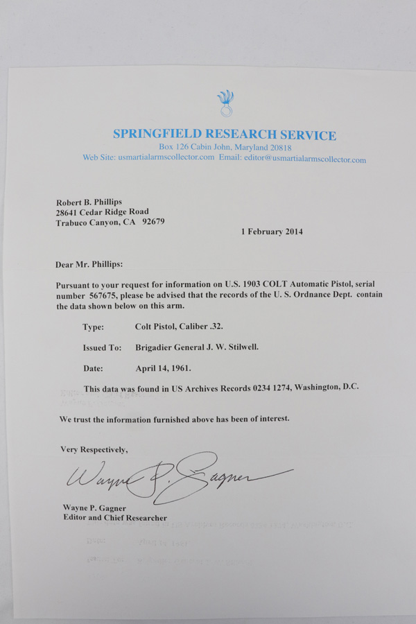 SOLD – Attributed Colt M1903 – Brig. Gen. Joseph Stilwell
