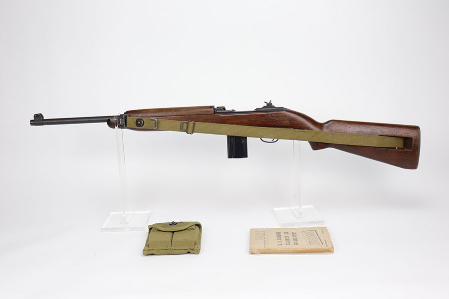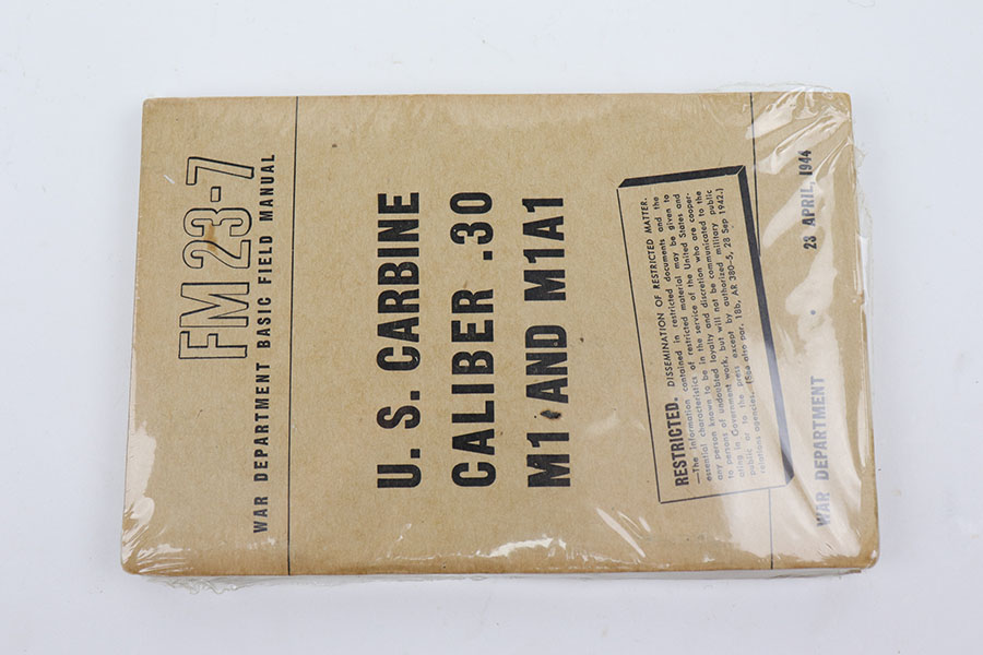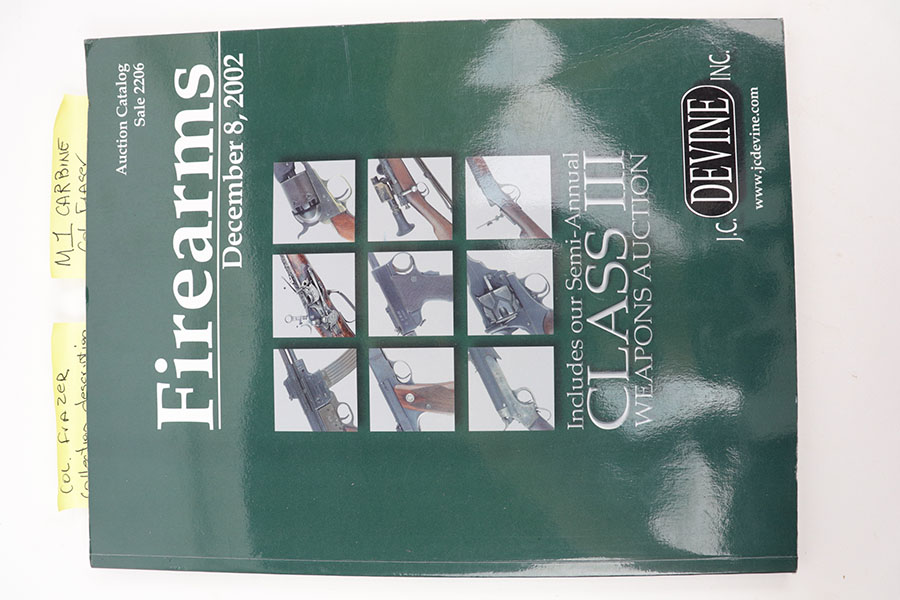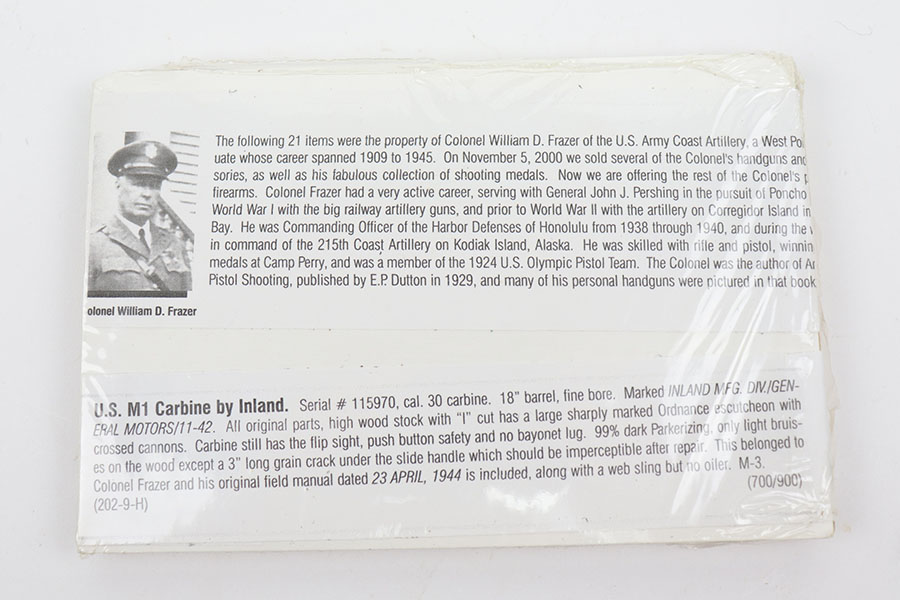 10/14/20 – This is a minty Inland M1 Carbine from 1942 that comes from the collection of Colonel William D. Frazer. Frazer was a renowned marksman, having earned the U.S. Army’s distinguished marksman badge in 1922 and going on to write a book on pistol shooting. The listing includes an original copy of his book, as well as a field manual and mag pouch with two spare magazines. The gun itself is all original and in terrific condition with Inland marked stock, handguard, barrel, trigger housing, bolt, hammer, mag release, etc. Fantastic original parkerization remains on the metal parts. The stock has sharp crossed cannons cartouche on the right side. Excellent stock with no major issues. Period original sling. Comes with a copy of a Devine auction catalog from 2002 selling the gun as attributed to Colonel Frazer.