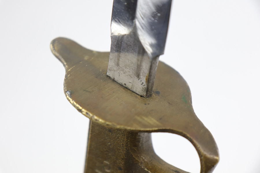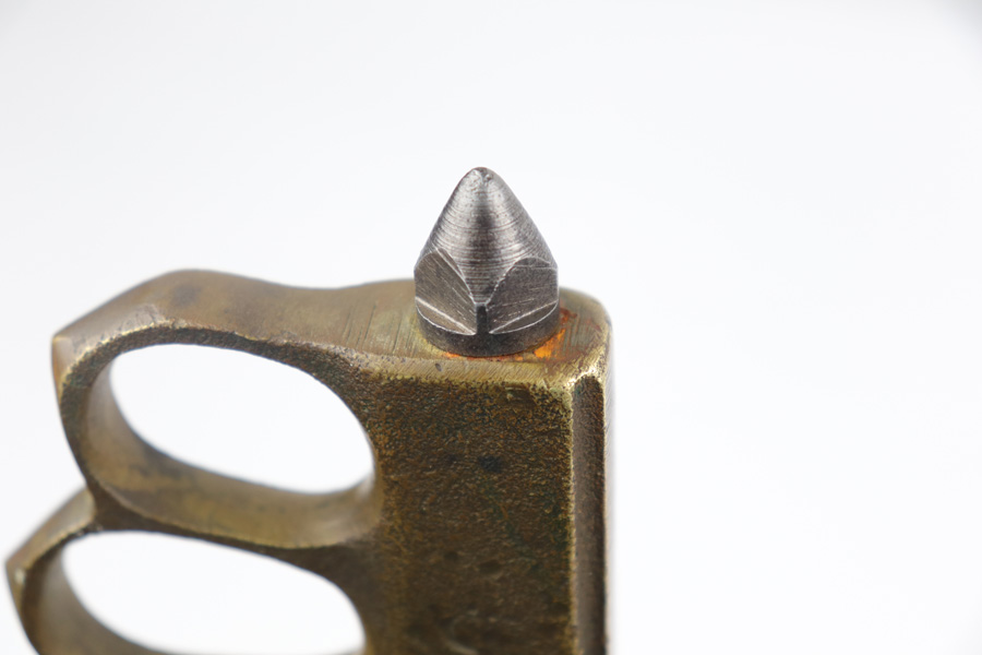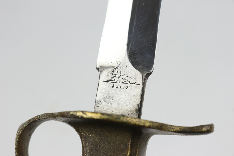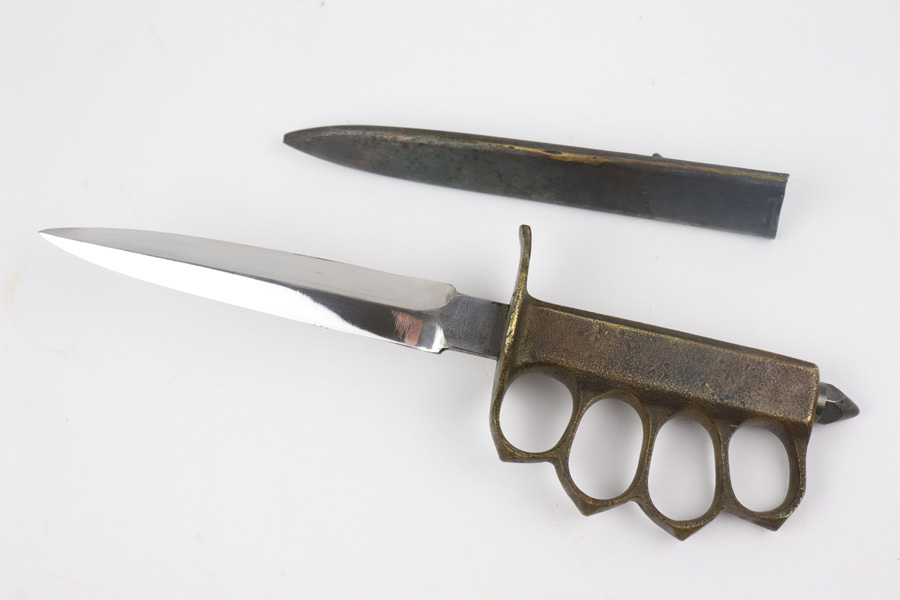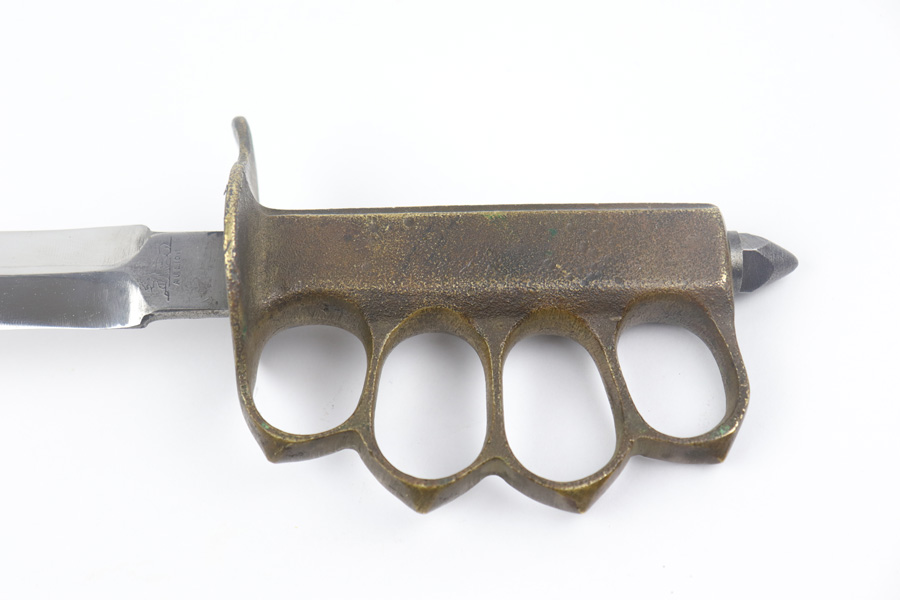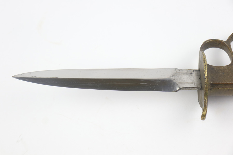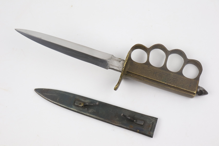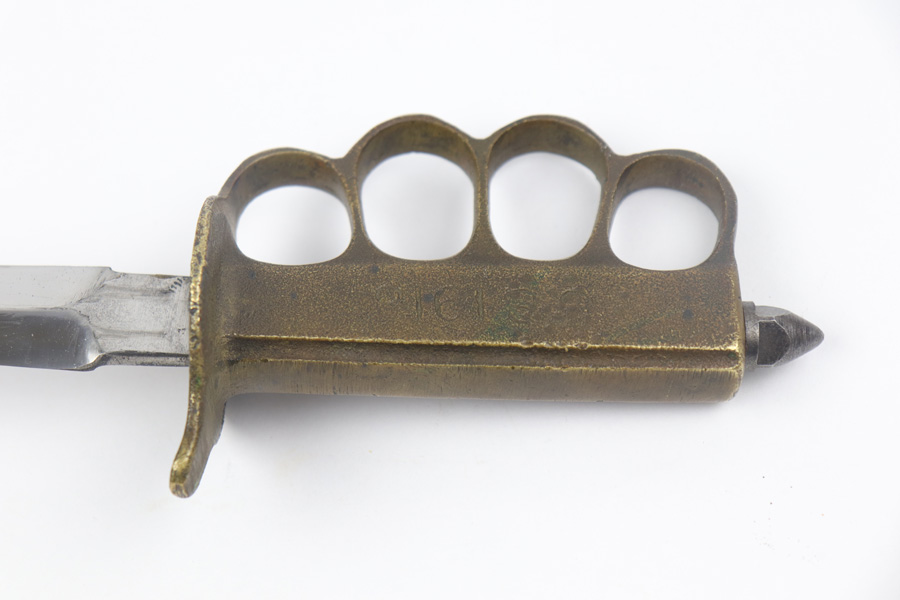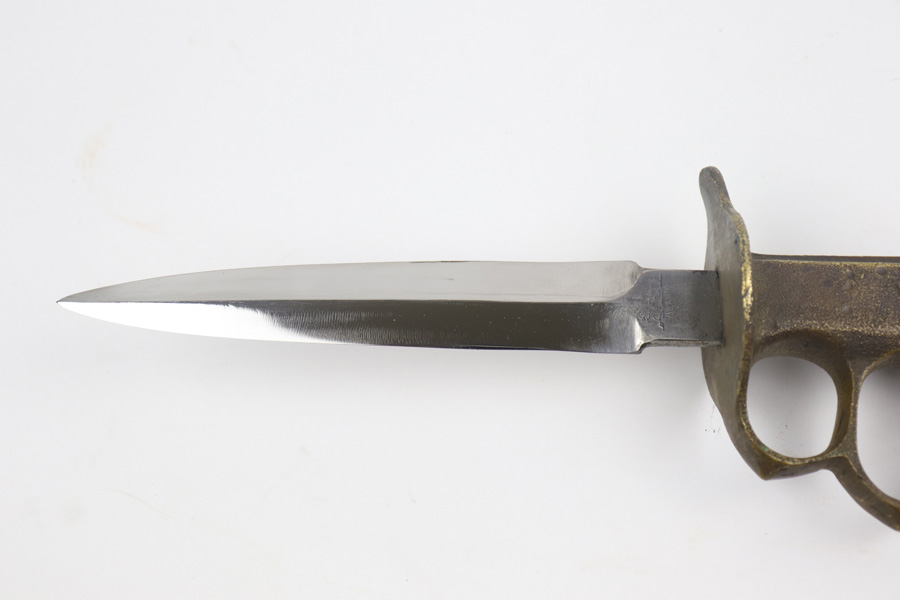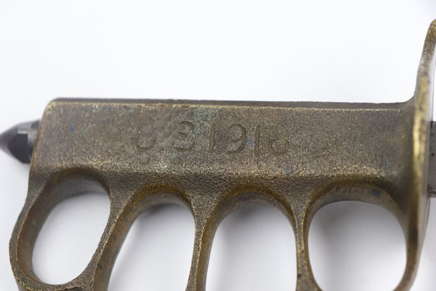 4/15/19 – This is an original French production U.S. 1918 mark 1 trench knife. These were made by Au Lion in France for the WWI war effort. These are very scarce and desirable to collectors. The blade has is very shiny, and we’ve been told this was professionally cleaned. The maker stamp on one side is clear and original. No signs of sharpening. The handle is excellent and the original scabbard (included) has both belt hooks in tact. There is some light rust and a small dent on the scabbard but overall in great shape.