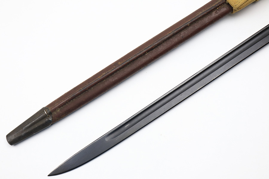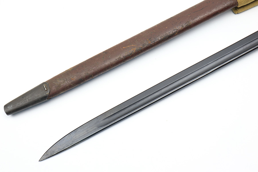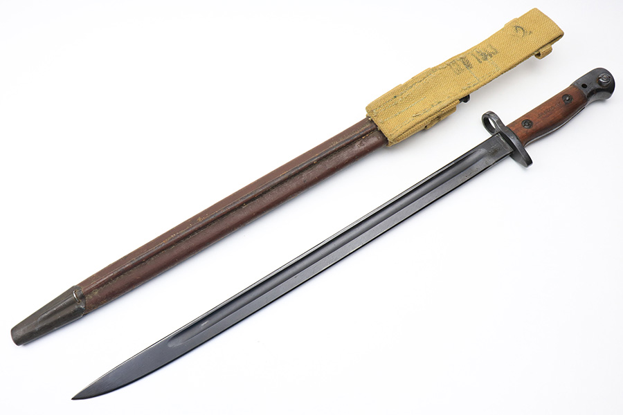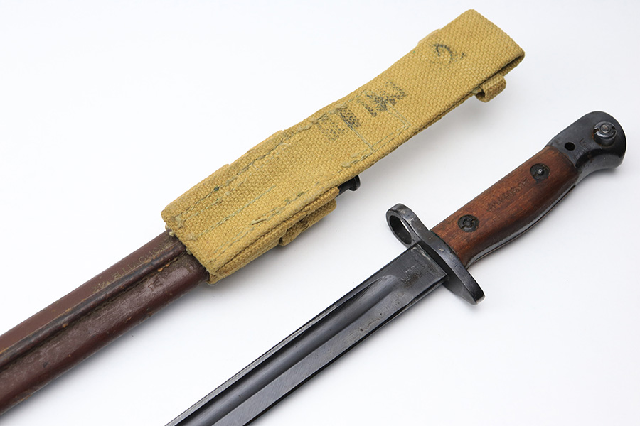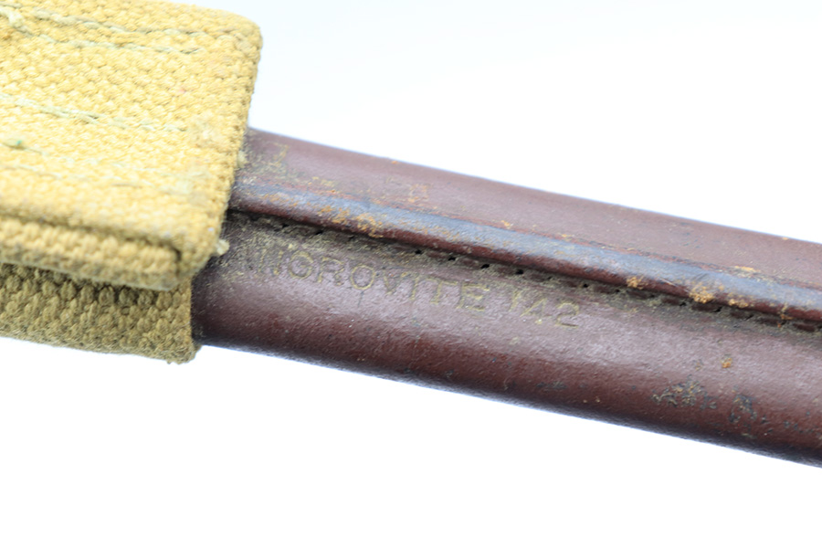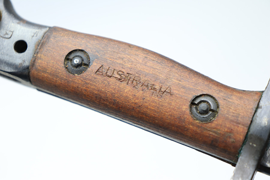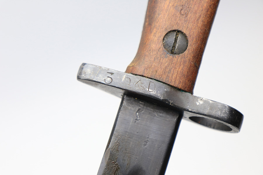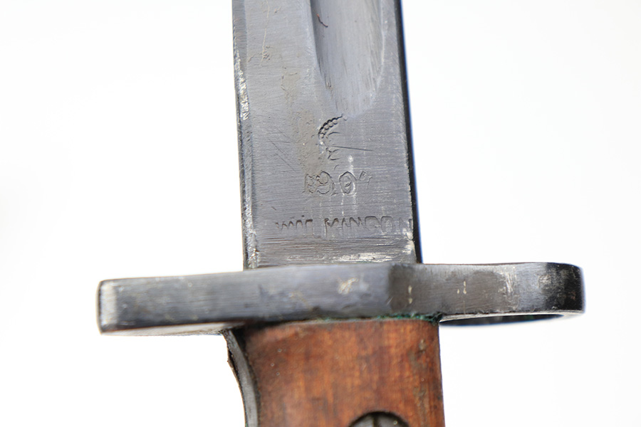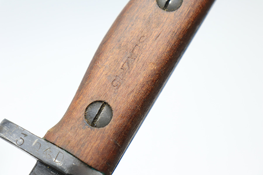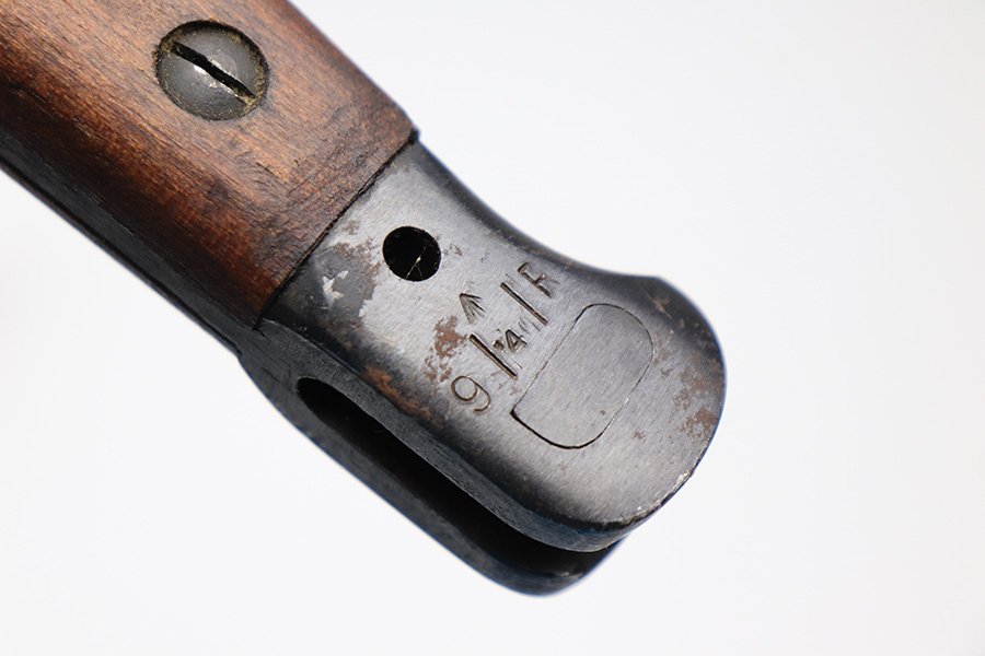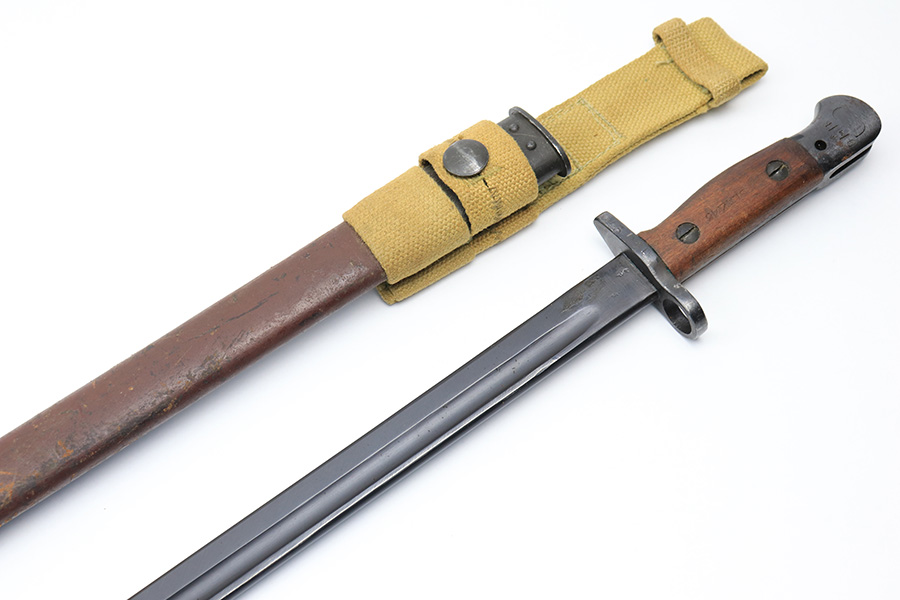 3/25/22 – This is an Australian made bayonet for an Enfield rifle. The bayonet is in excellent condition with a beautifully blued blade. The blade is maker stamped and there appears to be a faint 1907 date stamp above the maker. Likely this was refinished / repurposed after WW1. The wood handles are marked “AUSTRALIA” for export. Comes with a very nice scabbard that’s maker stamped and dated “Mangrovite ’42”. Also comes with a canvas frog as shown.