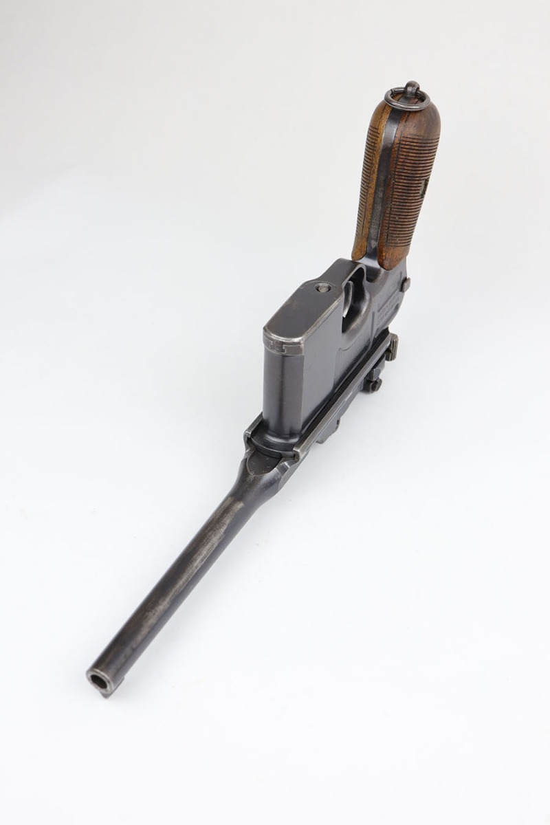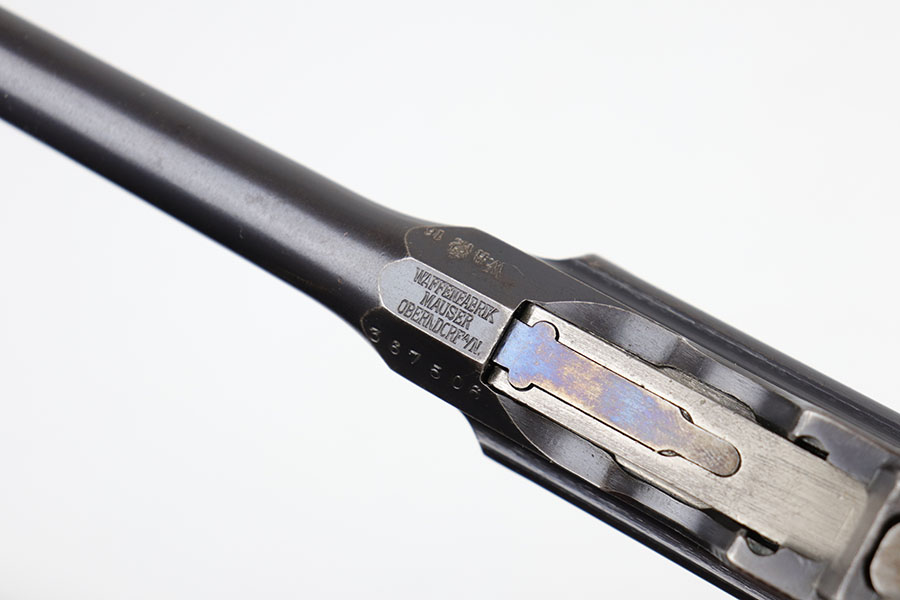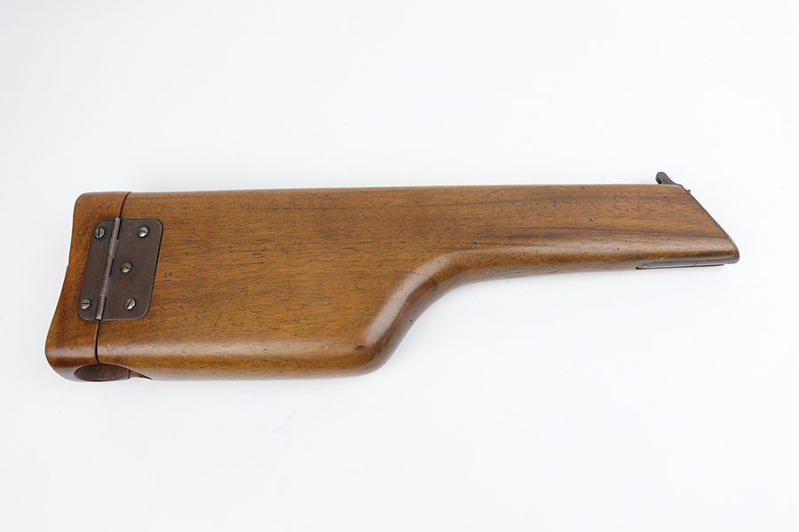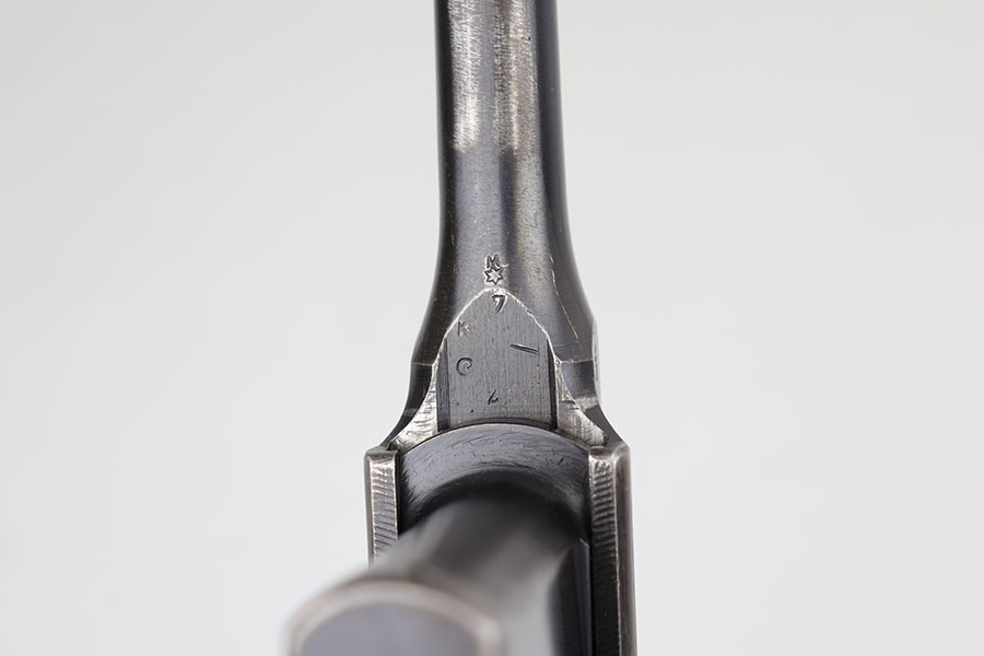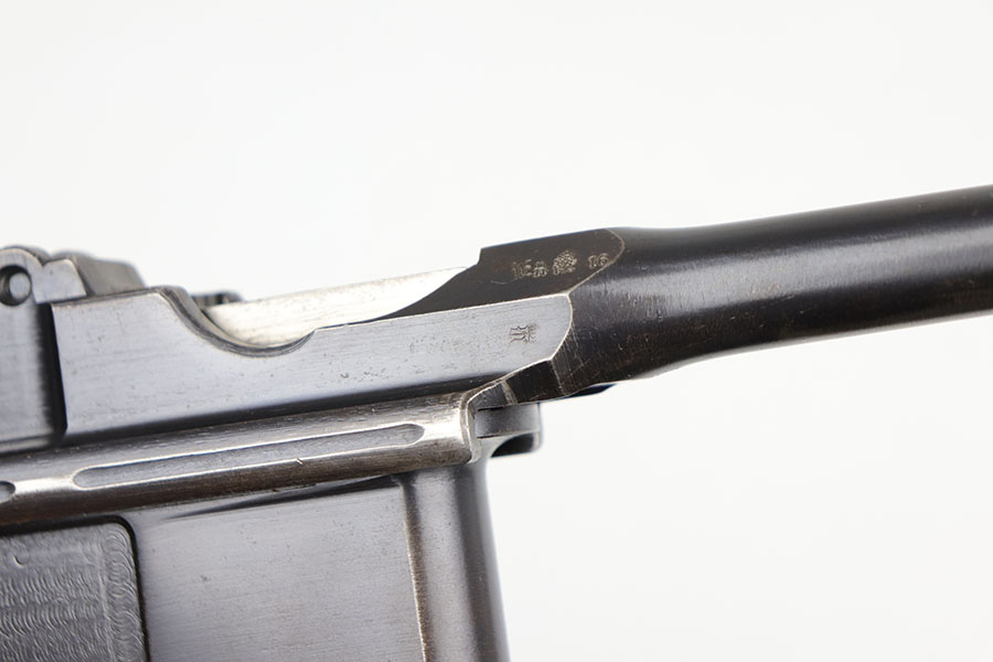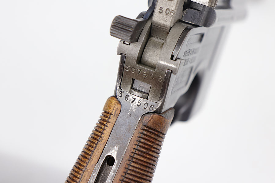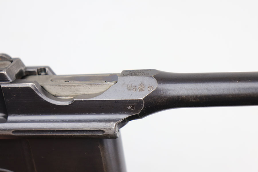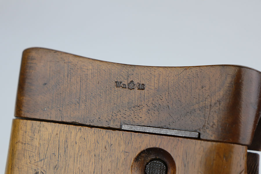 5/19/20 – This is one of the best examples of an early Mauser C96 Austrian Imperial contract rigs, made in 1916, and so marked on the chamber and the stock. This very uncommon gun retains around 94-95% of its original blue, with high edge wear and wear under the barrel from being stored in its matching shoulder stock. Austrian contract guns were taken directly from the Imperial German contract, and as a result, have a German acceptance stamp on the right chamber and on the shoulder stock. In addition, an Austrian Imperial proof, consisting of ‘W.n.’, an Imperial Eagle and the date were struck on the right diagonal flat over the chamber. Same proof was repeated on the lid of the shoulder stock. The gun is all matching and has an excellent bore and grips and generous amounts of fire blue on the small parts. Matching shoulder stock is equally nice with no cracks and an Austrian and German acceptance marks present. Just a great, all original set, that is very difficult to find in such outstanding condition.