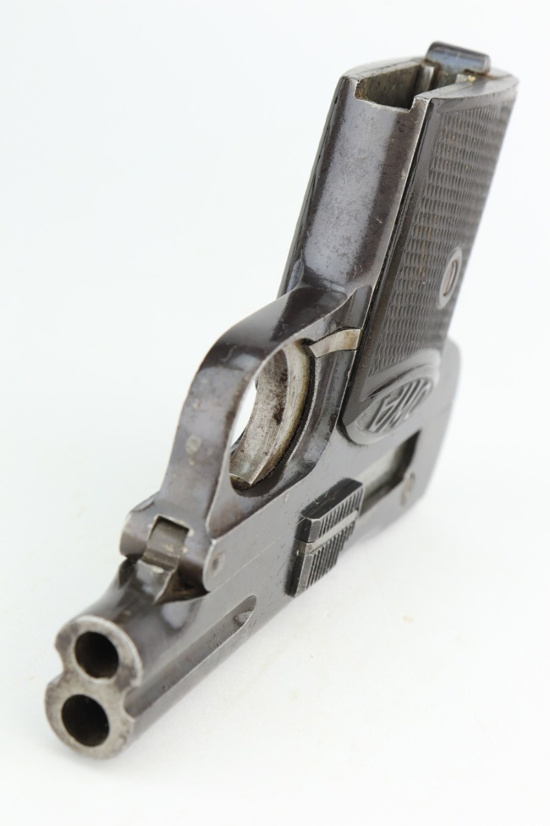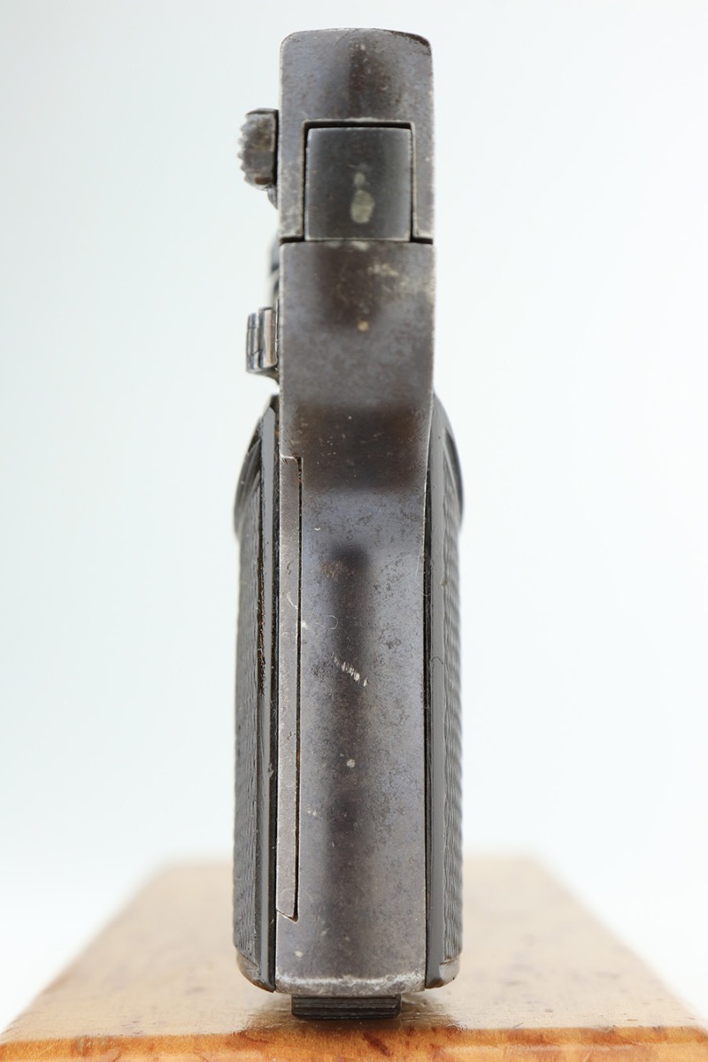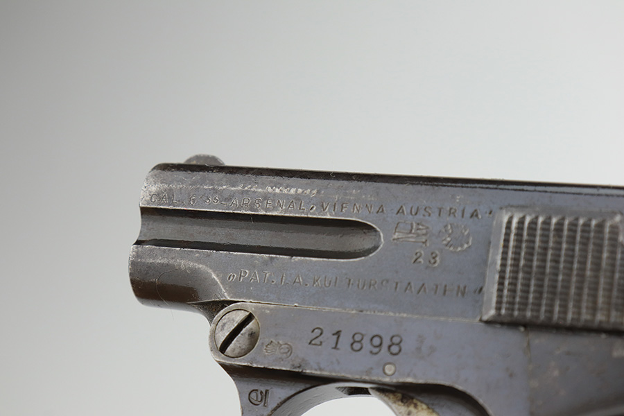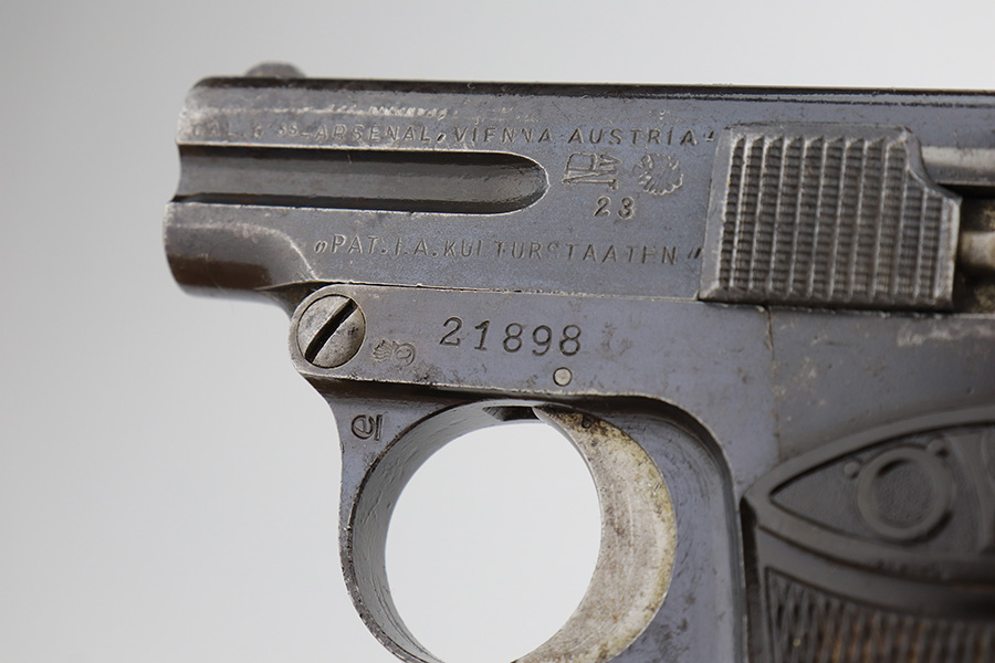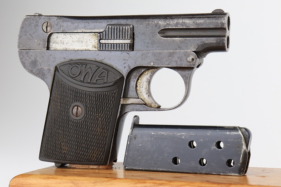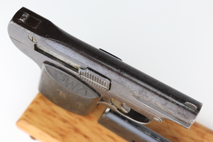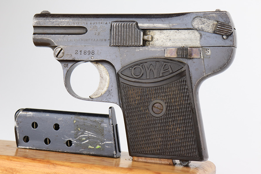 3/6/23 – This is a nice example of an Austrian OWA Vest Pocket pistol, manufactured in 1923 and chambered in 6.35mm. The gun appears to be almost entirely mismatched, but has retained about 95% of its original finish. There is just minor wear around the high edges. However, the most obvious sign of wear is the light spotty oxidation, pin-pricking, and some areas of minor pitting covering most of the gun. Fitted with proper OWA grips. Comes with one magazine. The condition of the bore is very poor – there is virtually no rifling left with heavy pitting throughout.