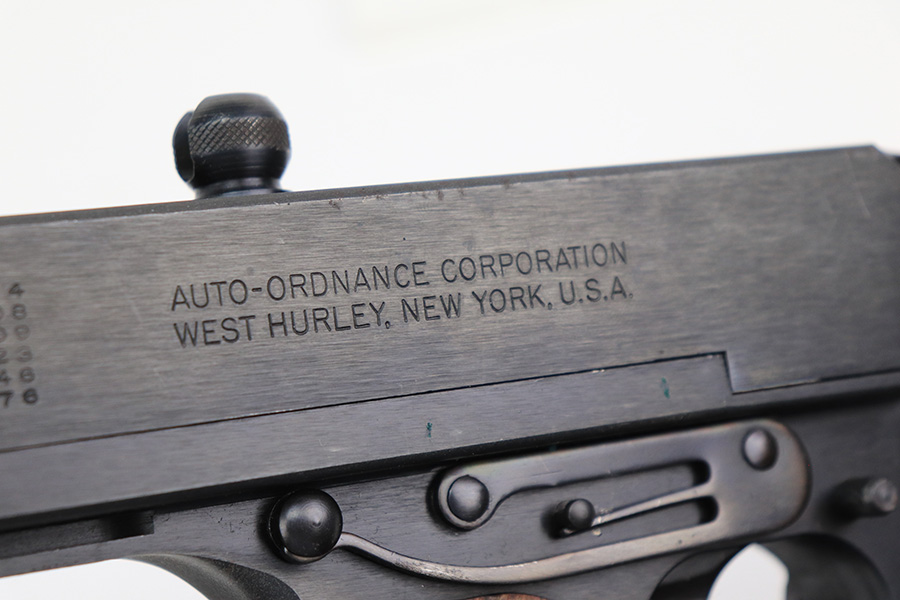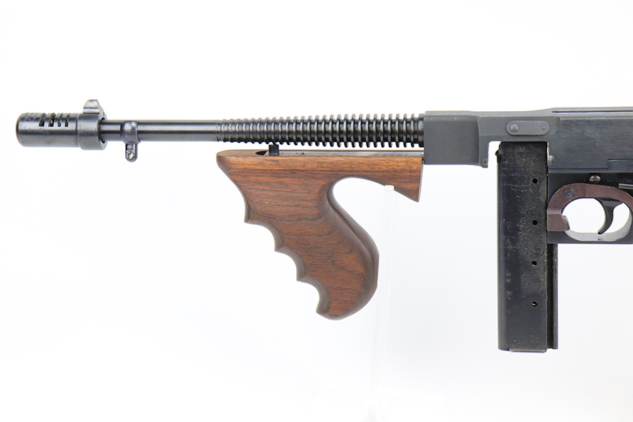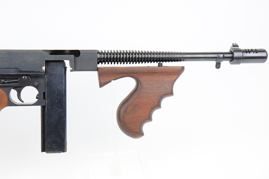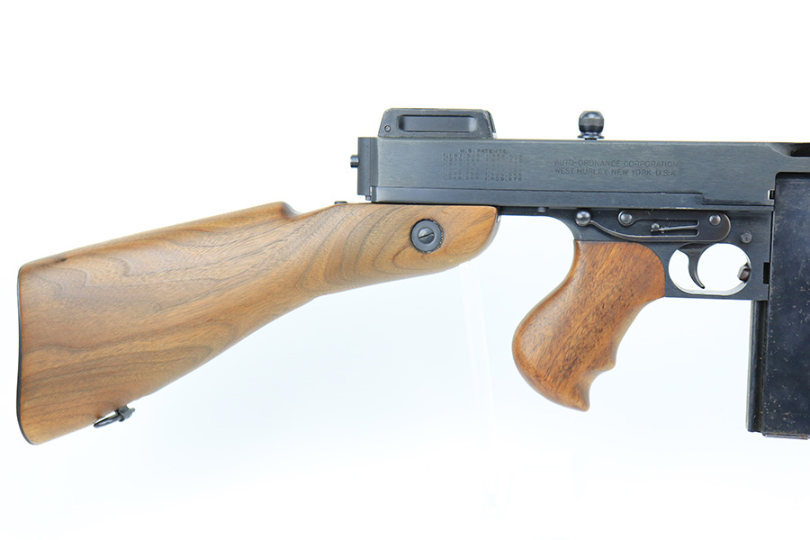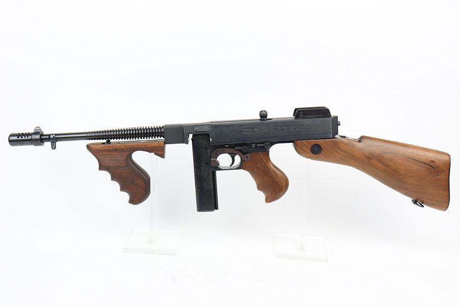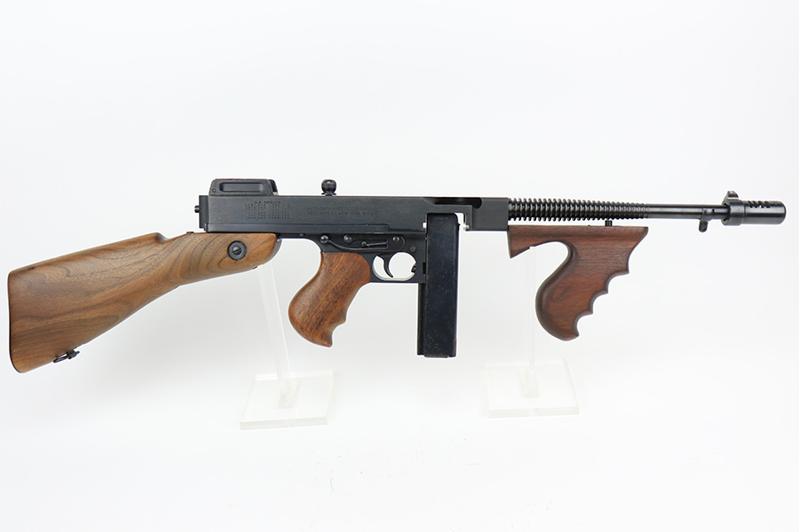 5/10/22 – This is a terrific example of a rare, original Auto-Ordnance Thompson 1928 submachine gun. Fully transferrable on a form 4. The gun is all original with roughly 97-98% of the blue remaining, as there’s just minor high edge wear and a little freckling on the compensator. Also some spots of rust on the buttstock. Minty bore, looks like it hasn’t been shot much at all. Manufactured in the 1970s/1980s as part of the “A” suffix serial range, the Auto-Ordnance 1928 Thompson is virtually a perfect reproduction of the original vintage “Roaring Twenties” Tommy Gun. One of the signature weapons of the prohibition era, the Thompson was one of the great “heavy metal” submachine guns, operating semi or full automatic on an open bolt, fully machined with fine hardwood furniture; the later sheet metal guns may have had them beat for cost effectiveness but not for style. It has folding ladder peep sights and a compensator, with a quick-detach buttstock and a contoured pistol grip. Comes with a total of 4 magazines, all 20rd.