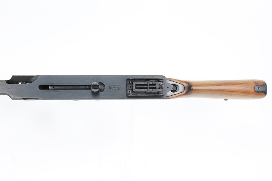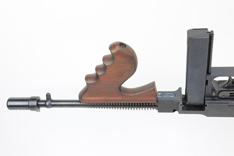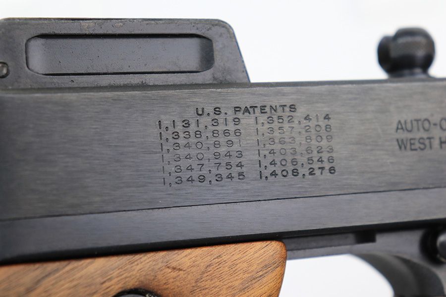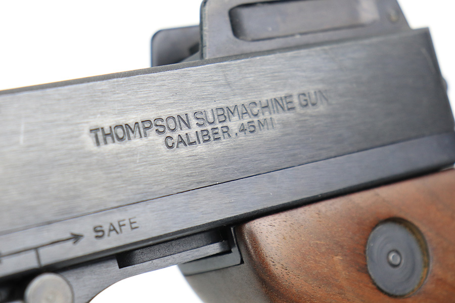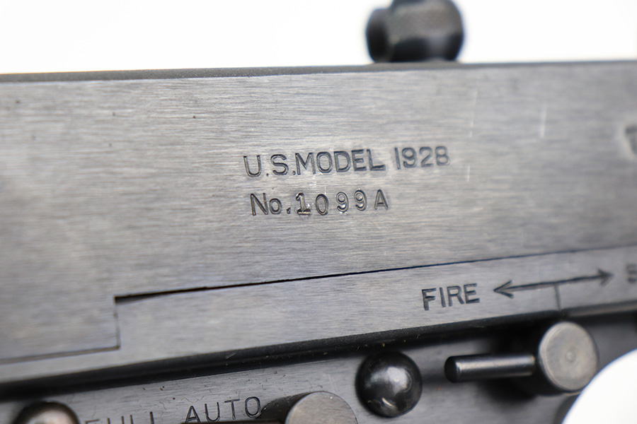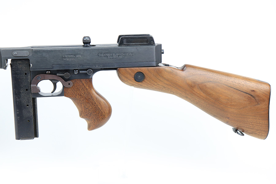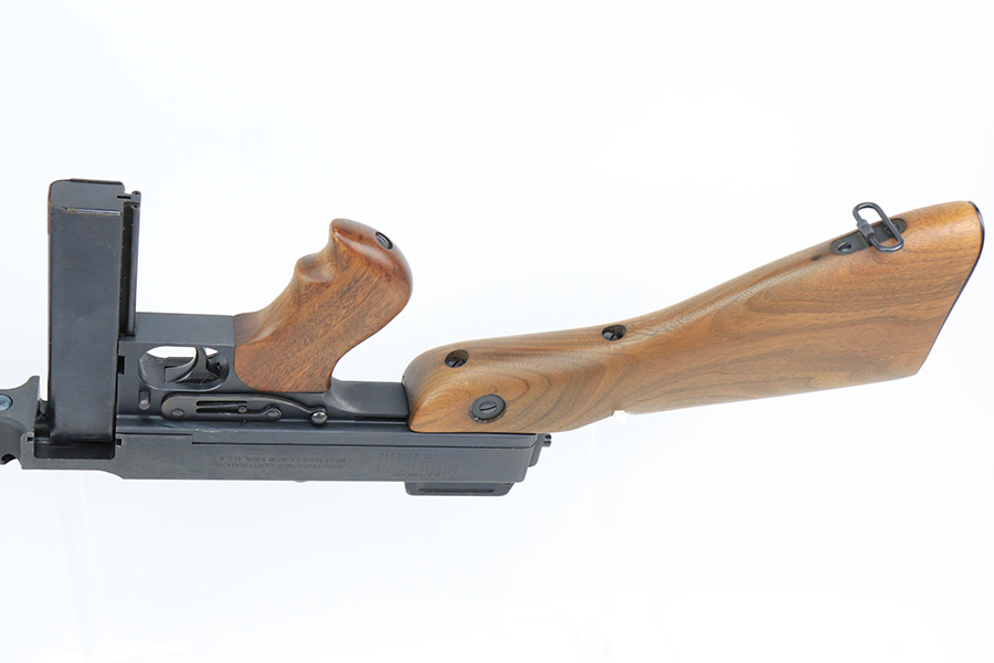 5/10/22 – This is a terrific example of a rare, original Auto-Ordnance Thompson 1928 submachine gun. Fully transferrable on a form 4. The gun is all original with roughly 97-98% of the blue remaining, as there’s just minor high edge wear and a little freckling on the compensator. Also some spots of rust on the buttstock. Minty bore, looks like it hasn’t been shot much at all. Manufactured in the 1970s/1980s as part of the “A” suffix serial range, the Auto-Ordnance 1928 Thompson is virtually a perfect reproduction of the original vintage “Roaring Twenties” Tommy Gun. One of the signature weapons of the prohibition era, the Thompson was one of the great “heavy metal” submachine guns, operating semi or full automatic on an open bolt, fully machined with fine hardwood furniture; the later sheet metal guns may have had them beat for cost effectiveness but not for style. It has folding ladder peep sights and a compensator, with a quick-detach buttstock and a contoured pistol grip. Comes with a total of 4 magazines, all 20rd.