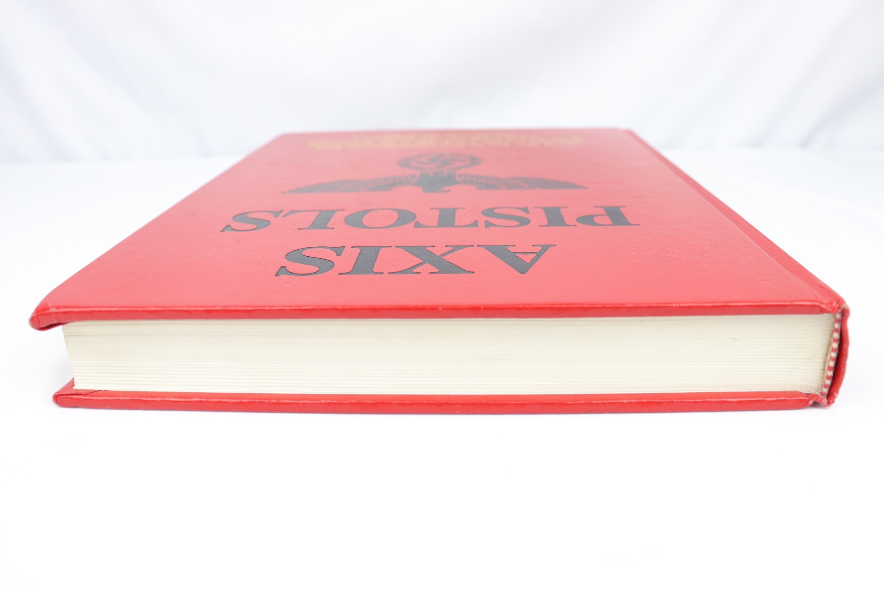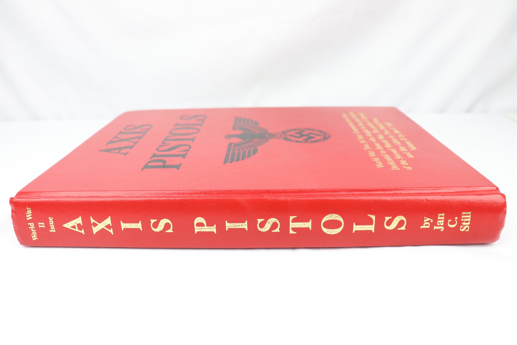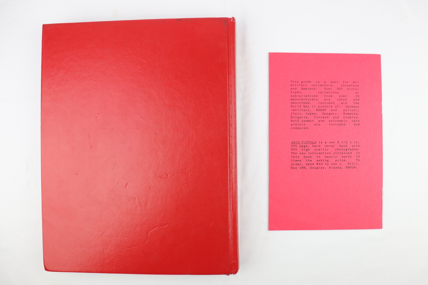 8/11/19 – This is a signed copy of Axis Pistols by Jan Still complete with a price guide. This book covers the Army, Luftwaffe, Kreigsmarine, police and NSDAP pistols of Nazi Germany and of her Axis allies. There are more than 300 pistol variations photographed and described in detail. There is a small scratch on the top right leading corner of the book cover and a small tear on the bottom of the binding. There also a small ink stain on the price guide near the binding.
