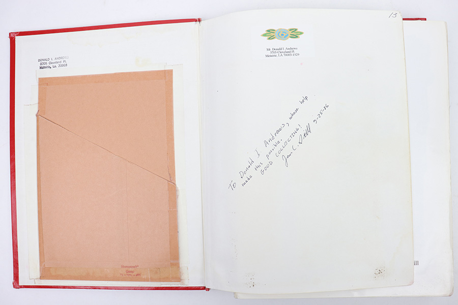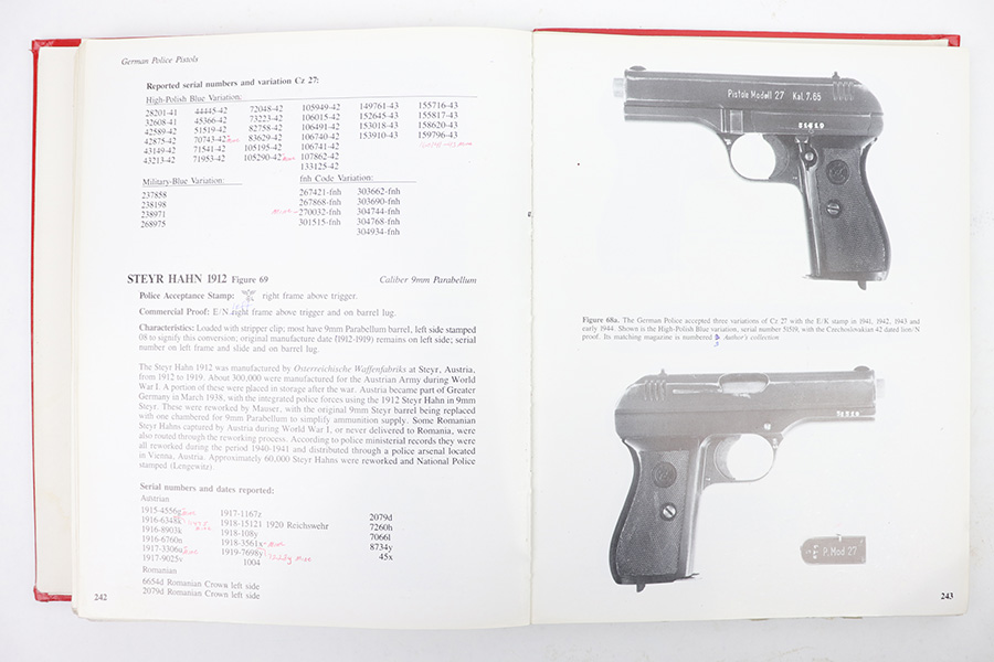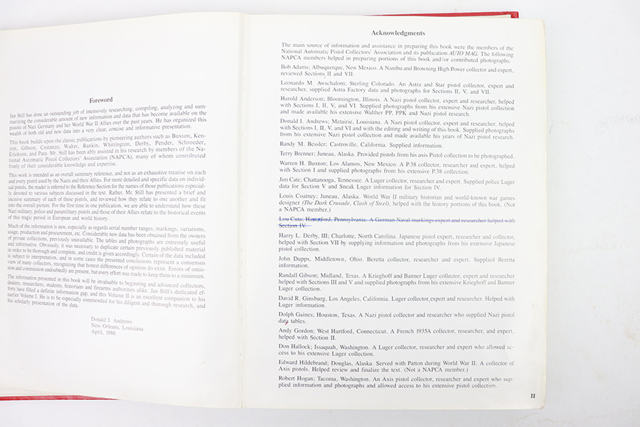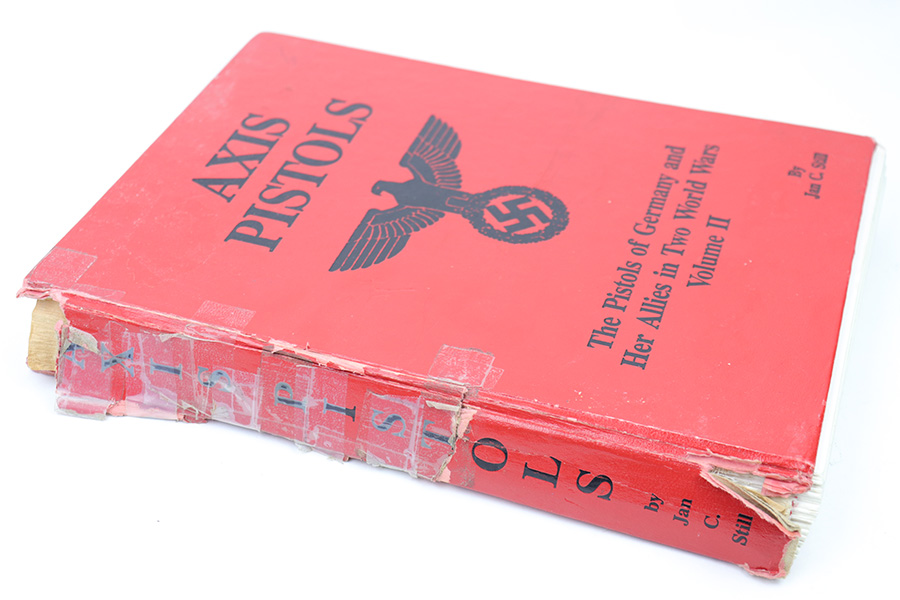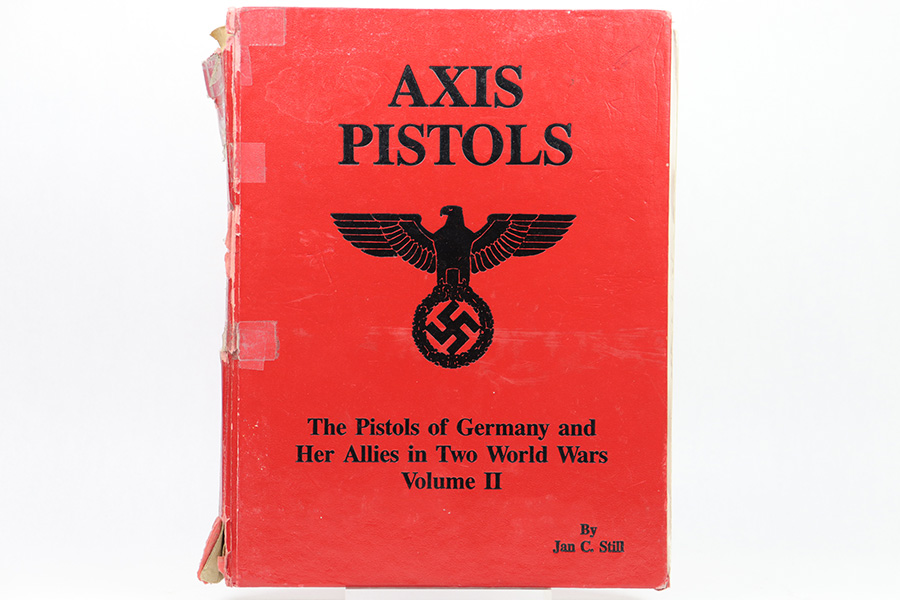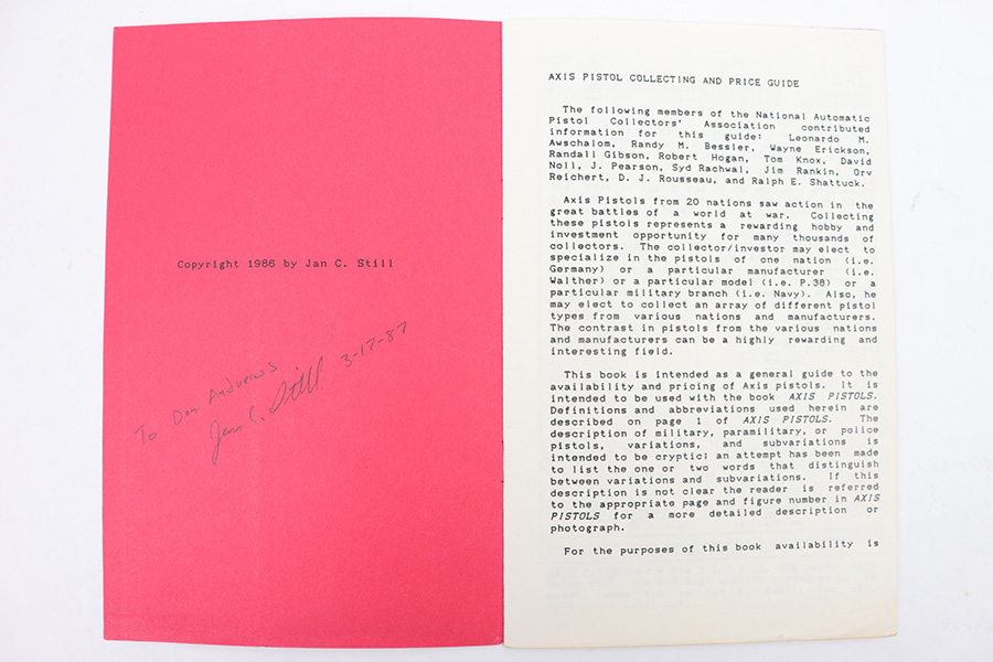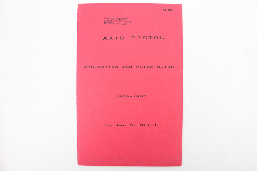 2/28/23 – This is a worn, heavily used copy of Axis Pistol by Jan Still. From the library of Don Andrews. Includes taped-on notes and added information from a previous owner. The binding is coming apart but all pages are still intact. Heavy damage and use wear on the exterior cover. Priced accordingly. Signed and includes price guide as shown.