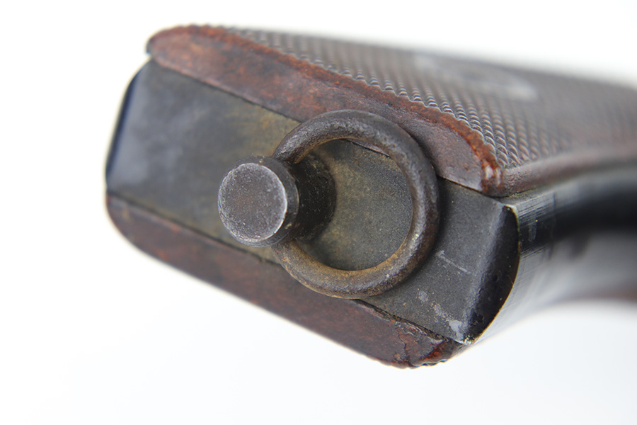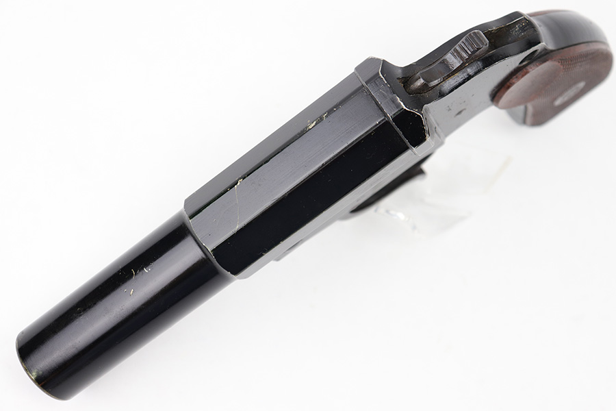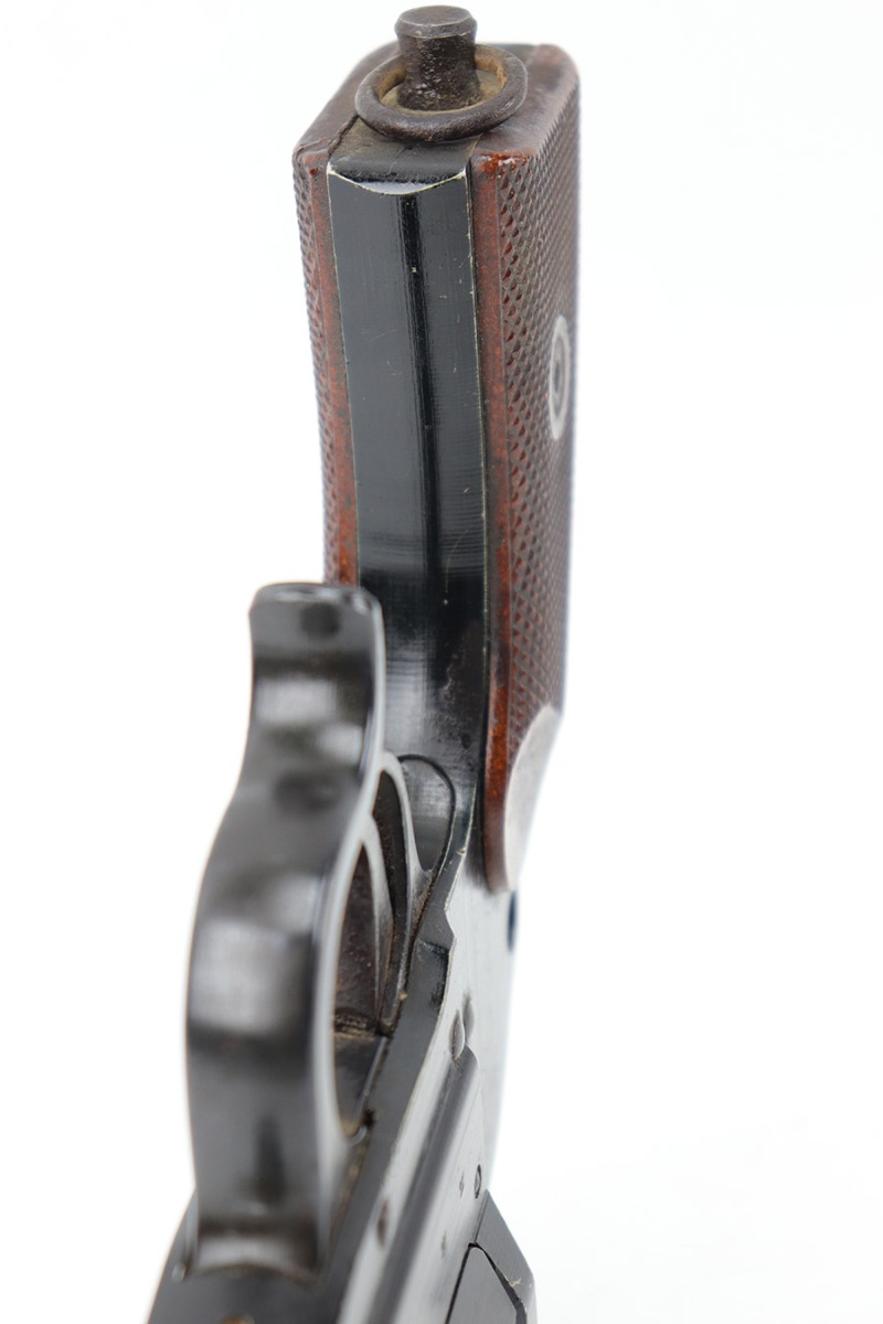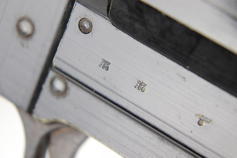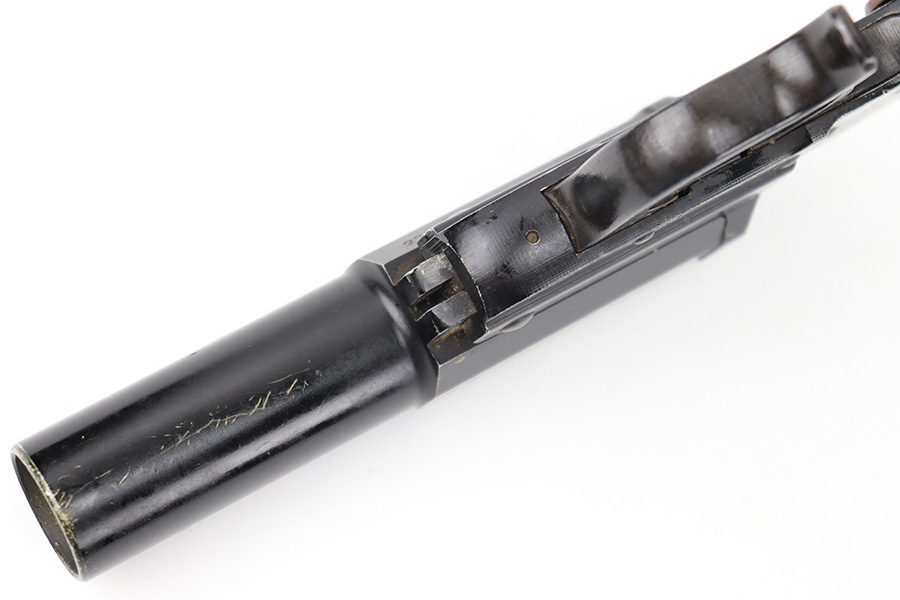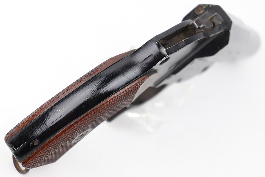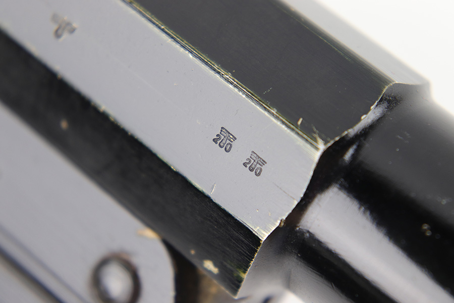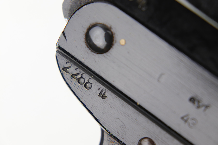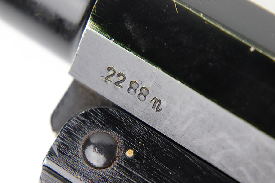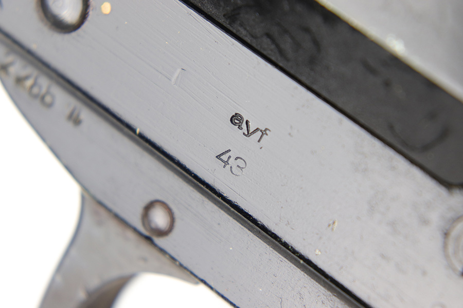 5/31/23 – This is an original 1943 production German LP 34 Flare pistol. The pistol is matching numbered on the frame and barrel “2288n” and is maker code and date stamped by Erma “ayf 43” on the frame. The duraluminum finish is in great condition overall with some high edge wear and surface patina on the metal trigger, trigger guard / barrel release lever, and lanyard loop. Mechanically sound with original reddish colored bakelite grips.