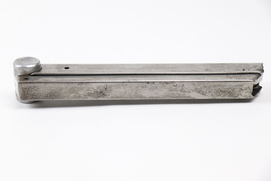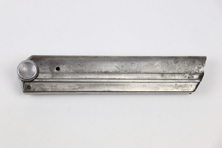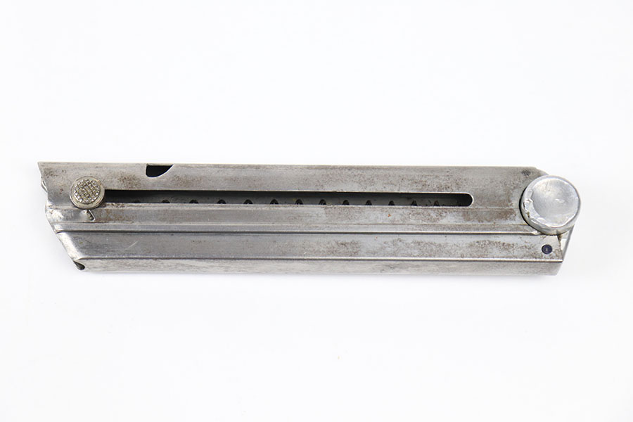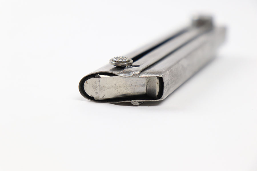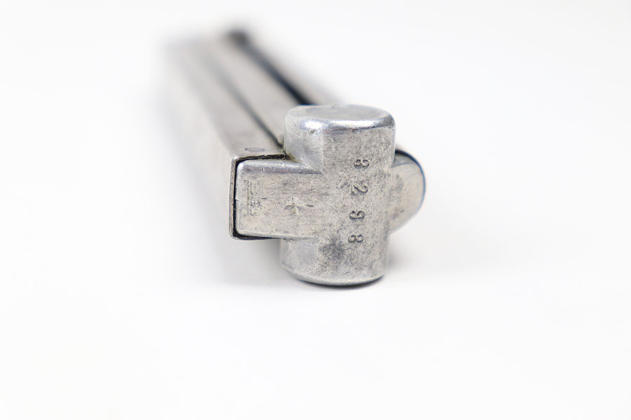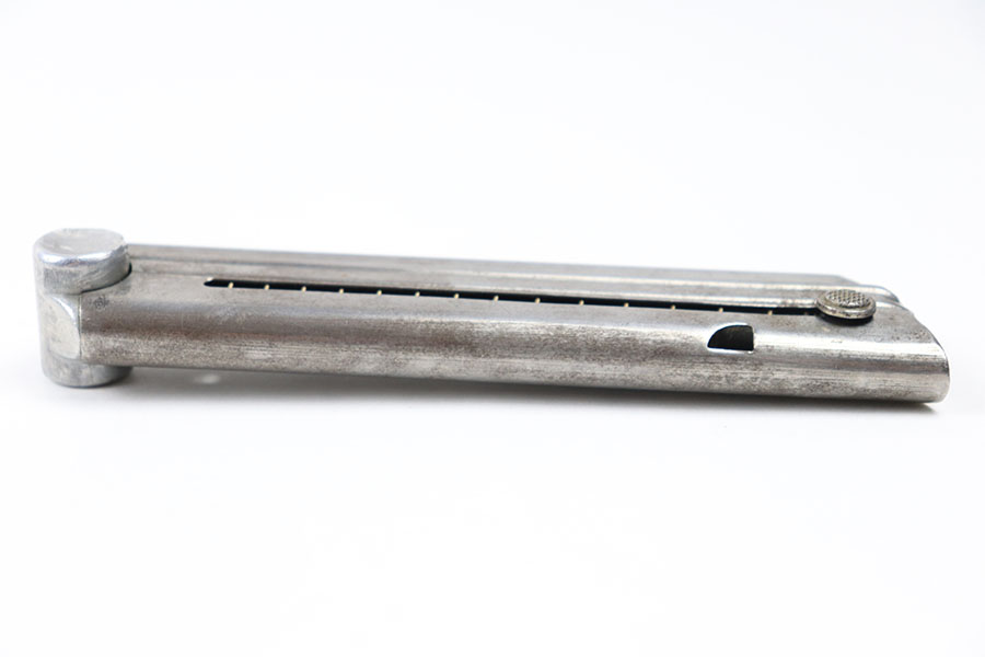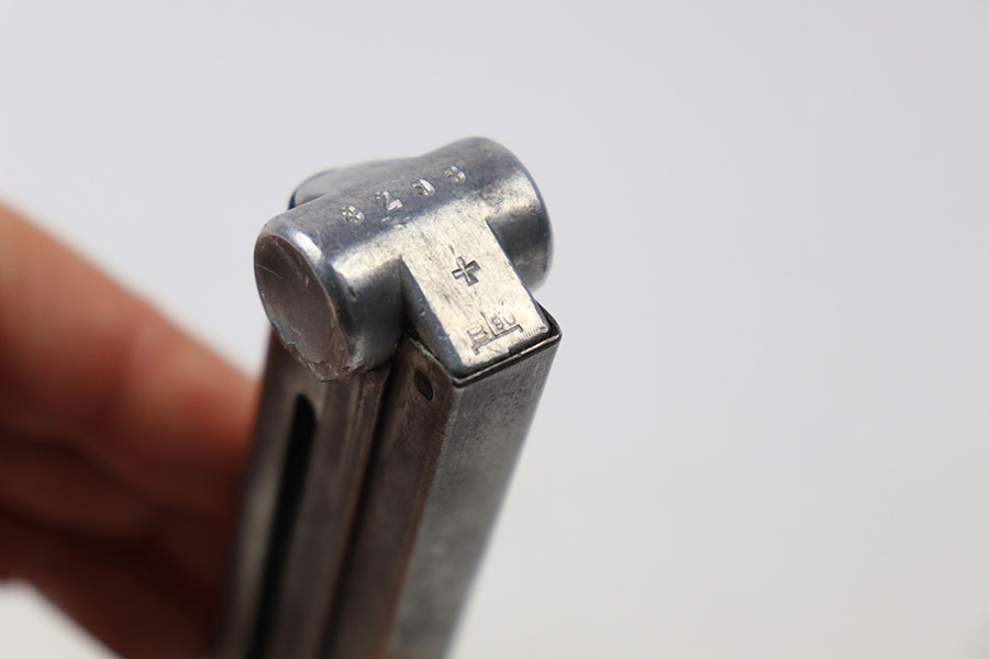 8/24/21 – This is a rare, original and early WW2 B 90 proofed luger magazine. The B 90 proof is found on K Date Lugers from 1934. The magazine has some light patina on the tube and mild wear throughout, but in nice overall condition. The spring is strong and fully functional. The base is serial numbered with a “+” sign and B/90 proof.