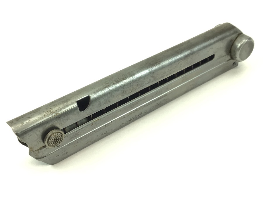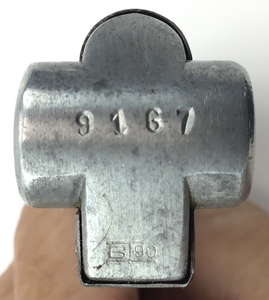 8/3/22 – This is an original B/90 proof stamped K Date Luger magazine. The base is serial numbered “9167” and the B/90 proof stamp. B/90 proof is only found with K Date lugers. The magazine has some mild discoloration but no rust or pitting and a strong, fully functional spring.