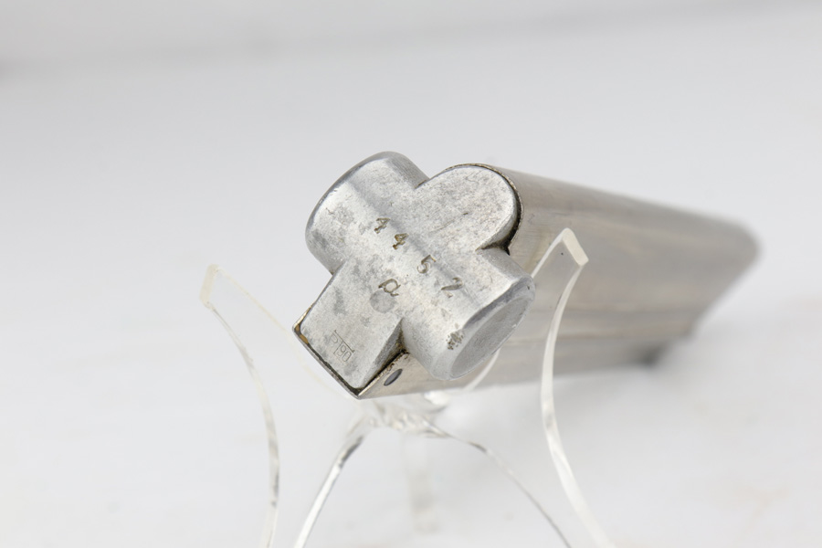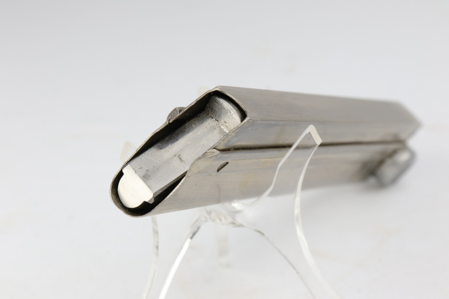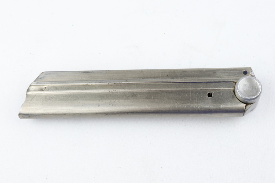 3/13/19 – This is a scarce, excellent condition B/90 proofed Luger magazine for a K date Luger. The magazine is early / pre WW2 with a nickle frame and aluminum base. The base is serial numbered “4452a” with a crisp B/90 proof stamp. We guarantee the stamp is original – very hard to find magazine in beautiful condition.