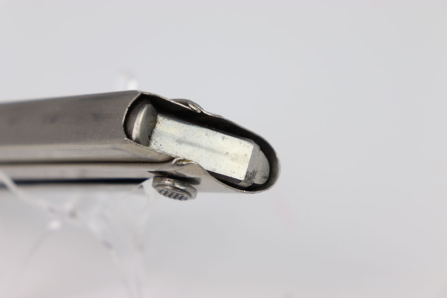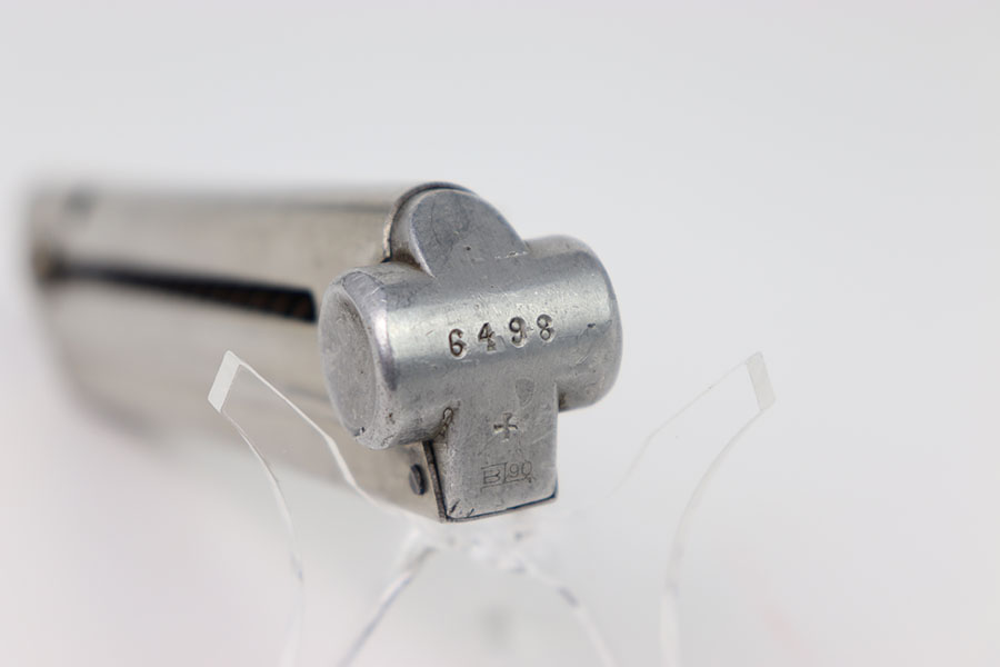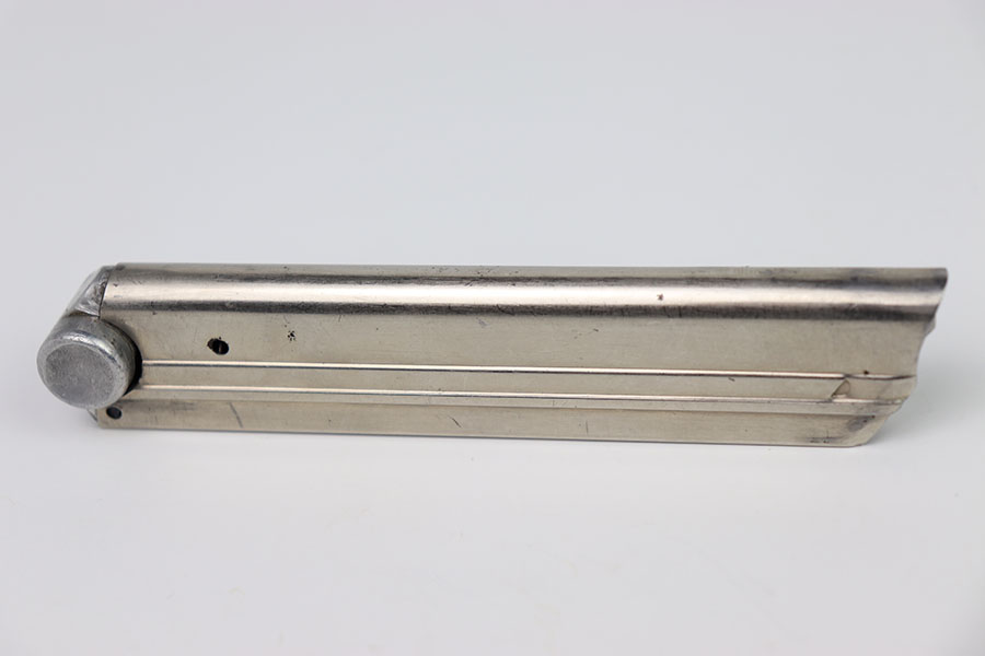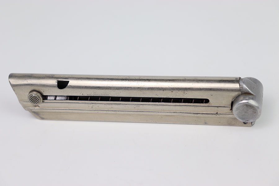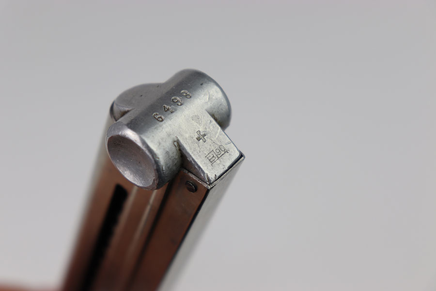 2/6/24 – This is an exceptional example of an early WW2 production, rare variation Luger magazine. The magazine has a nickel tube and aluminum base. The base is serial numbered 6498 with a plus sign underneath, indicating this as the spare magazine. There’s also a B/90 Mauser proof stamp on the base, which is unique to K Date and G Date lugers. Excellent++ overall condition with some very minor pin pricking on the tube and light wear towards the top of the tube. Spring is very strong and functional.