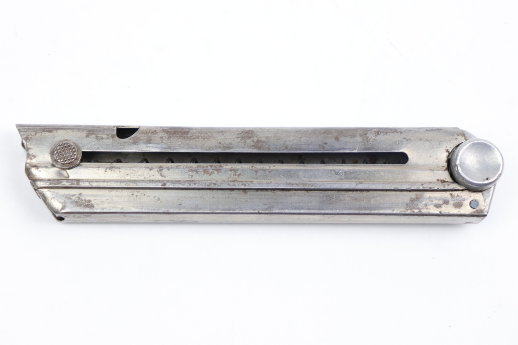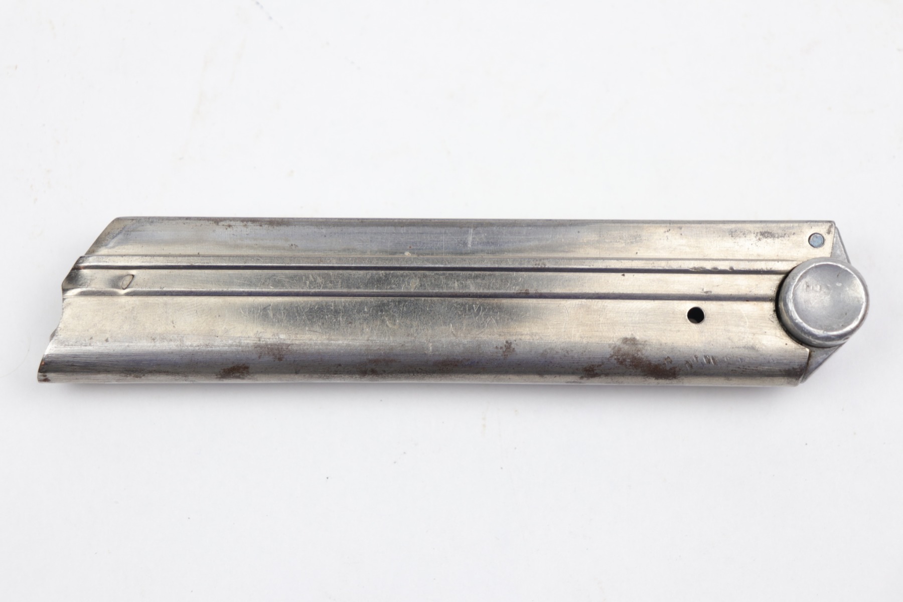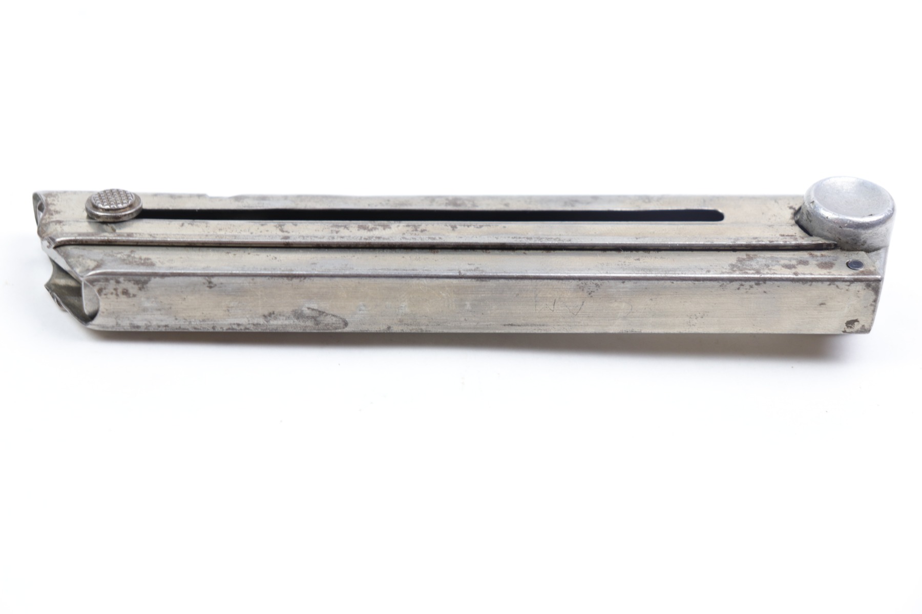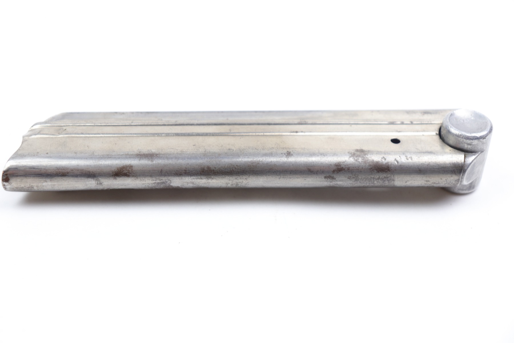 12/28/20 – This is an original, rare variation B/90 proofed Luger magazine. The magazine has a nickled tube and aluminum base. The base is serial numbered 3258a with a “+” sign and b/90 proof stamp. The tube has some dark patina as shown in photos. Fully functional spring.