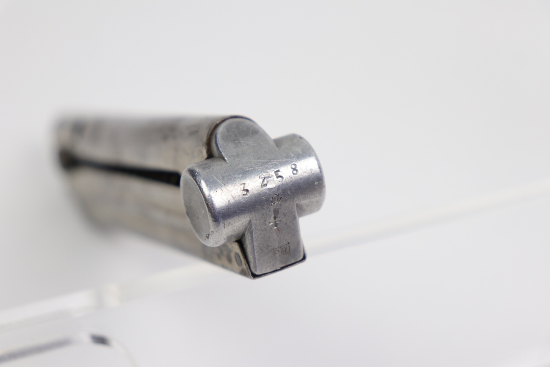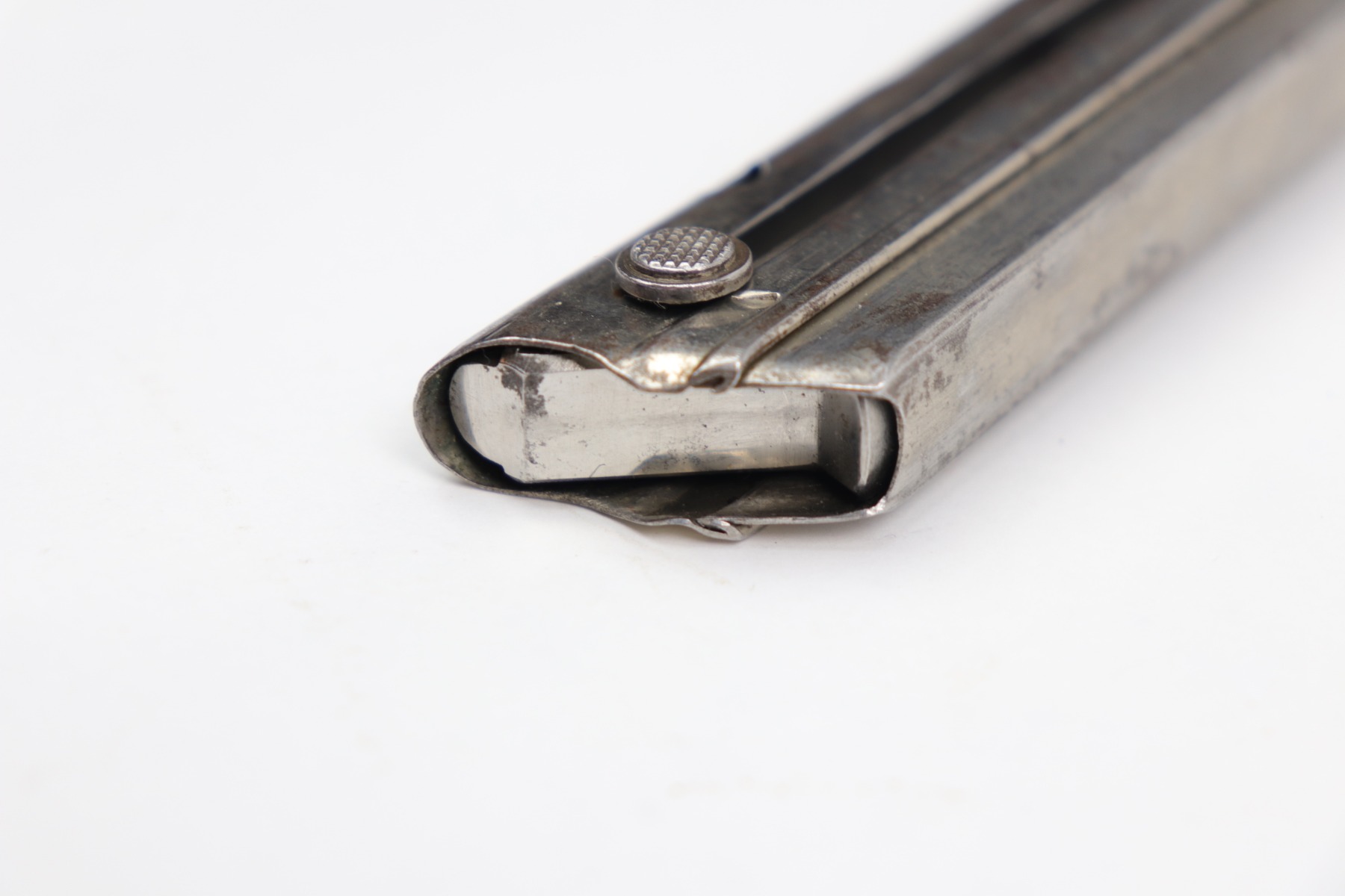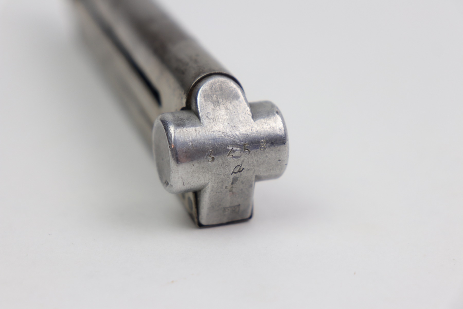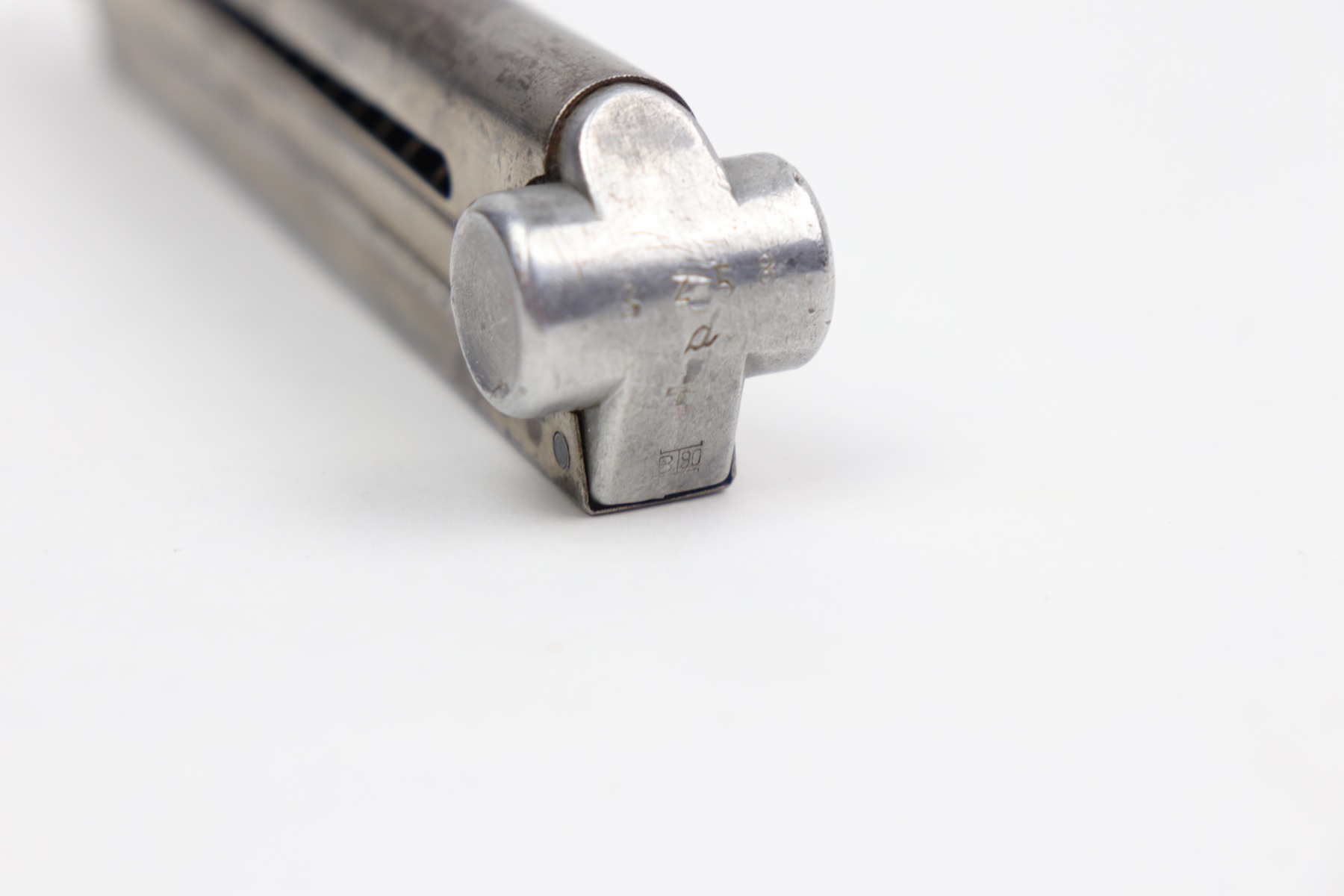 12/28/20 – This is an original, rare variation B/90 proofed Luger magazine. The magazine has a nickled tube and aluminum base. The base is serial numbered 3258a with a “+” sign and b/90 proof stamp. The tube has some dark patina as shown in photos. Fully functional spring.
