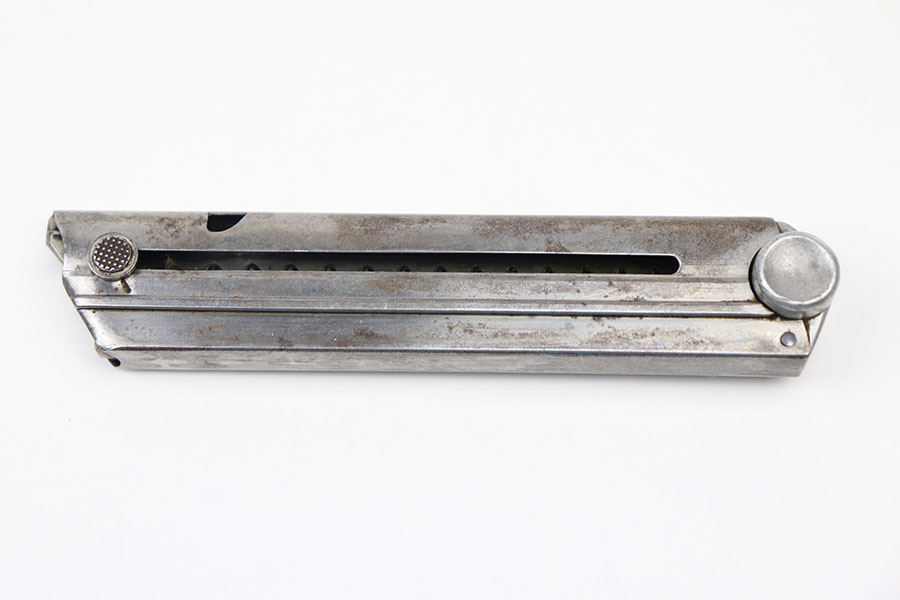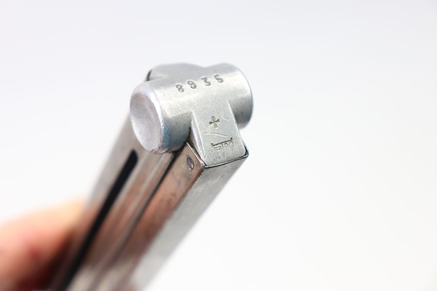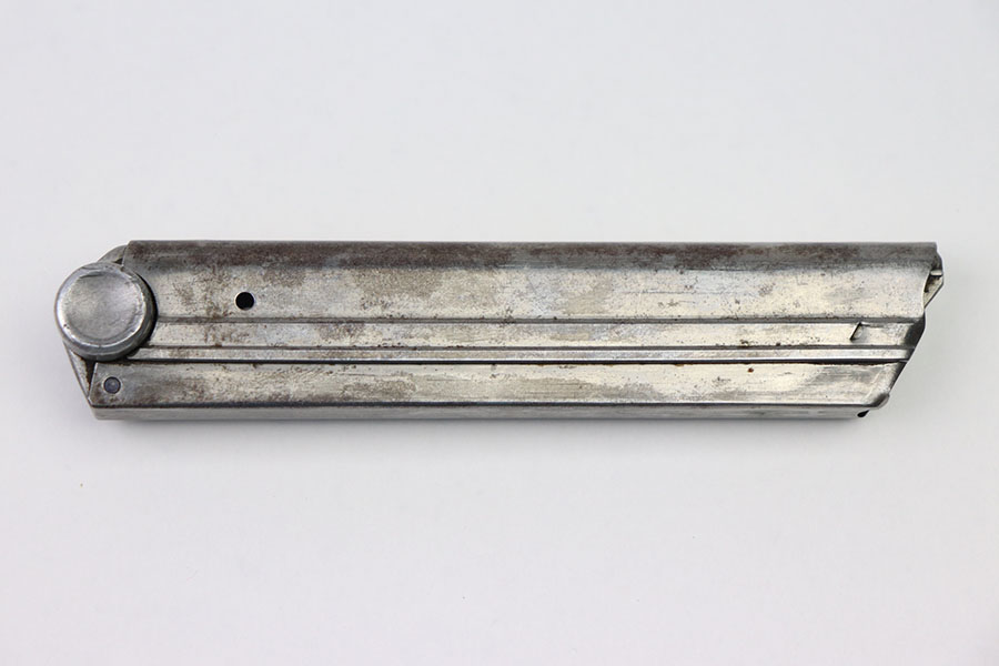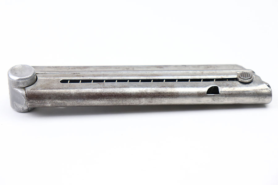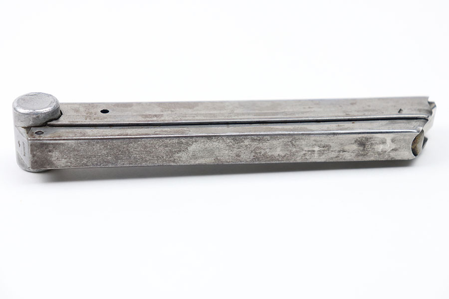 4/22/21 – This is an original, scarce variation K Date Luger magazine. the baes of the magazine is serial numbered and B/90 proof stamped. The tube is nickel with some mild surface patina throughout. No rust or pitting. Strong, functional spring.