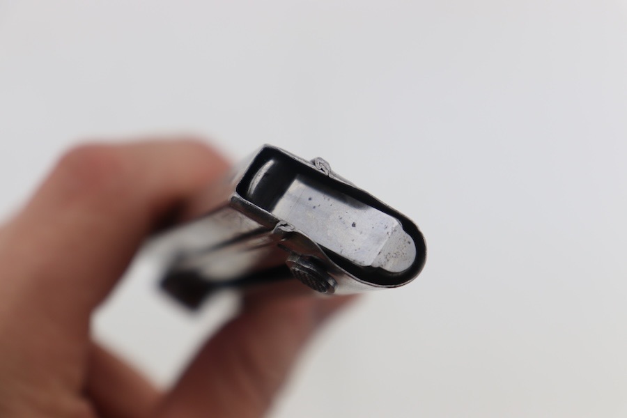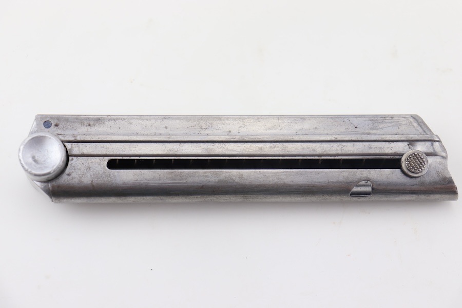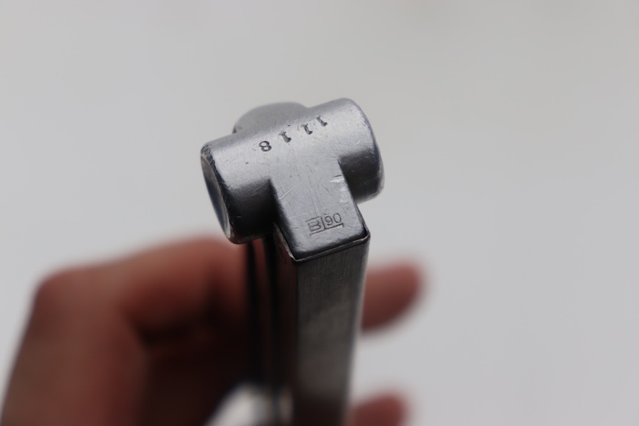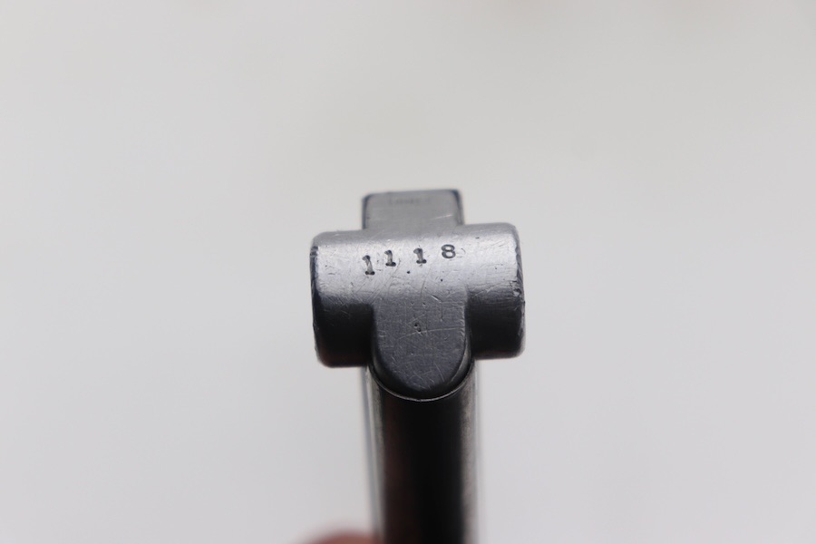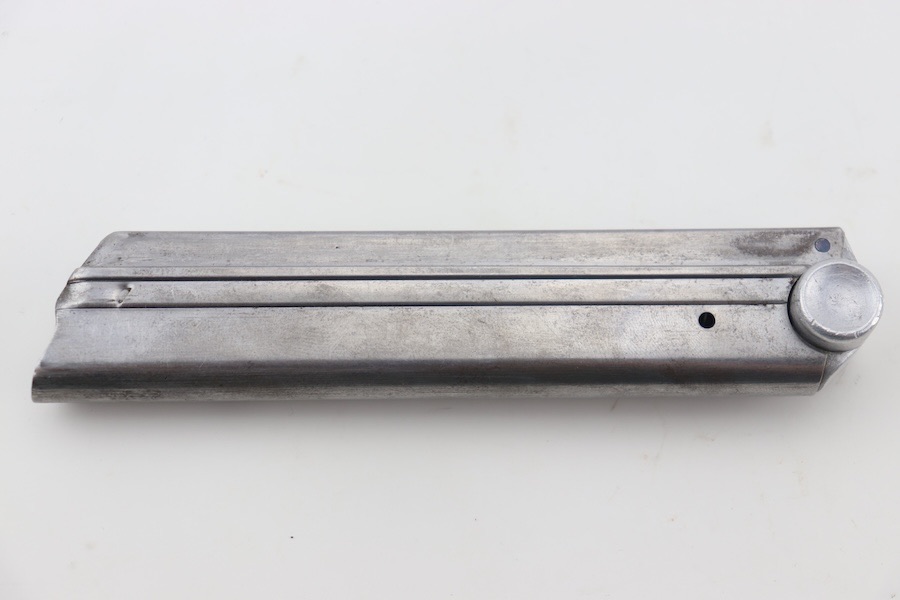 5/2/24 – This is a great condition B/90 Luger Magazine. This magazine features a nickeled tube with a light and natural patina. The base plate is a little strange as it has no suffix letter, and the serial number was stamped upside down (1118). The B/90 stamp does look correct and is in the correct spot on the aluminum footplate.
