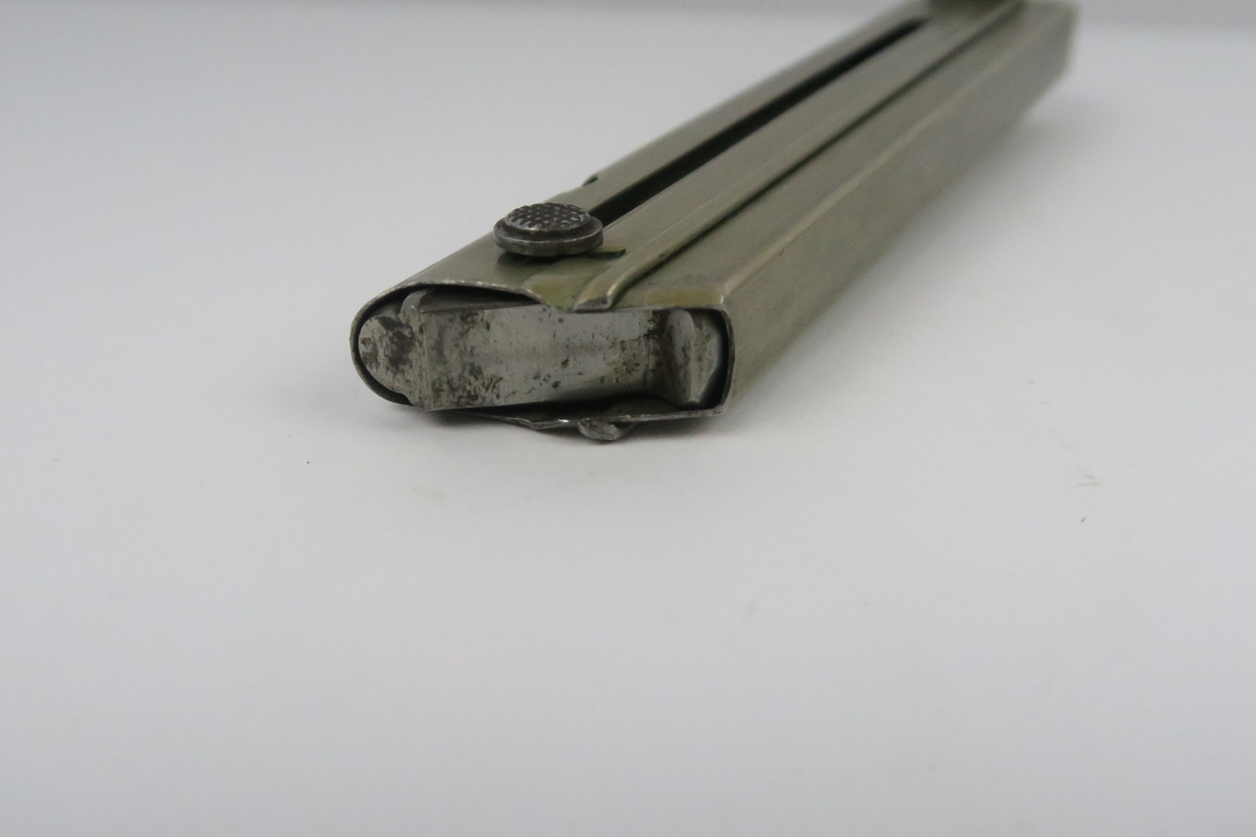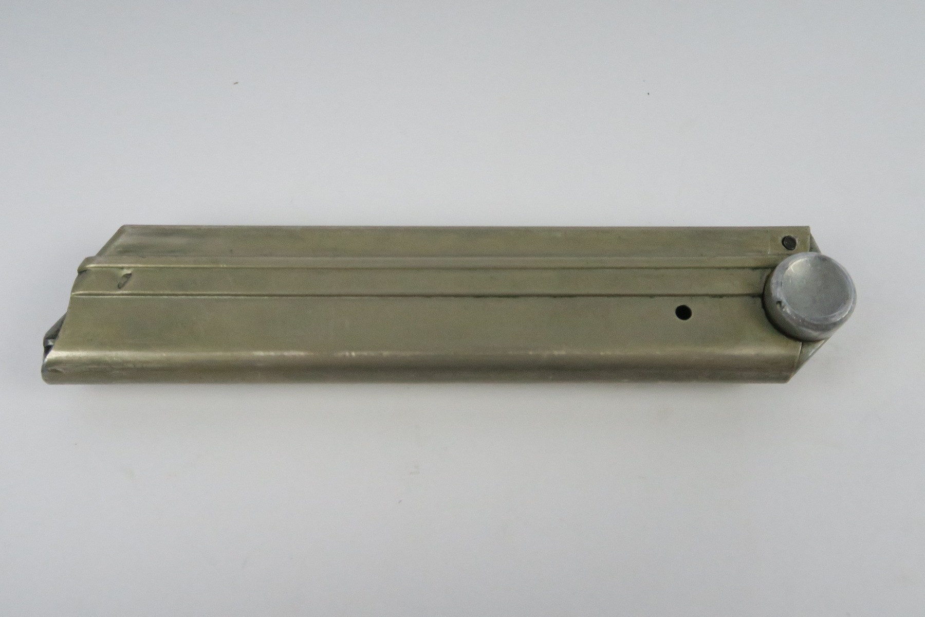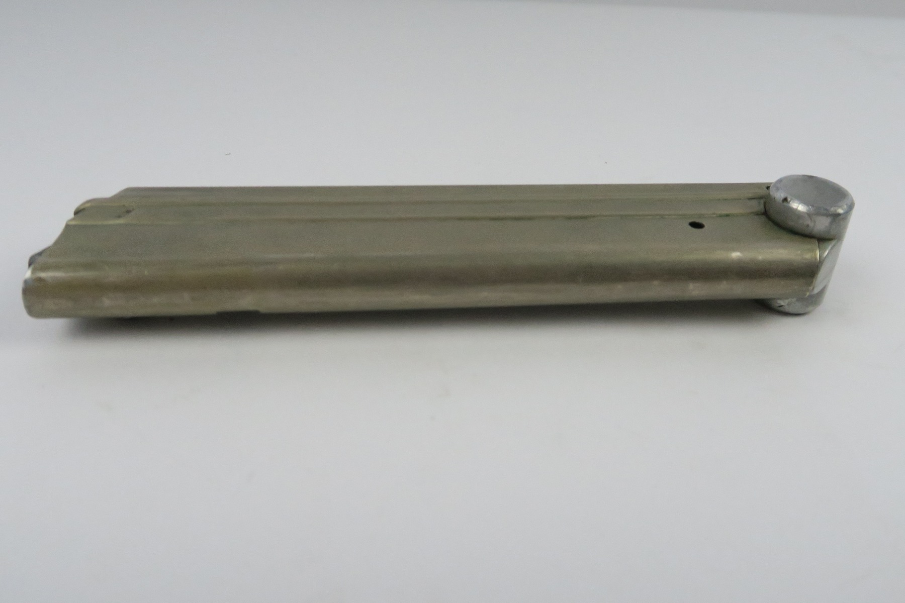 1/24/18 – This is an original G Date Luger magazine with a B/90 proof stamp on the base. The B/90 proof is seen on G Date and K Date Lugers, but K Date Lugers didn’t have letter suffixes except for a few thousand in the a block (I think the latest recorded K Date serial is 12xx a). This magazine would be for an early G Date since it’s still in the “a” block, but past the first 1500 serial numbers. The base is serial numbered 7429 a with a “+” sign, making this the spare magazine. The magazine is in excellent, fully functional condition. Guaranteed original.