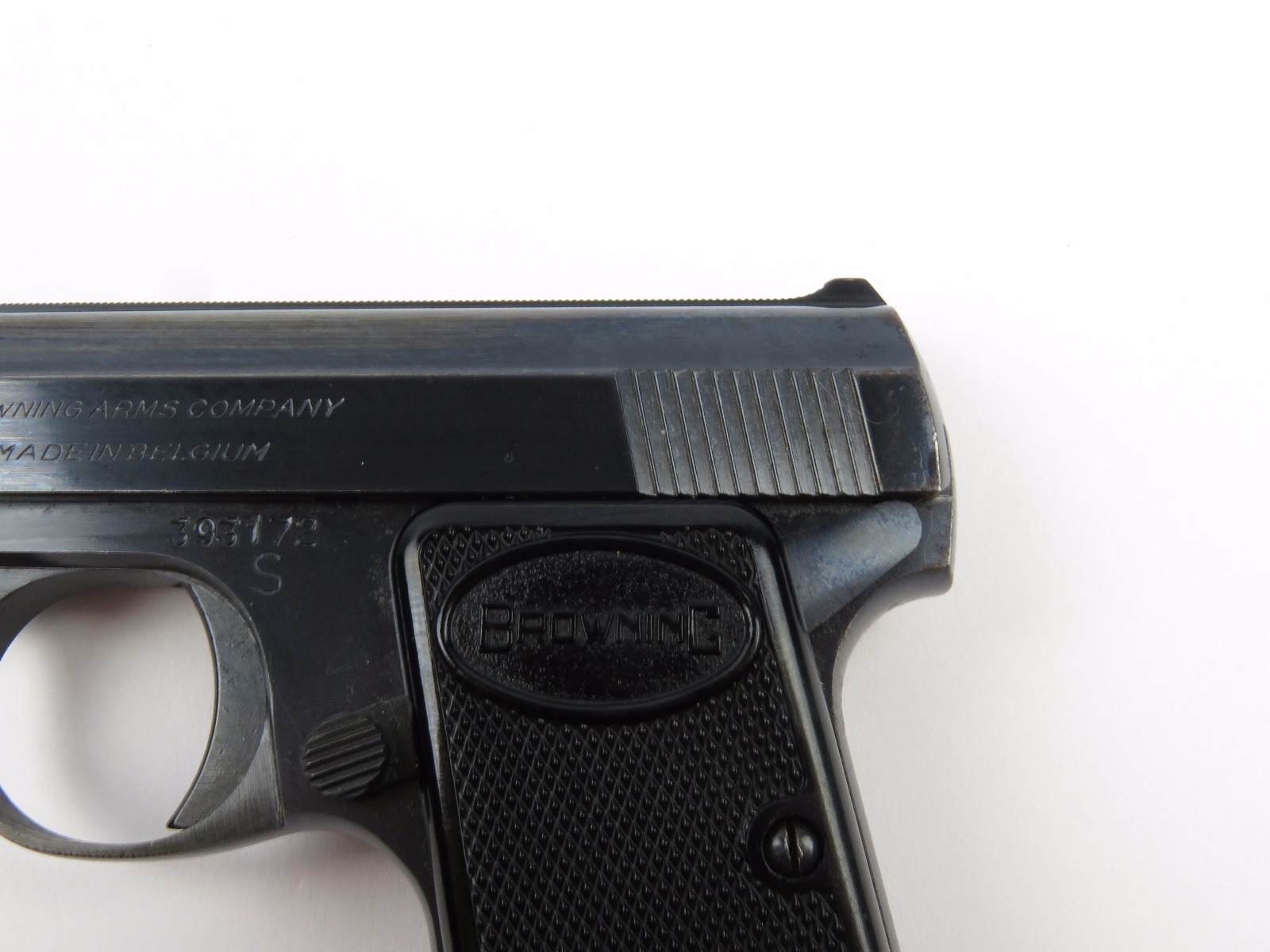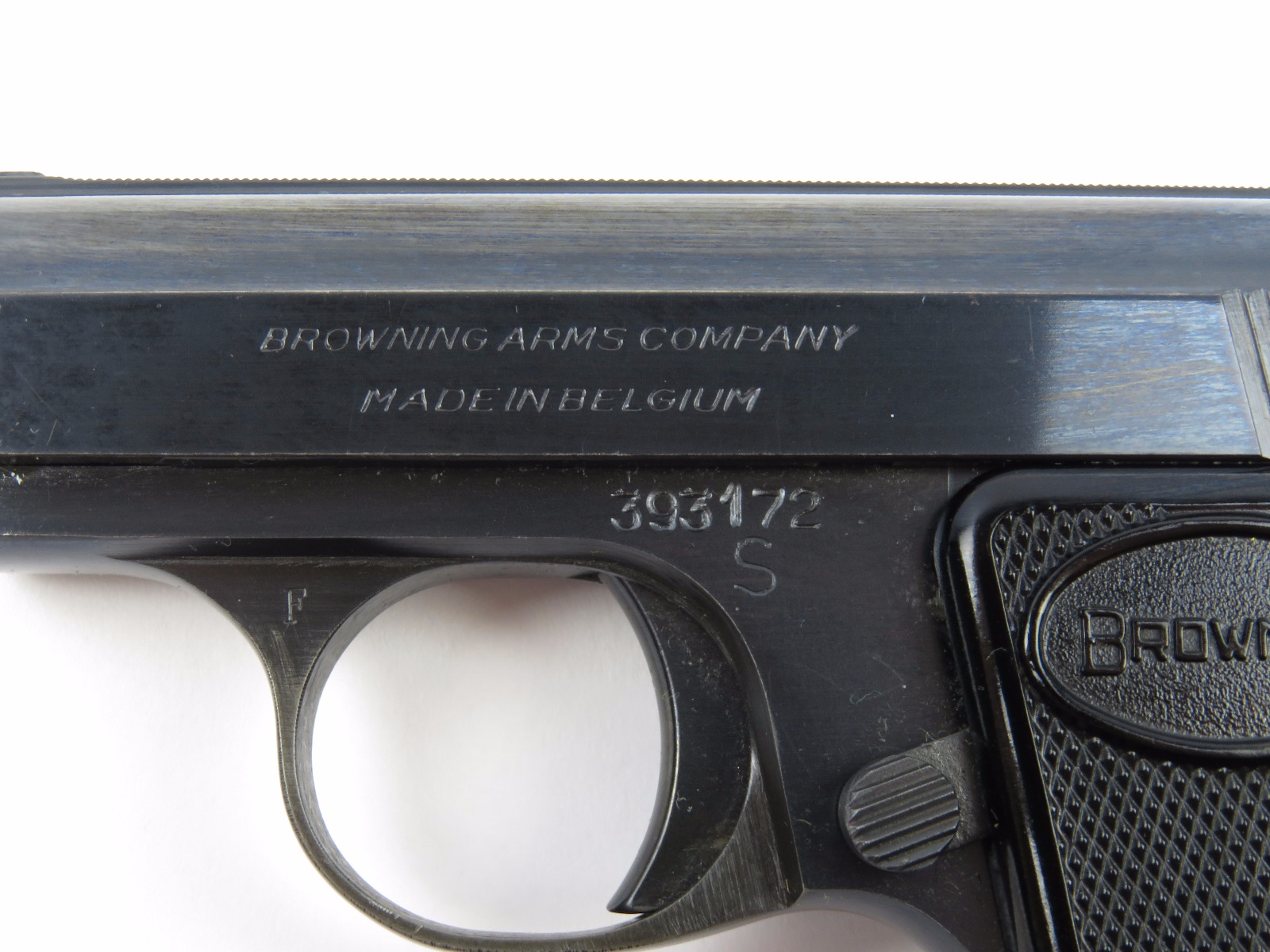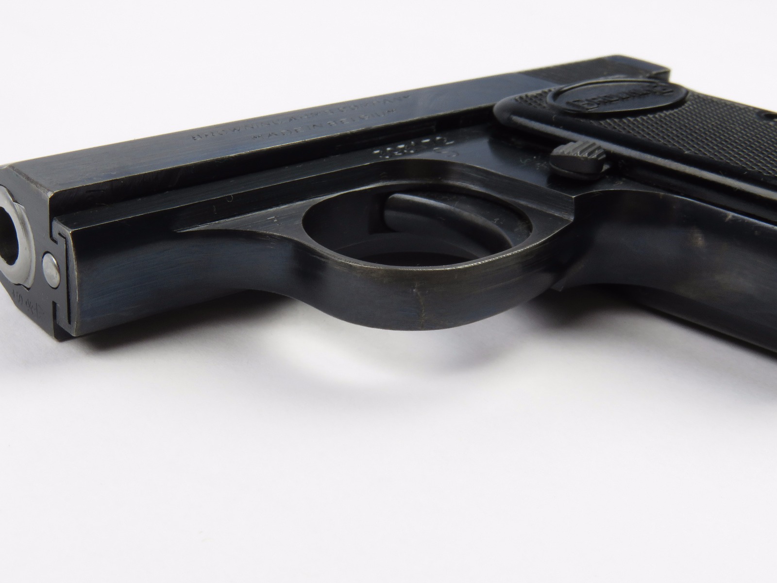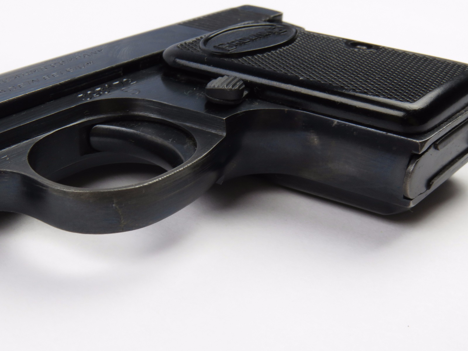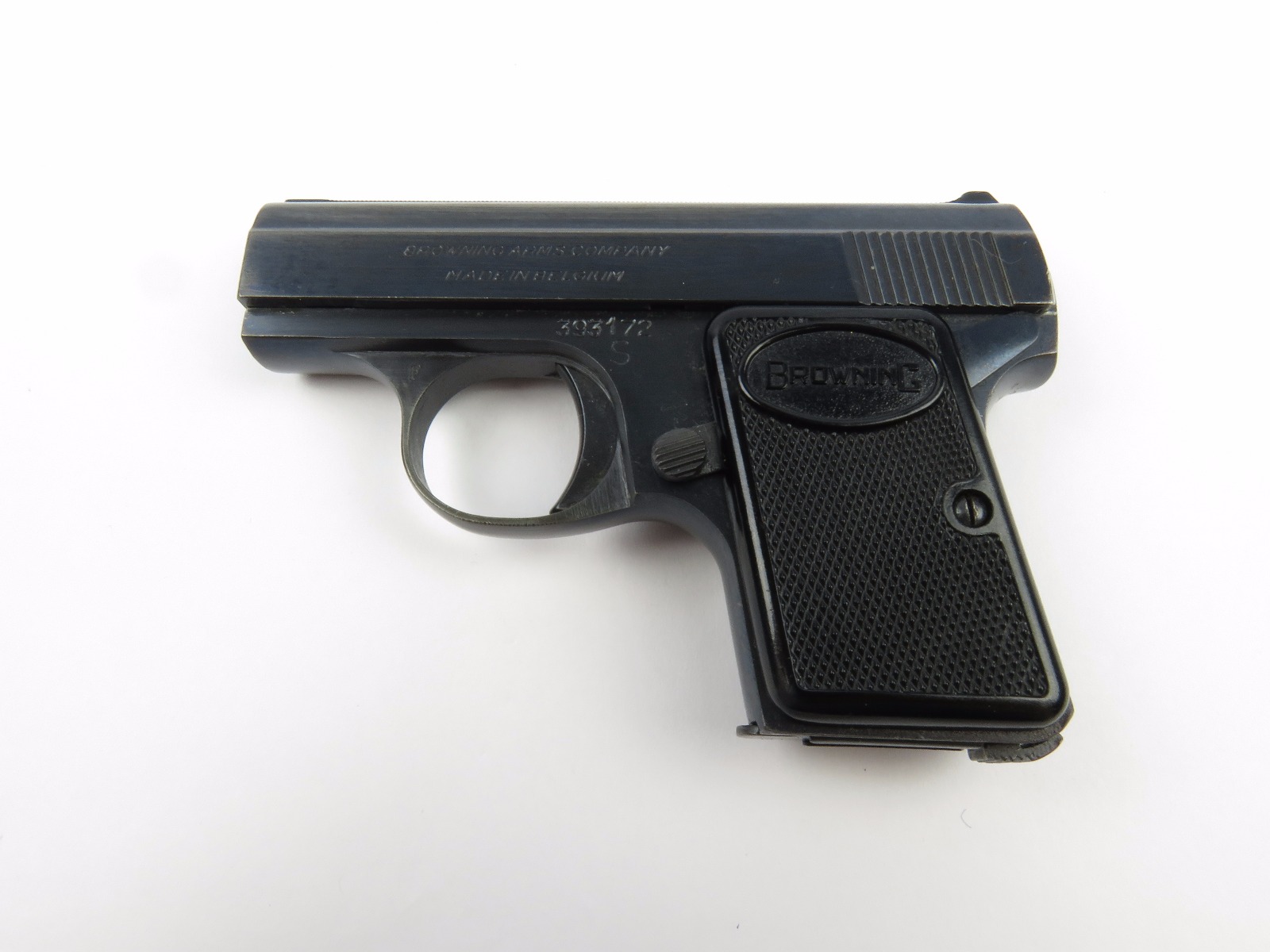 10/17/17 – This is a .25 caliber Browning pistol, also known as the Baby Browning pistol. The pistol was made in Belgium for export to the United States in 1966 (according to the serial number). The pistol is in excellent condition with the only wear being some dark spots in the finish (mostly on the slide). These dark spots in the bluing seem to be some storage wear and very minimal. Overall we rate at about 97%. Fully functional with correct grips and FN stamped magazine. All original and fully functional.