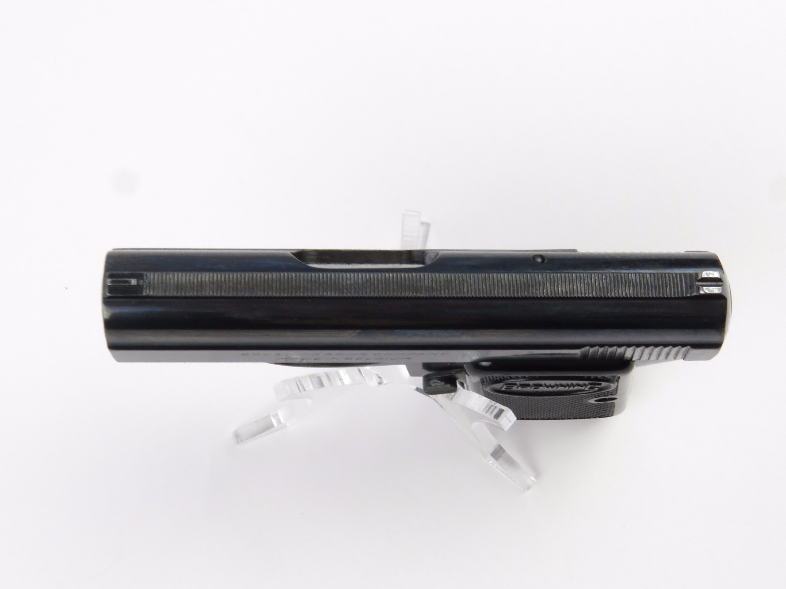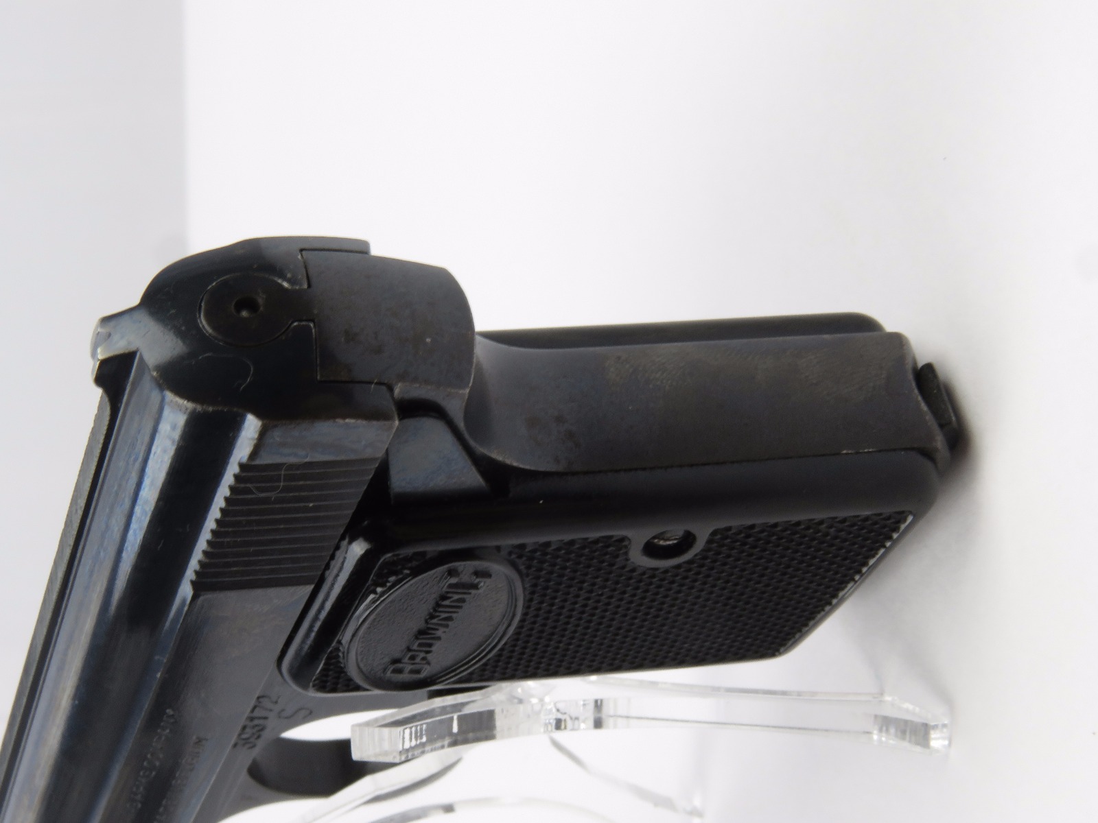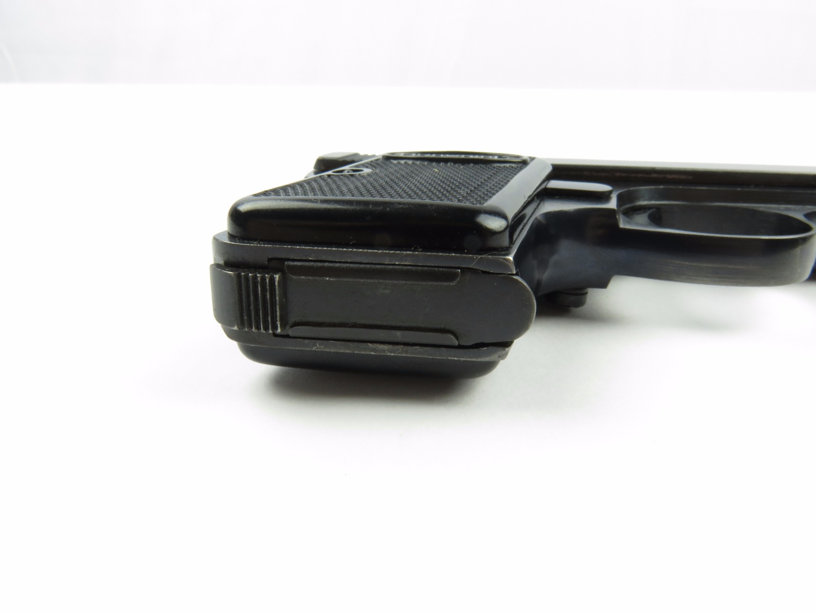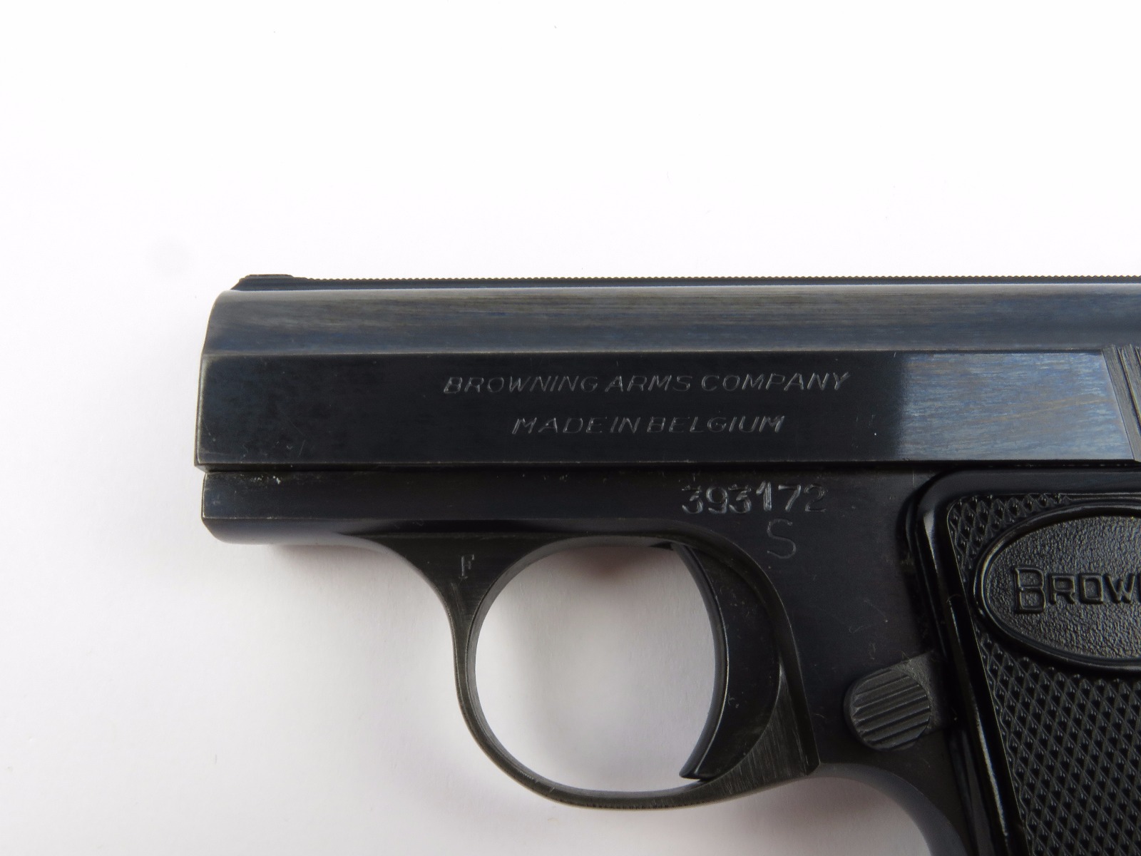 10/17/17 – This is a .25 caliber Browning pistol, also known as the Baby Browning pistol. The pistol was made in Belgium for export to the United States in 1966 (according to the serial number). The pistol is in excellent condition with the only wear being some dark spots in the finish (mostly on the slide). These dark spots in the bluing seem to be some storage wear and very minimal. Overall we rate at about 97%. Fully functional with correct grips and FN stamped magazine. All original and fully functional.