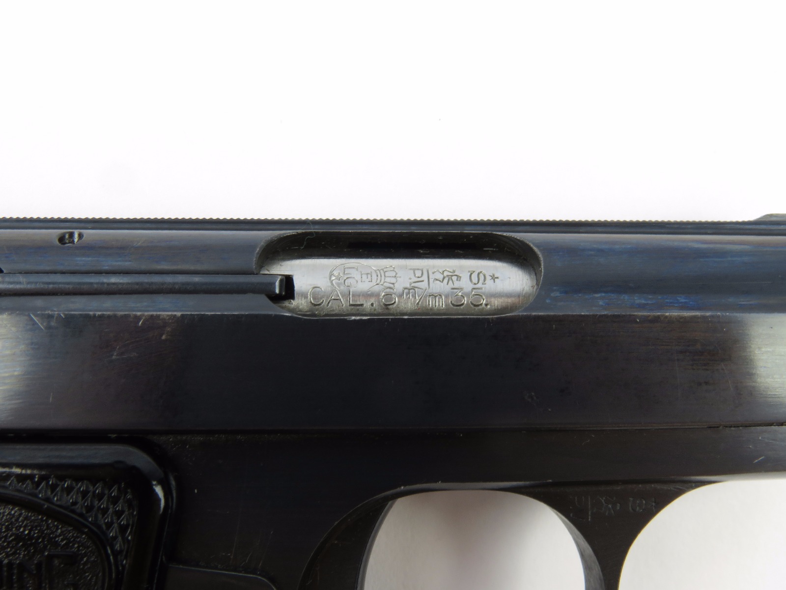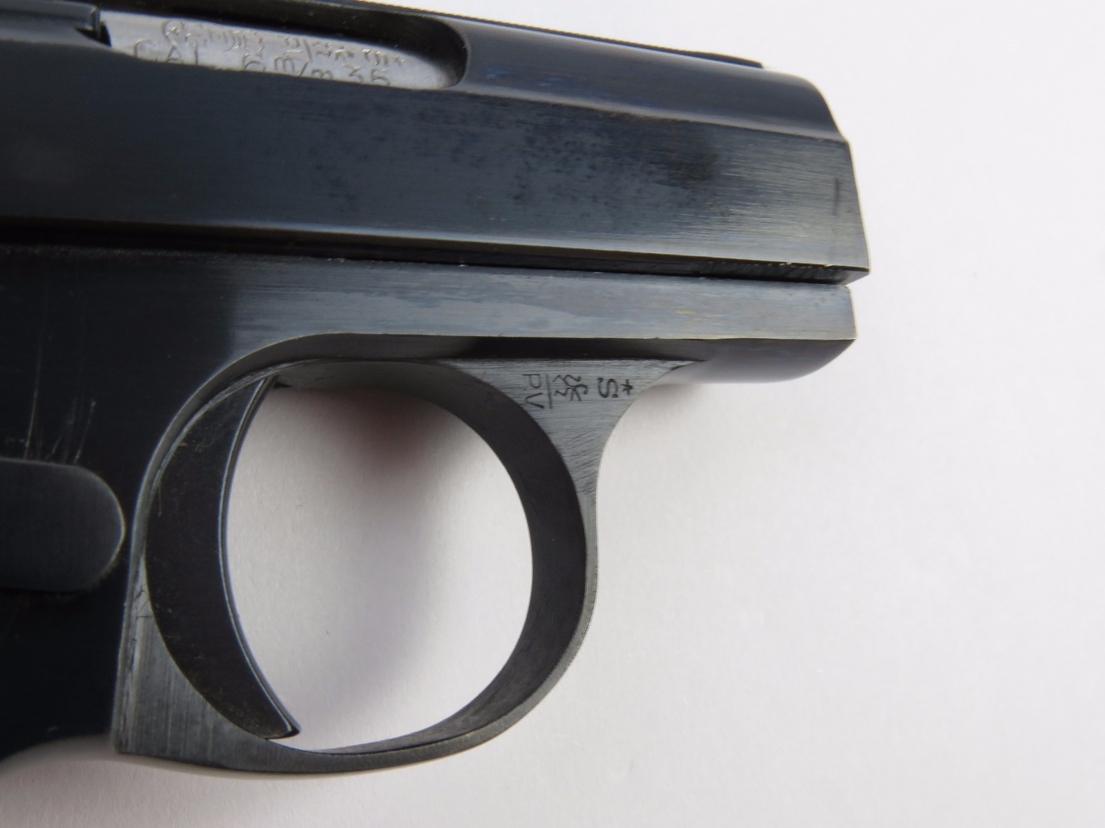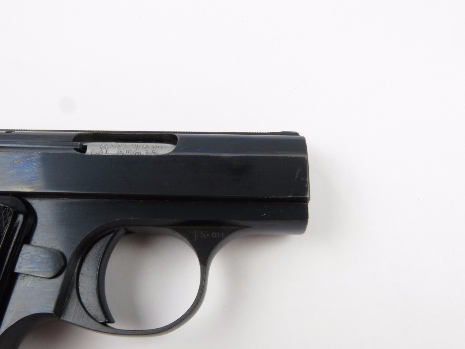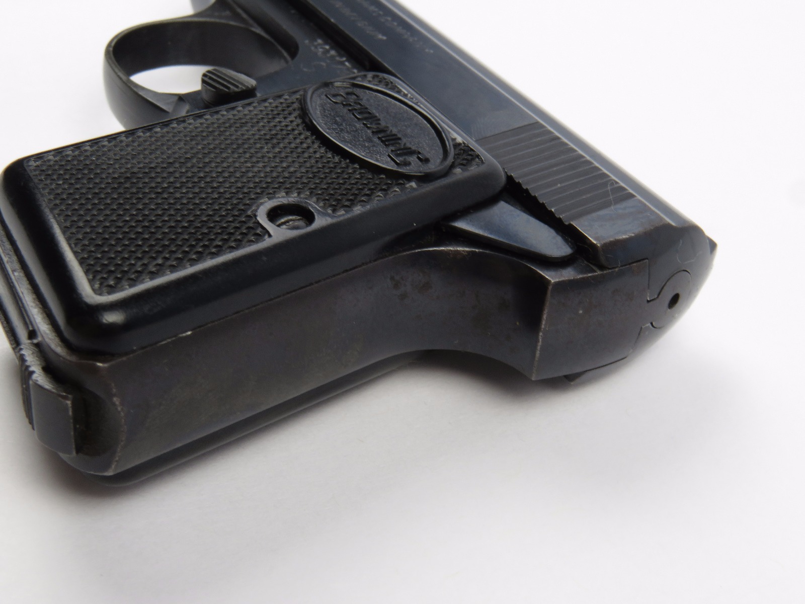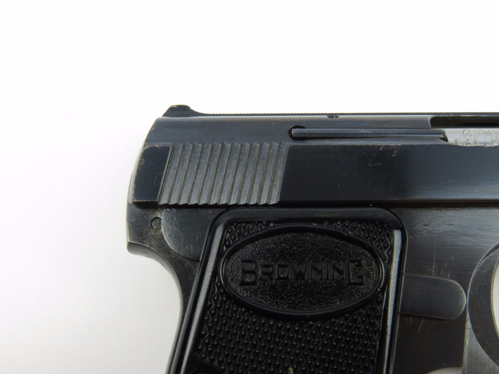 10/17/17 – This is a .25 caliber Browning pistol, also known as the Baby Browning pistol. The pistol was made in Belgium for export to the United States in 1966 (according to the serial number). The pistol is in excellent condition with the only wear being some dark spots in the finish (mostly on the slide). These dark spots in the bluing seem to be some storage wear and very minimal. Overall we rate at about 97%. Fully functional with correct grips and FN stamped magazine. All original and fully functional.