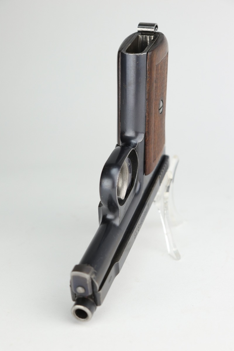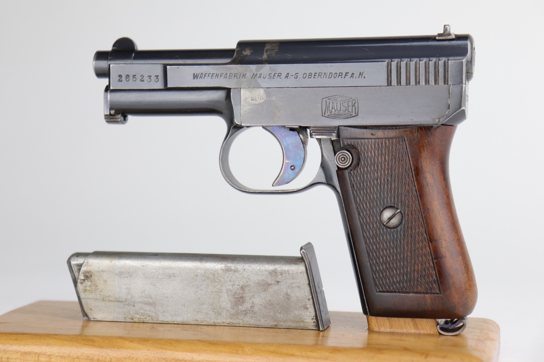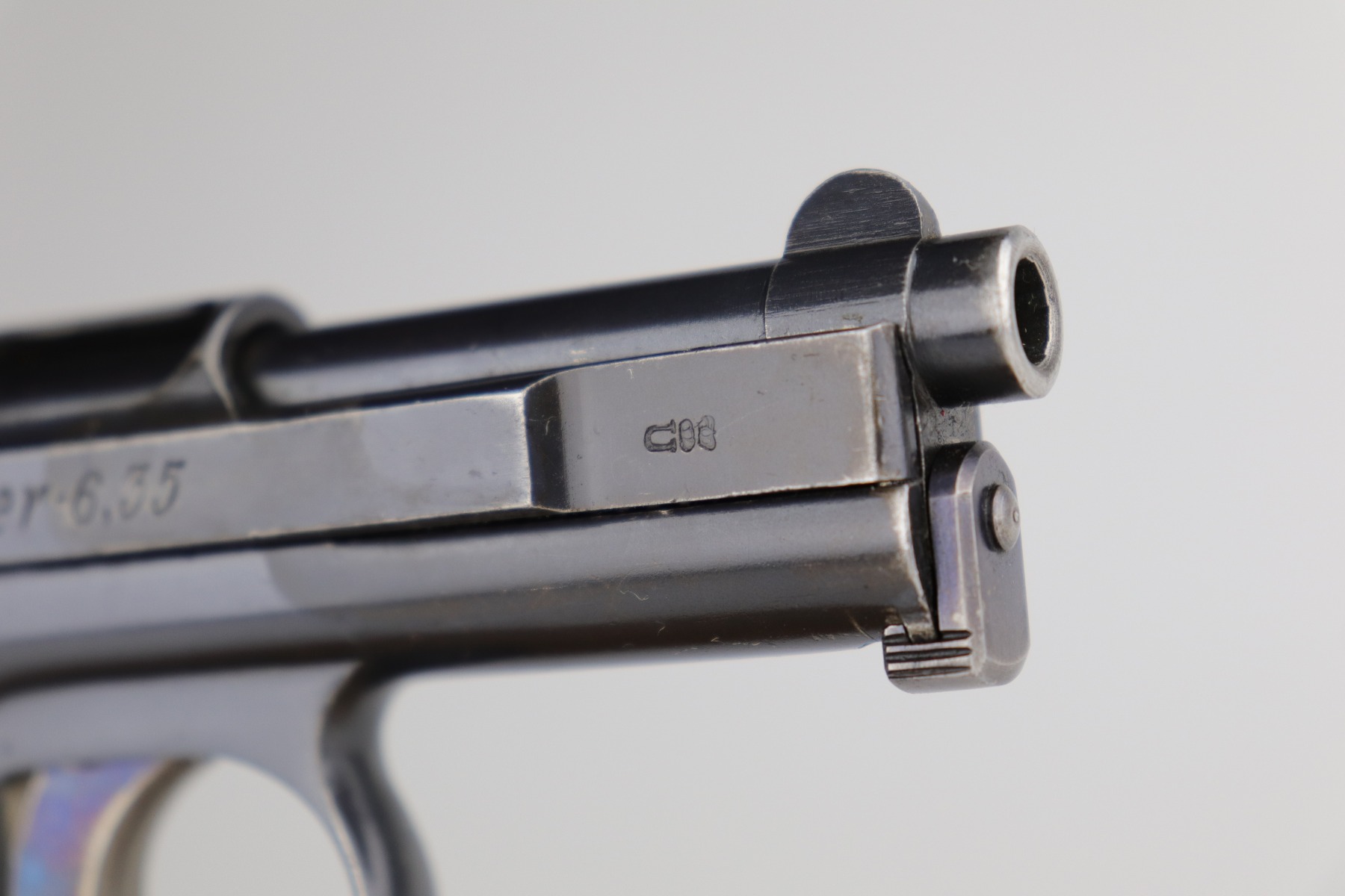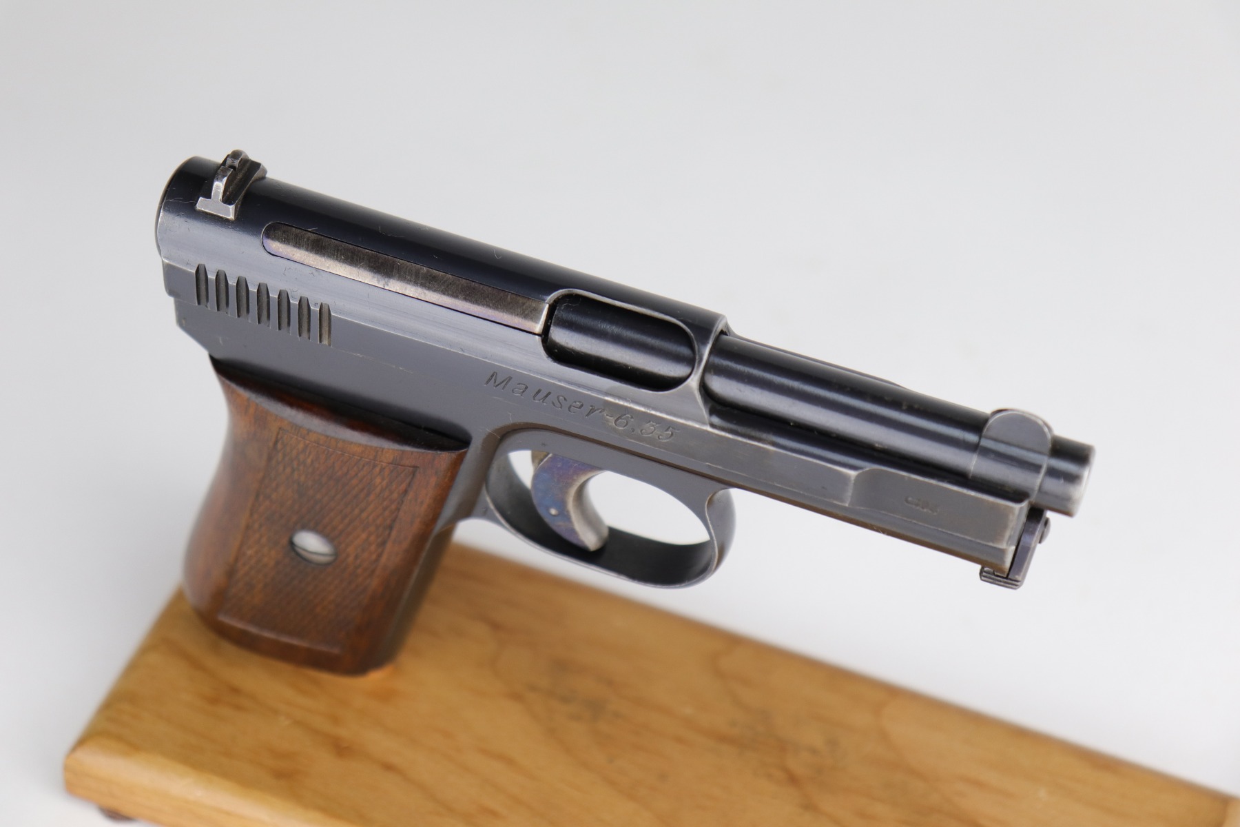 11/3/20 – This is a very nice example of a Mauser Model 1910, manufactured in the 1920’s, chambered in .25 ACP. It is all matching and has a “Germany” export mark, indicating it was likely sold to the international commercial market. It has a “triangle in circle” marking on the tang. As of now, the meaning of this marking is unknown, although some say it has a connection to the Portuguese market. It has retained somewhere between 85 and 90% of its original finish. There is minor muzzle wear and wear on the high edges of the slide. The most noticeable wear is a large area of discoloration that can be seen on both sides and top of the slide. It comes with a very nice period-correct grip and period-correct magazine. The bore has decent rifling, but there is minor pitting throughout.