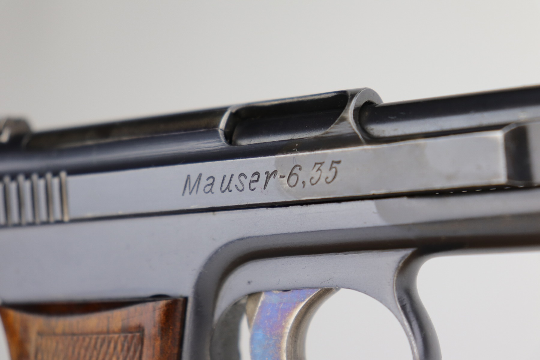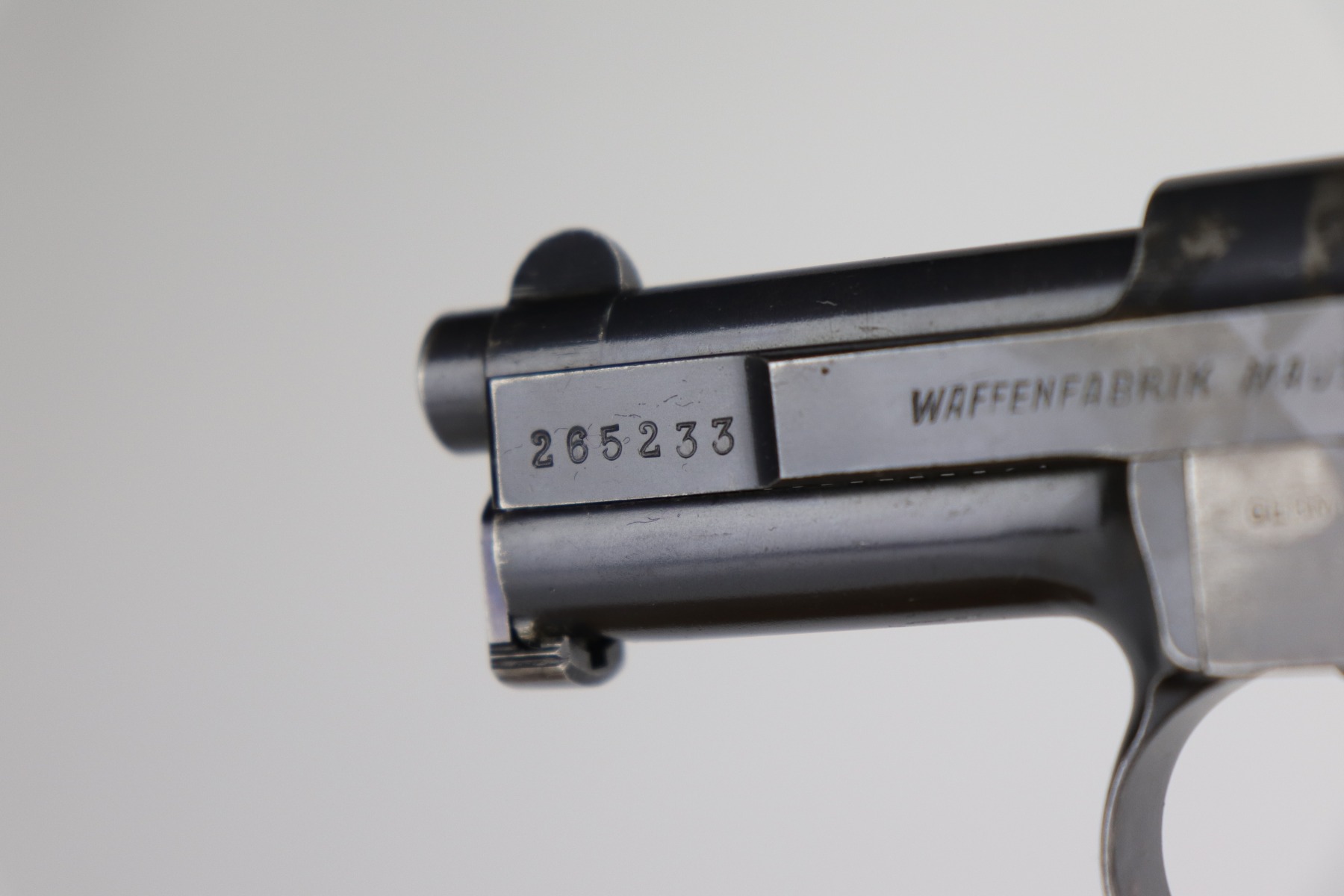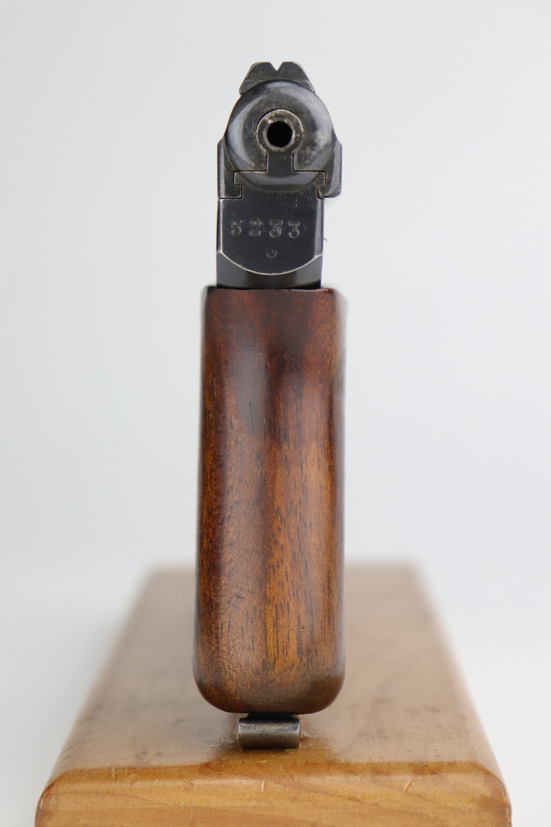 11/3/20 – This is a very nice example of a Mauser Model 1910, manufactured in the 1920’s, chambered in .25 ACP. It is all matching and has a “Germany” export mark, indicating it was likely sold to the international commercial market. It has a “triangle in circle” marking on the tang. As of now, the meaning of this marking is unknown, although some say it has a connection to the Portuguese market. It has retained somewhere between 85 and 90% of its original finish. There is minor muzzle wear and wear on the high edges of the slide. The most noticeable wear is a large area of discoloration that can be seen on both sides and top of the slide. It comes with a very nice period-correct grip and period-correct magazine. The bore has decent rifling, but there is minor pitting throughout.