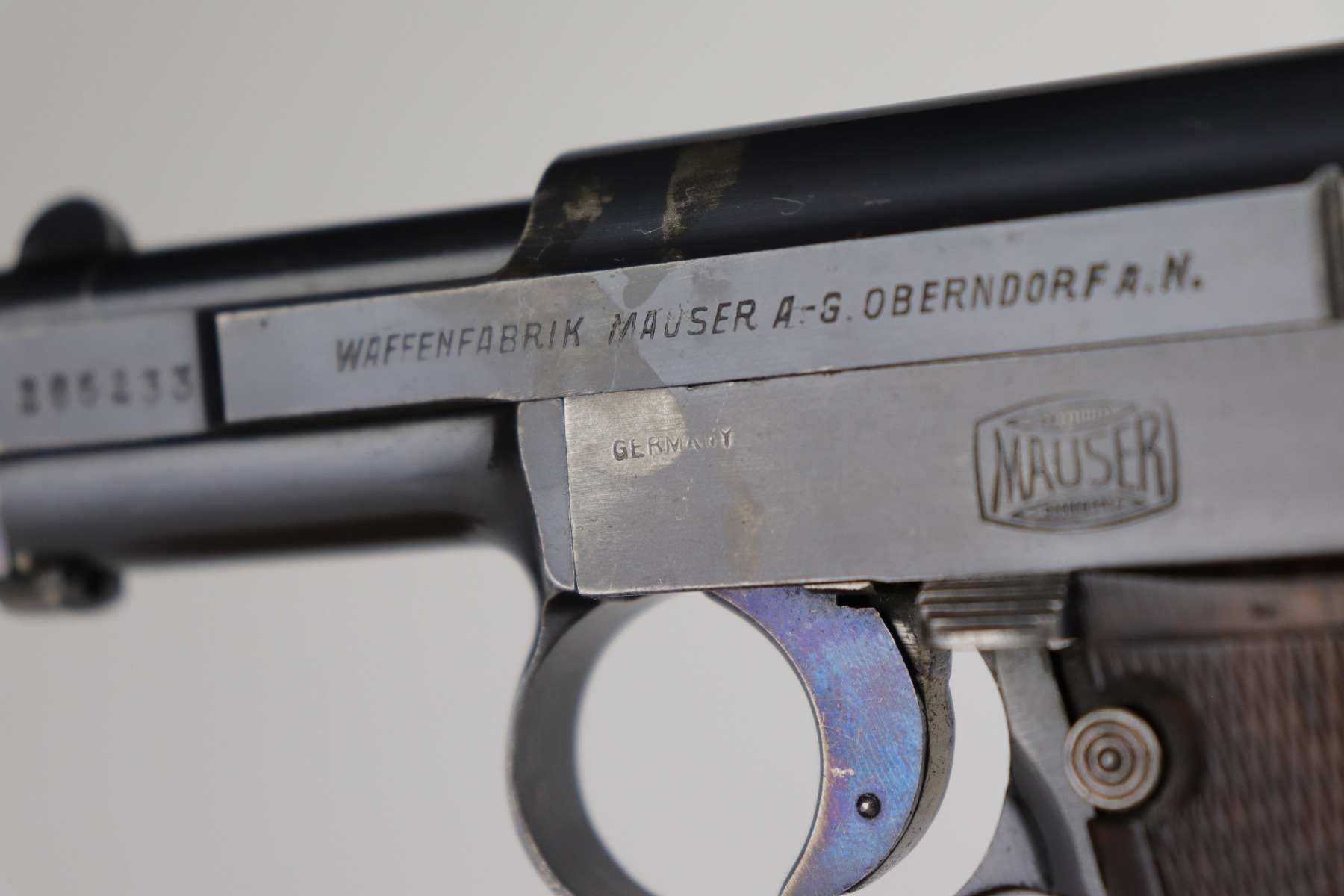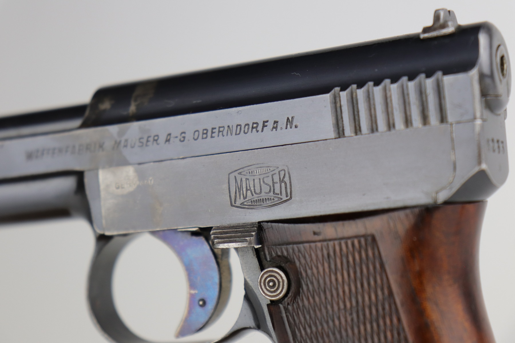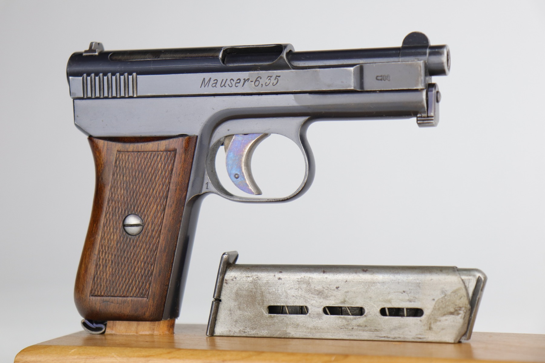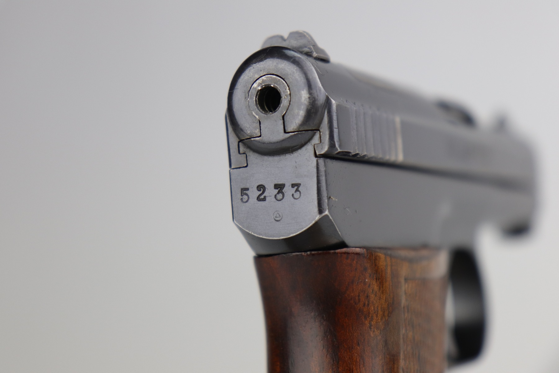 11/3/20 – This is a very nice example of a Mauser Model 1910, manufactured in the 1920’s, chambered in .25 ACP. It is all matching and has a “Germany” export mark, indicating it was likely sold to the international commercial market. It has a “triangle in circle” marking on the tang. As of now, the meaning of this marking is unknown, although some say it has a connection to the Portuguese market. It has retained somewhere between 85 and 90% of its original finish. There is minor muzzle wear and wear on the high edges of the slide. The most noticeable wear is a large area of discoloration that can be seen on both sides and top of the slide. It comes with a very nice period-correct grip and period-correct magazine. The bore has decent rifling, but there is minor pitting throughout.