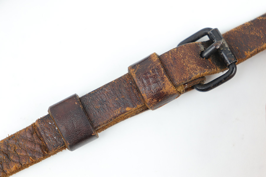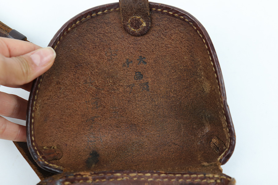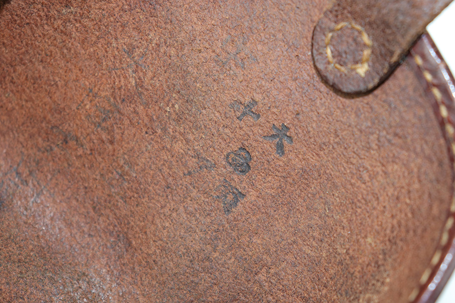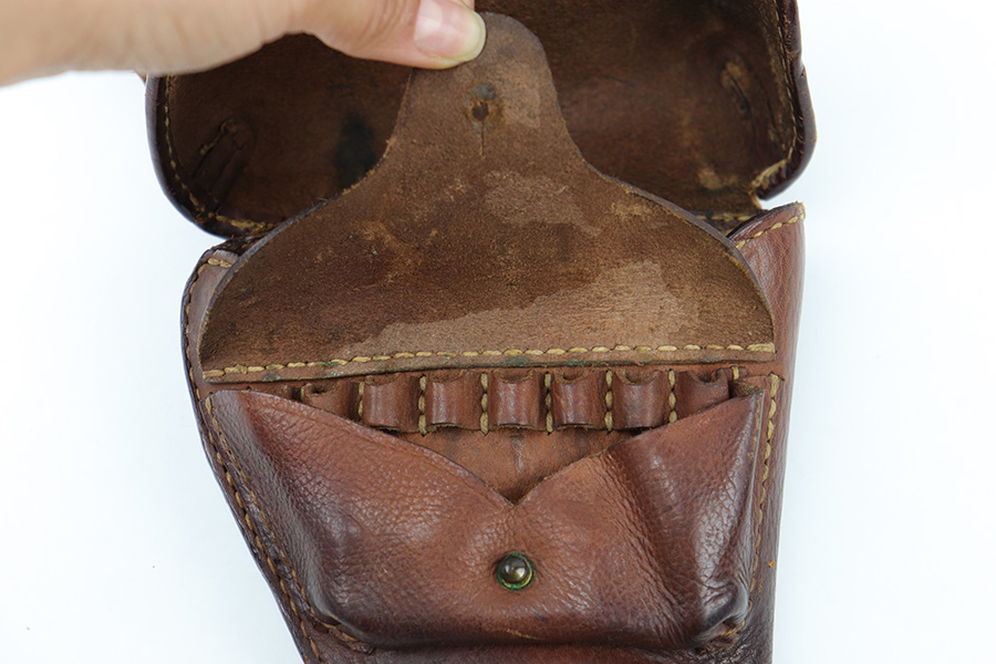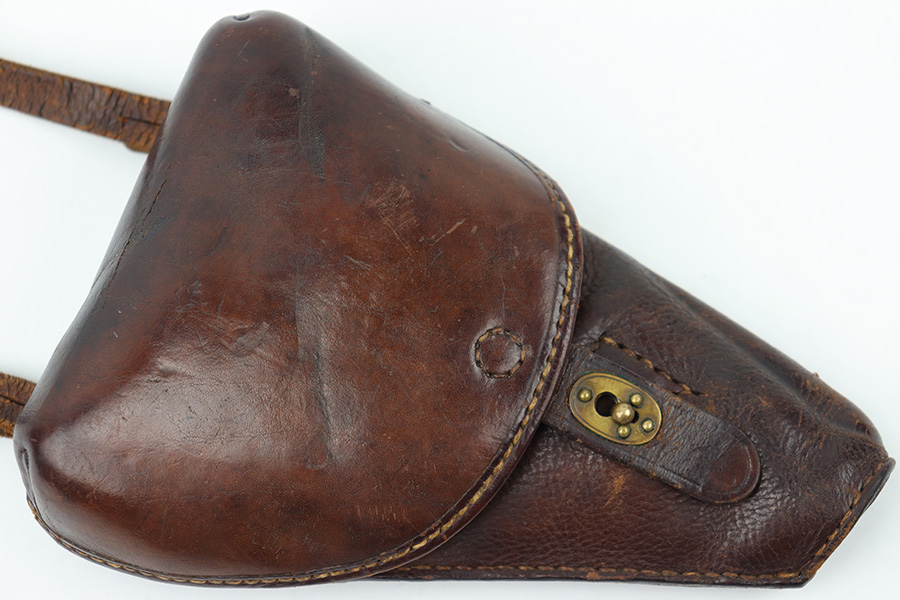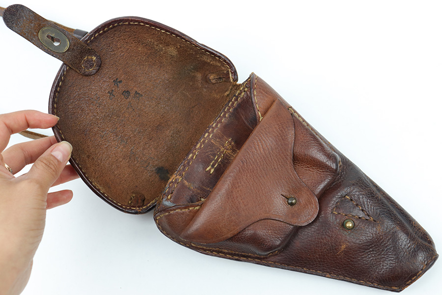 4/4/23 – This is an extremely rare, all original leather holster for a Baby Nambu pistol. The holster is a soft-flap 2nd variation style with an original leather shoulder strap attached. Also comes with an original Baby Nambu cleaning rod. The holster is in great overall condition with very nice leather that has normal pliability and some typical surface wrinkling on the front exterior leather. The interior lid has a manufacturer’s ink stamp as shown. The interior leather is clean throughout, including the leather ammunition pouch with individual loops for holding spare rounds of ammo. This pouch is excellent internally and externally. The stitching is all original, however there are a few loose and missing stitches on the back where the lid attaches to the main body of leather. Otherwise the stitching is excellent. The shoulder strap has surface wrinkling and light cracking throughout, but this isn’t deep into the leather and overall the shoulder strap is in great shape. The cleaning rod has a nickel finish and is in excellent condition. Measures about 13.5cm long.