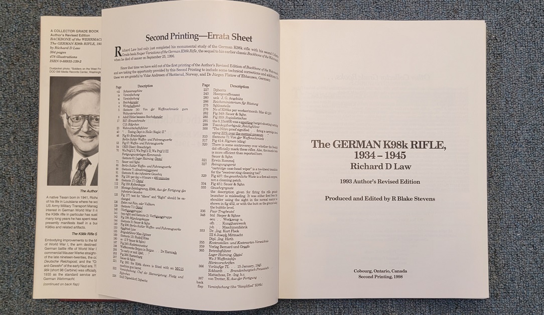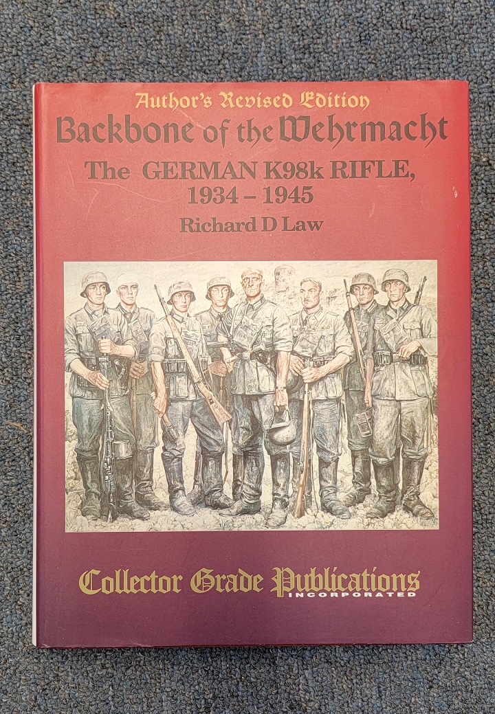 4/6/23 – This is an excellent, lightly used copy of “Backbone of the Whermacht German K98K Rifle, 1934-1945” by Richard D. Law. 2nd printing, 1998. The book is an excellent resource for K98 collectors. All pages are clean and crisp. Original cover sleeve intact.