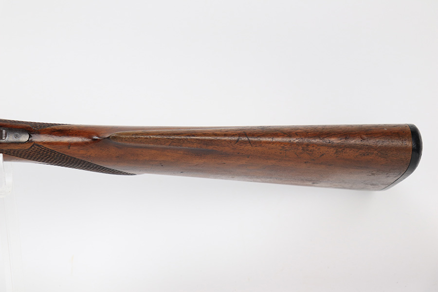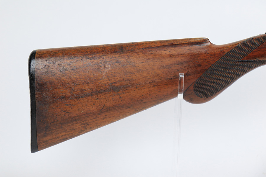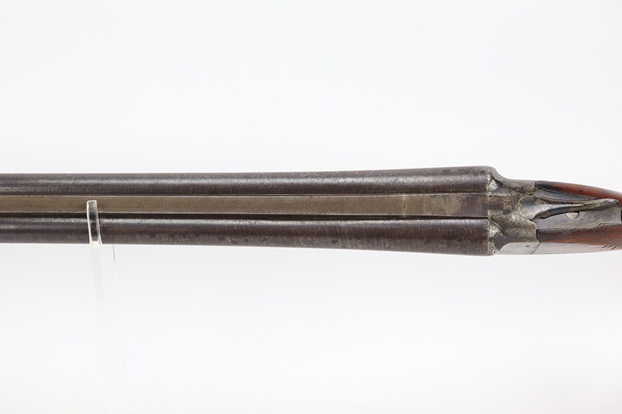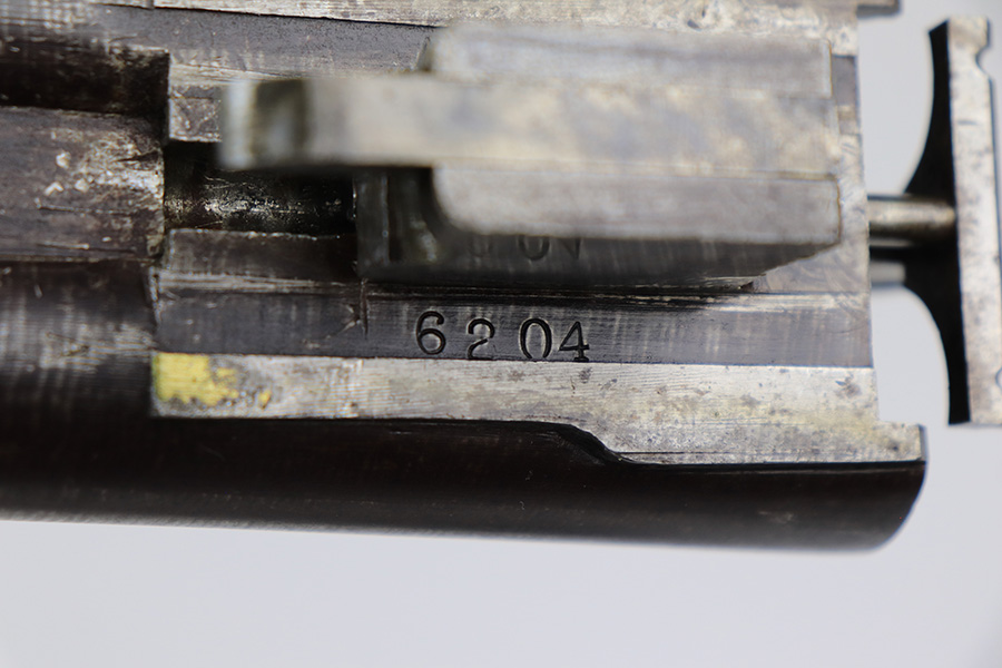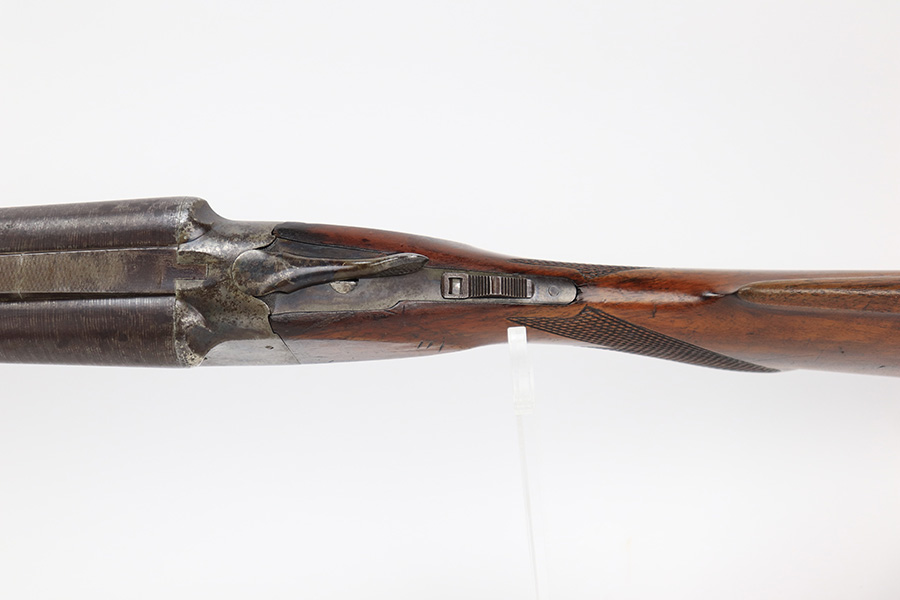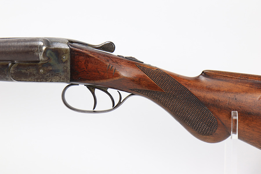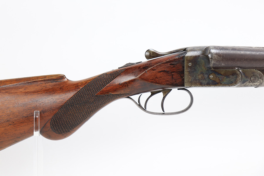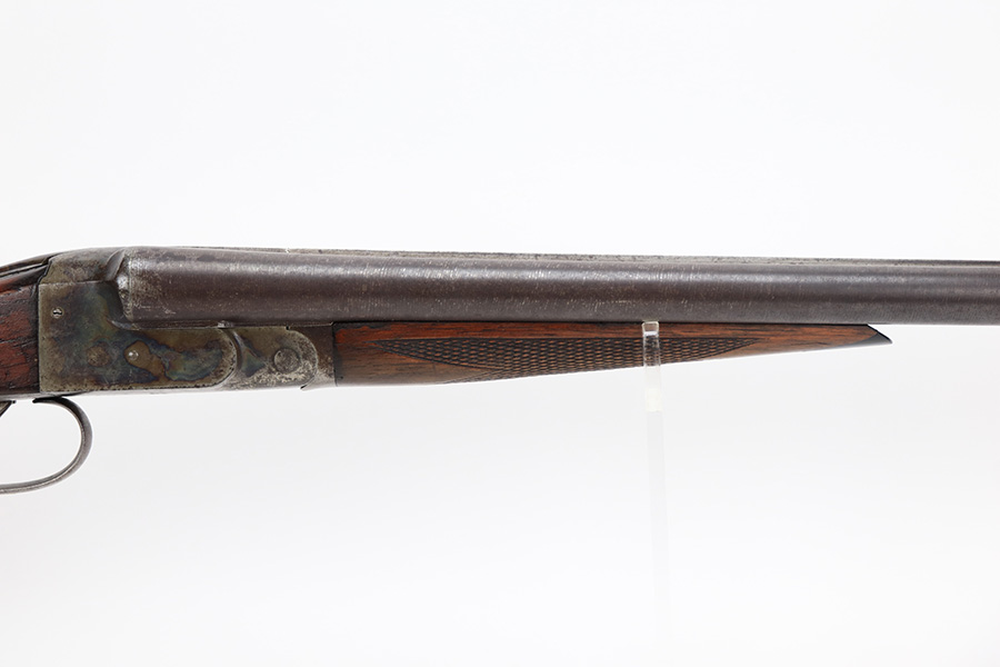 6/7/23 – This is a nice example of a Baltimore Arms Model 1904 Side-by-Side Shotgun, manufactured in the early 1900’s and chambered in 12 GA. All matching. The barrels are Damascus steel, and the receiver is case-hardened. There is thinning on the underside of the receiver and on the trigger guard, but there isn’t a ton of actual finish loss overall. However, there is noticeable brown “attic” patina and spotty oxidation throughout. The Damascus patterning on the barrels is still intact, and the case colors on the receiver are mostly visible under the spotty oxidation. The wood furniture is nice overall, but there are minor scratches throughout and a few small notches on the left side of the stock. Black bakelite butt pad is intact. Minty, shiny bores. Fully functional.