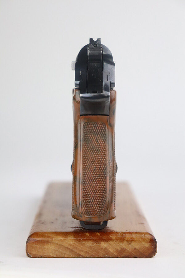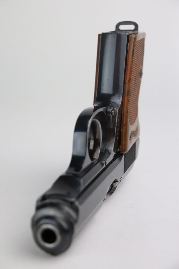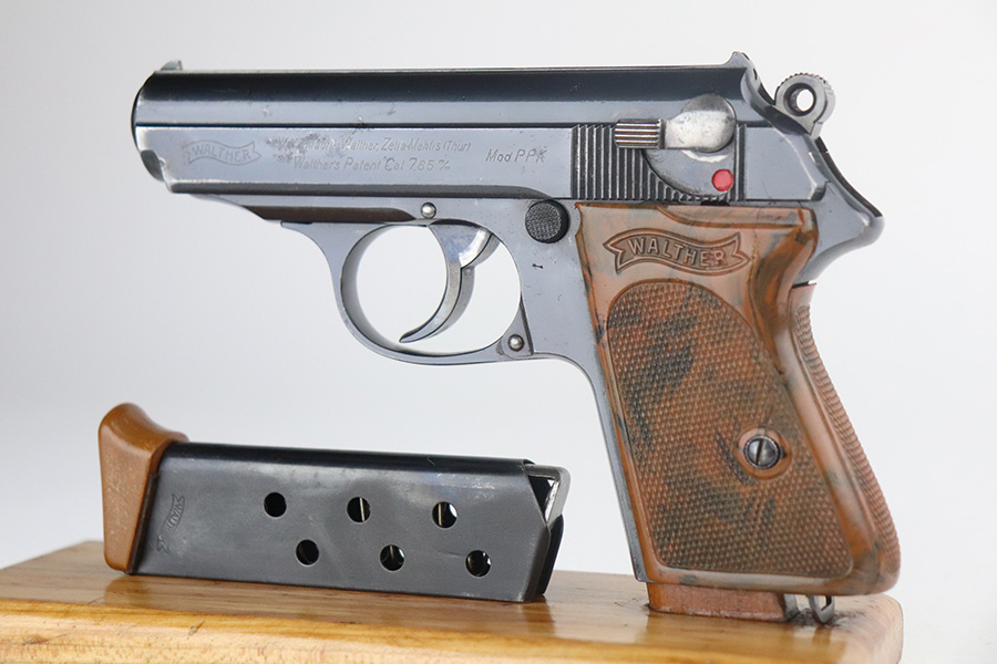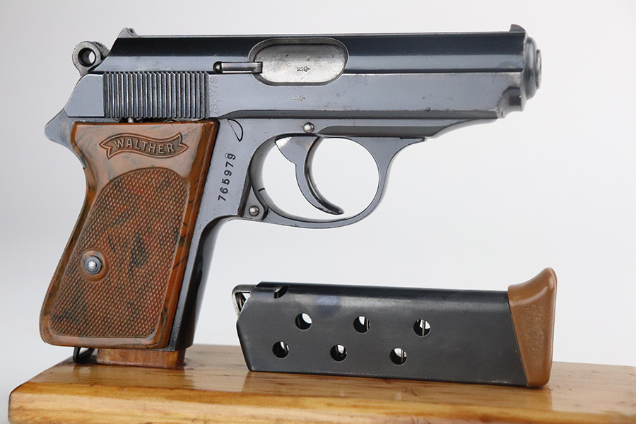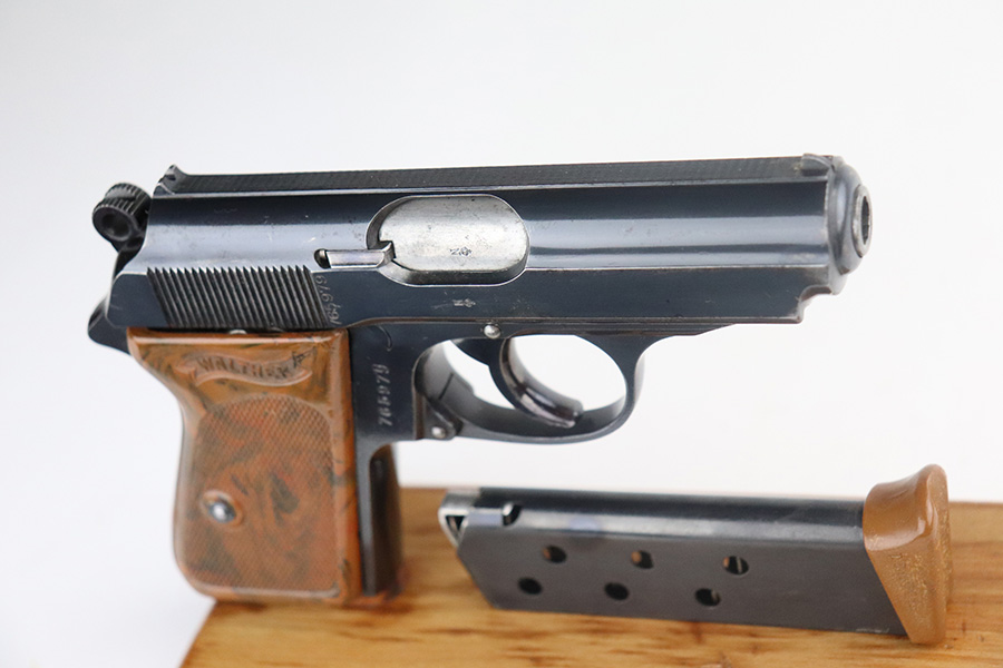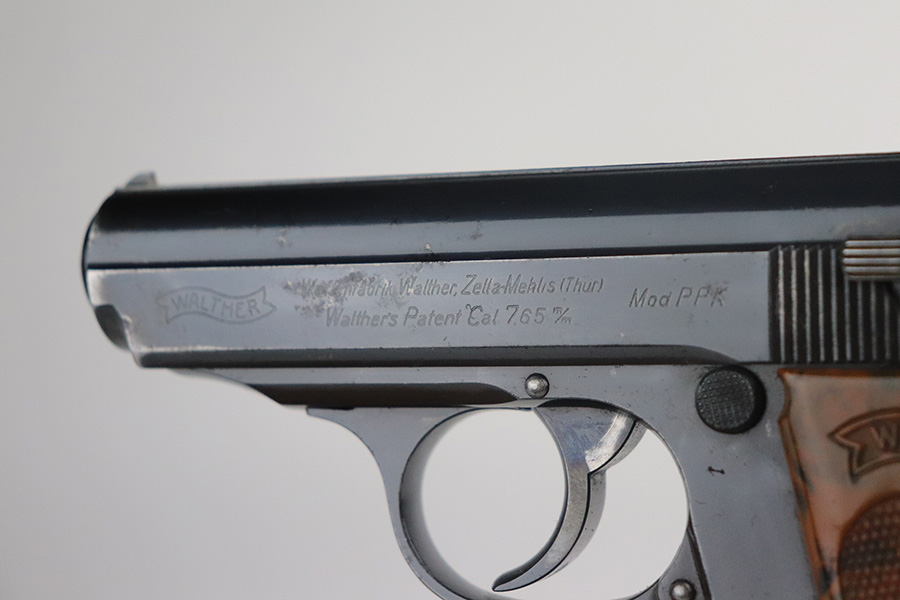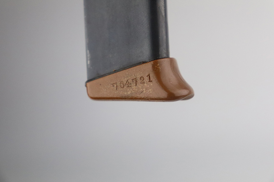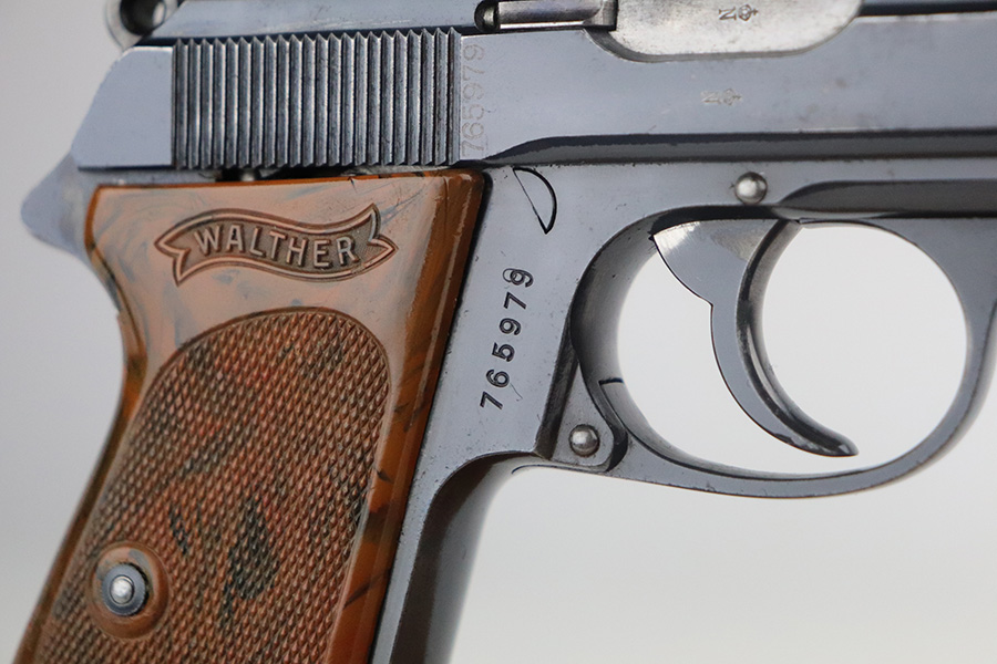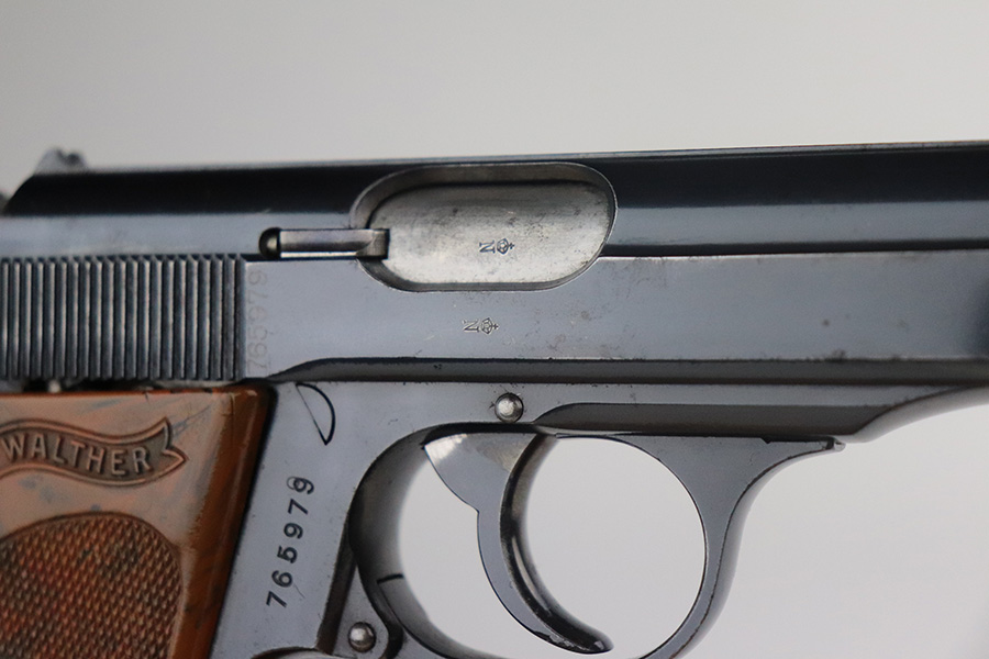 7/13/21 – This is an excellent example of a Walther PPK that was issued to the Third Reich banking system. It is all matching and has the correct panographed slide serial number. It also comes with a proper bank-issued finger extension magazine that is not matching but fairly close in serial number. The gun has retained about 97-98% of its original high polish finish. There is minor wear on the high edges of the slide and around the muzzle. While there isn’t much actual finish loss, there are spots of oxidation along the slide. Comes with an excellent brown Walther grip – one repaired hairline crack on the left side. Mint bore. There is an interesting factory double-stamp on the “9” in the serial number.