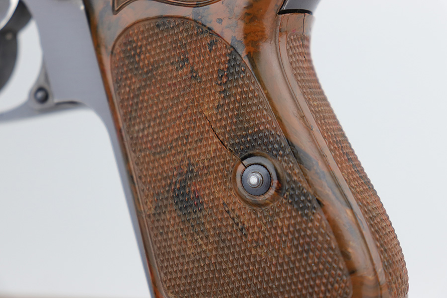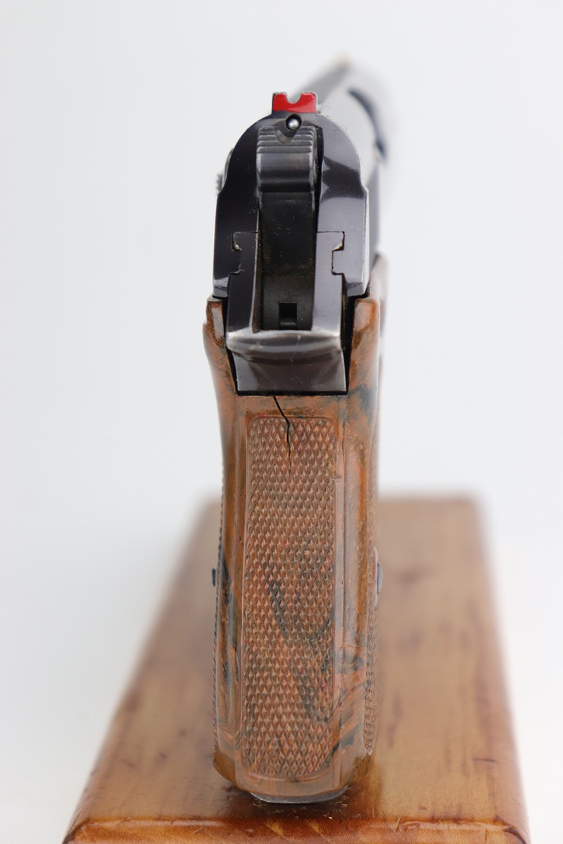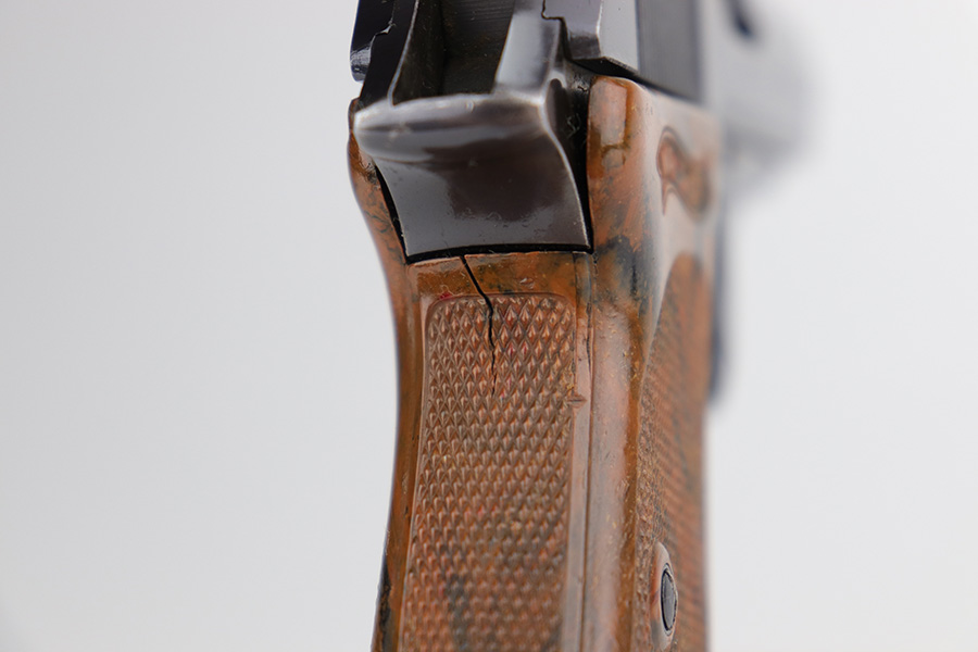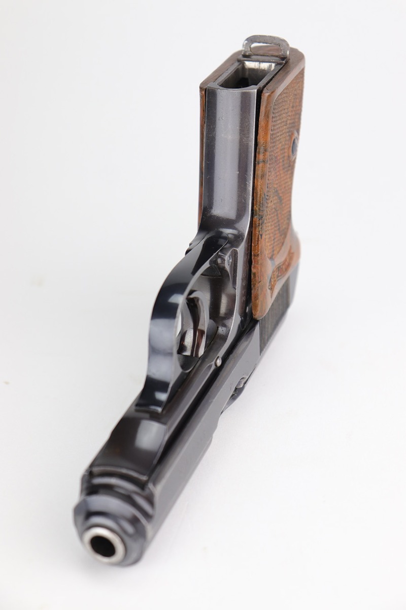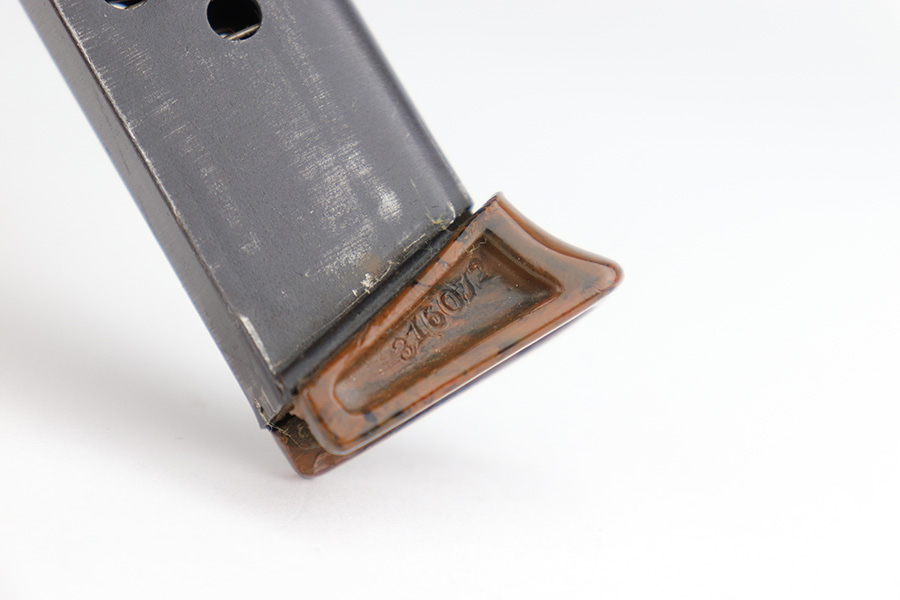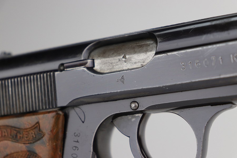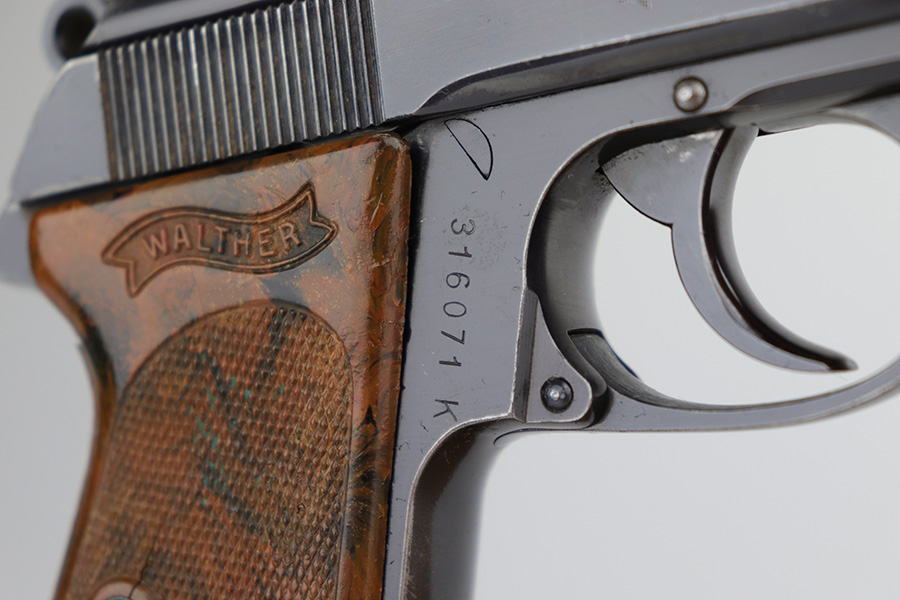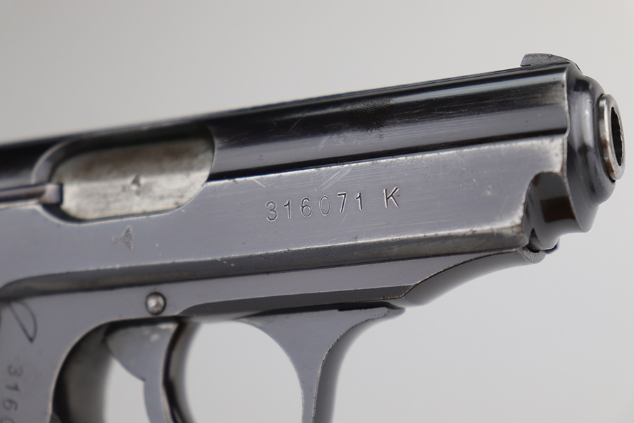 1/10/23 – This is an excellent example of a Walther PPK that was issued to the Third Reich banking system. It is all matching, has the characteristic painted sights, and has the correct post factory-numbered slide. It also comes with a proper bank-issued finger extension magazine that is not matching but only one number away! The gun has retained about 96% of its original high polish finish. There is minor muzzle wear, some very minor thinning on the front strap, and some light wear along the right side of the slide concentrated mostly around the high edges. Fitted with a nice period-correct brown Walther grip – small cracks around the screw hole on both sides and a small crack on the spine. The bore is like-new.