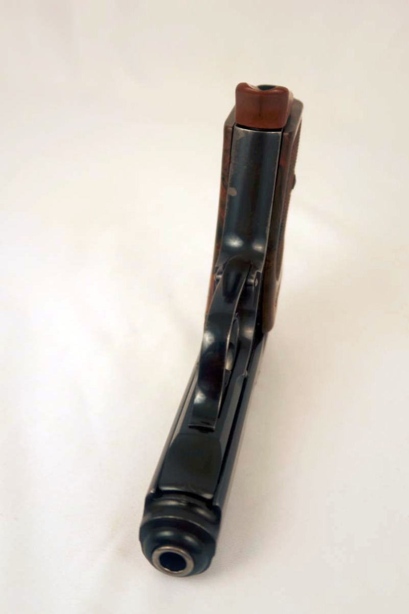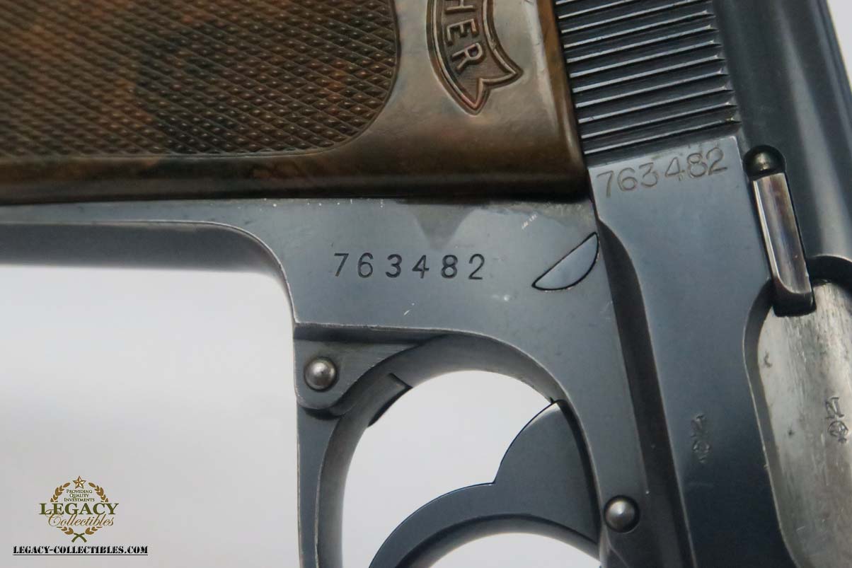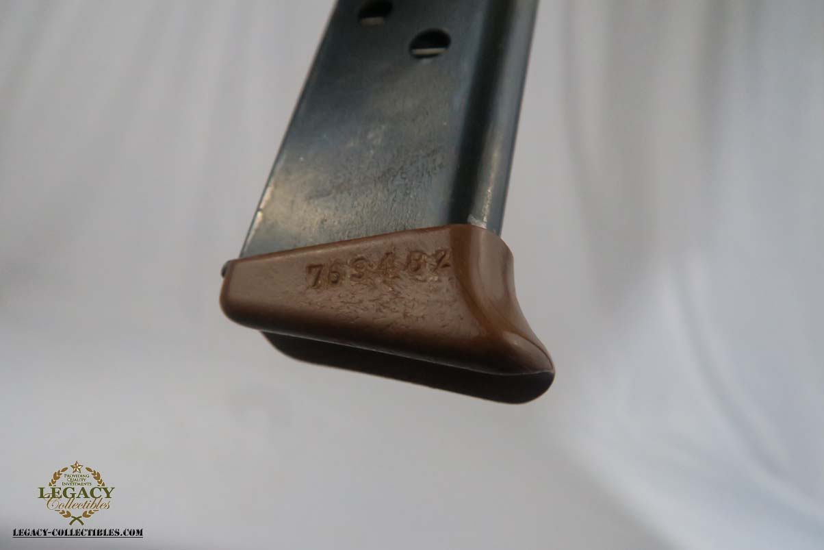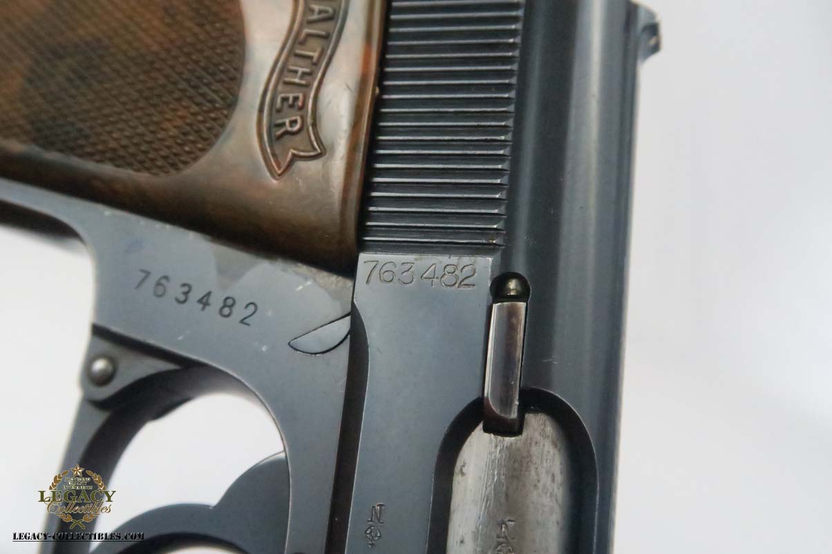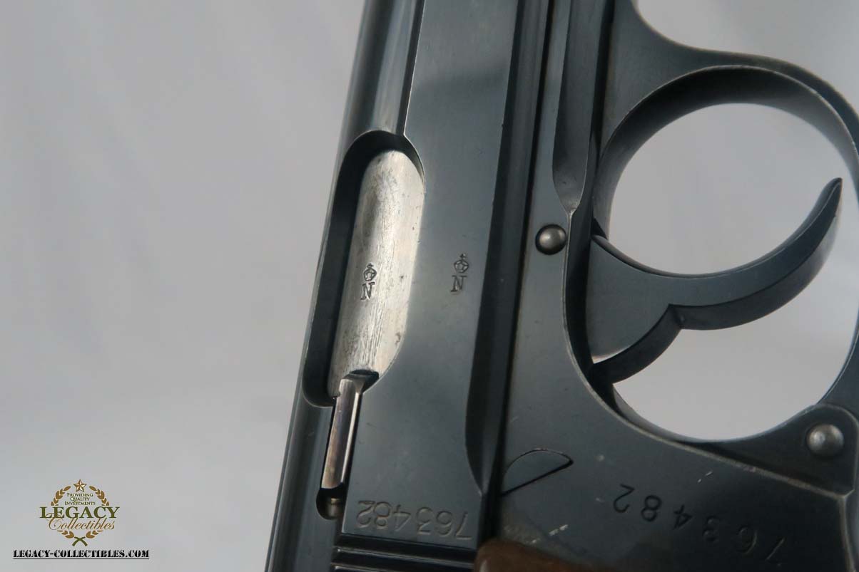 7/3/18 – This is a bank issued Walther PPK with two matching magazines! It was manufactured in 1931 during the Nazi era. These bank guns had the pantographed slide serial number and magazine numbered in the extension. The original finish is about 93-94%, with most of the wear on the front strap. All matching parts and crown/N proofs. The bore is excellent and shiny. Very rare to find a Bank PPK with two matching magazines!