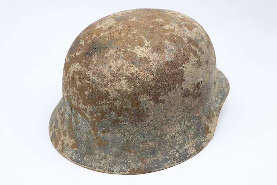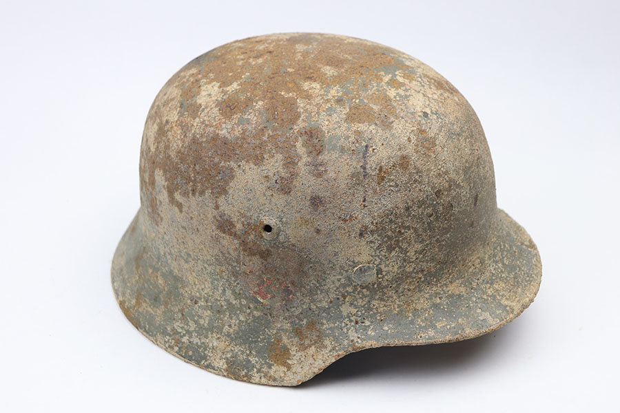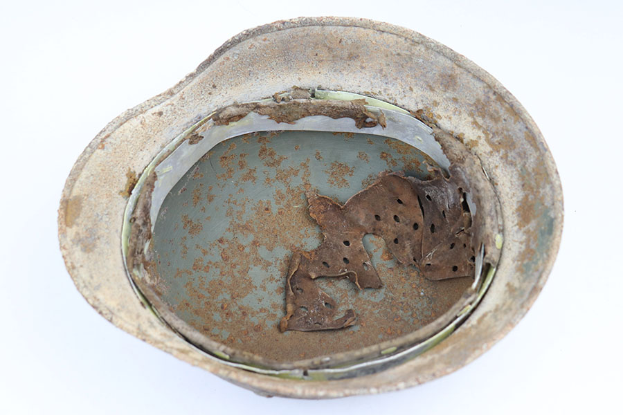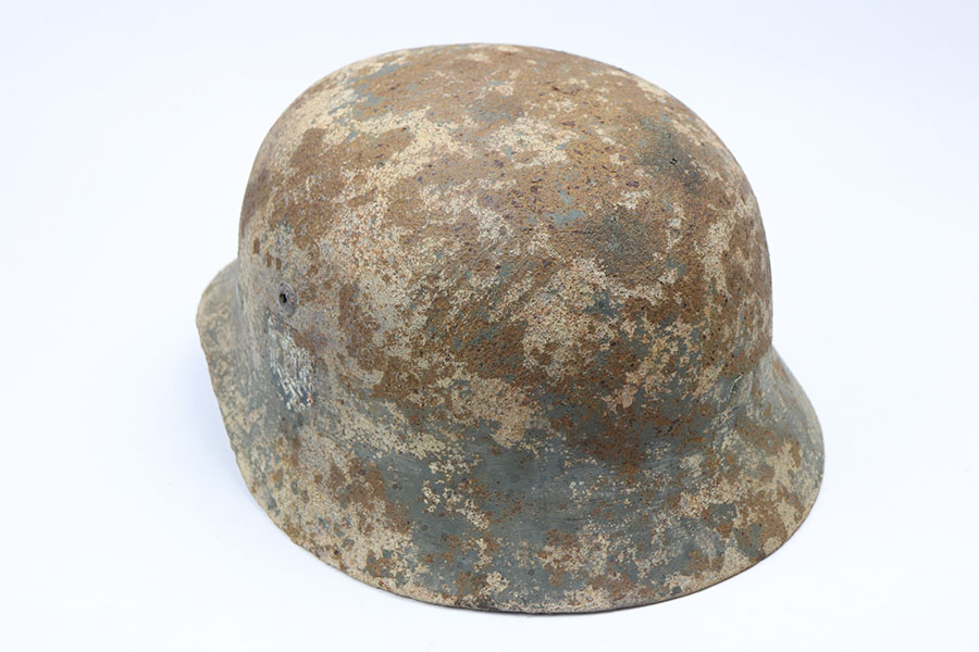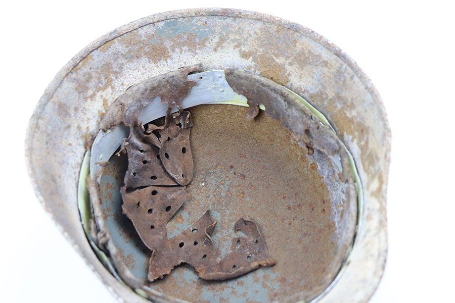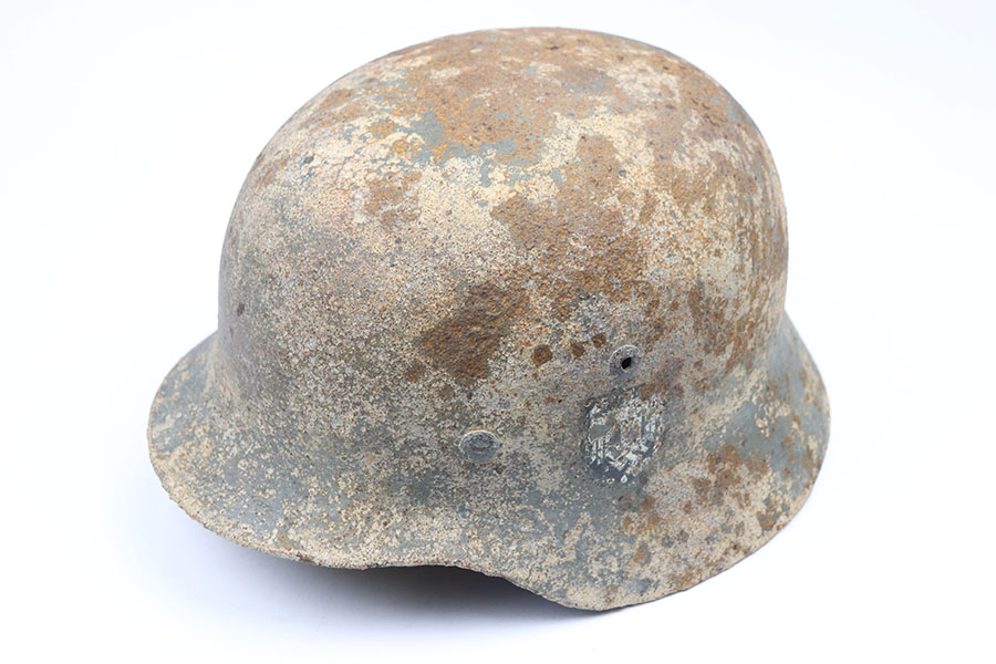 3/18/21 – This is an original M40 nazi helmet from WW2. The helmet is reportedly a battlefield find at the battle of Stalingrad on the Eastern front. There is no provenance to accommodate this story, but the helmet does show evidence of having white colored paint / camouflage, which would be fitting for Stalingrad. The helmet is clearly worn and rusted, as shown in photos with only a small amount of the liner in tact. The two decals are visible but very worn as well. See photos.