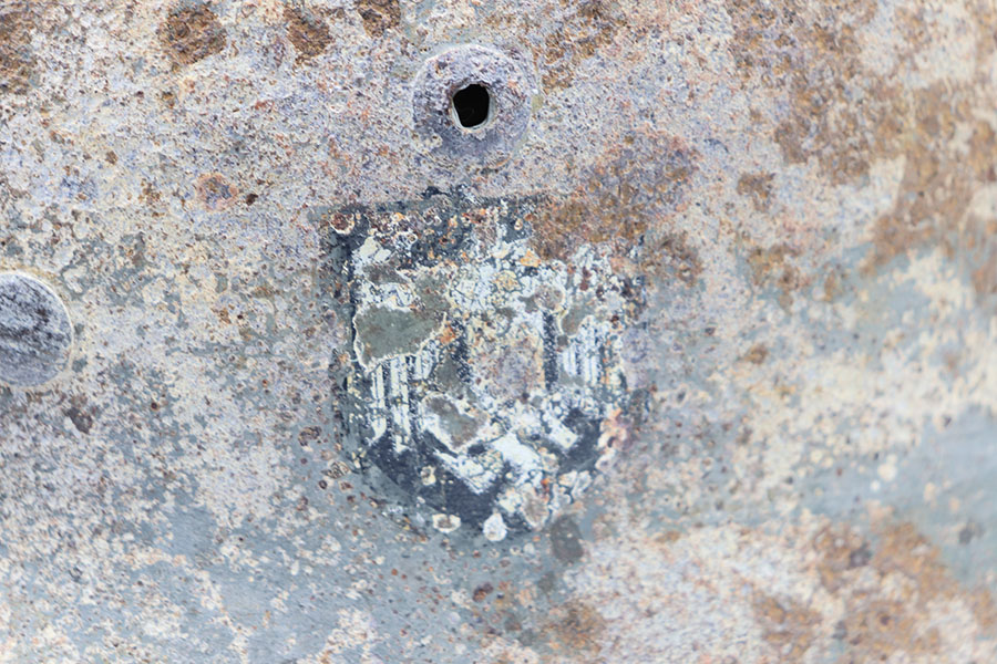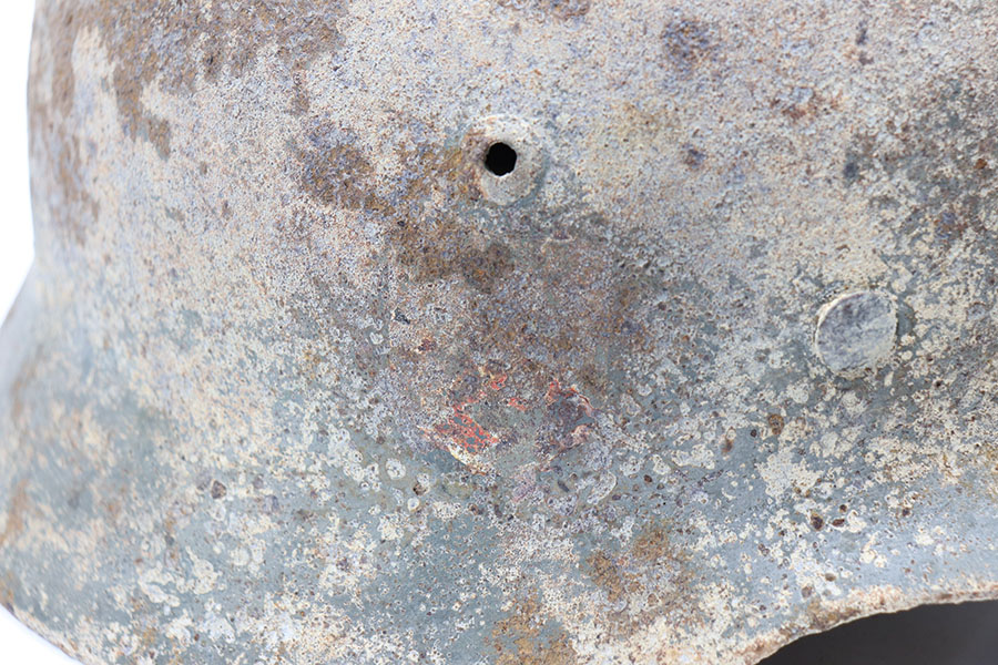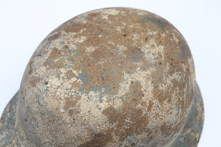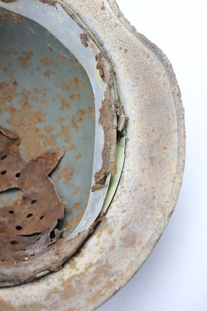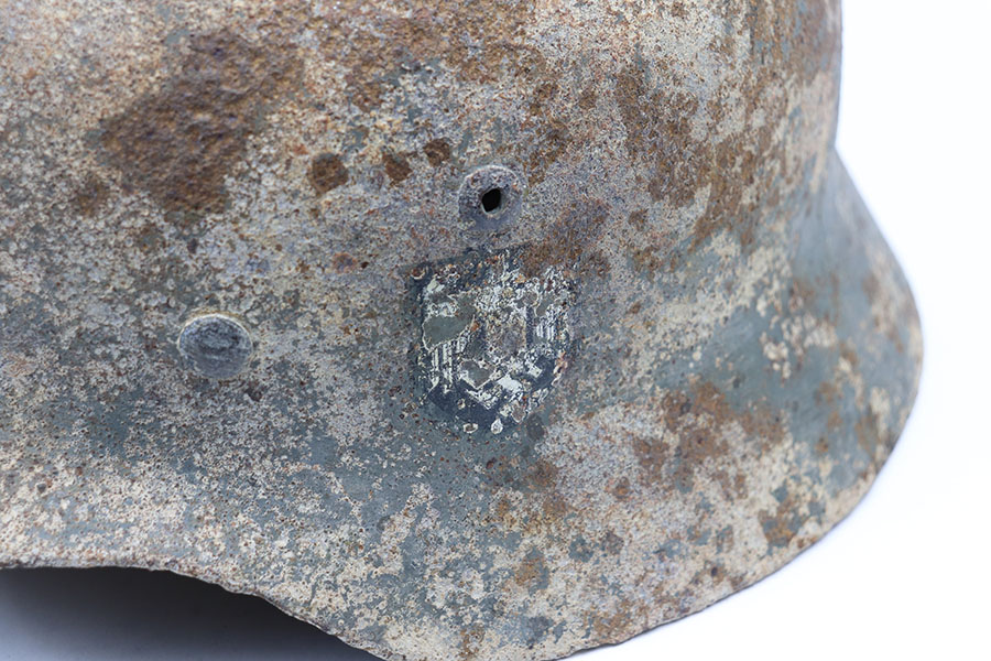 3/18/21 – This is an original M40 nazi helmet from WW2. The helmet is reportedly a battlefield find at the battle of Stalingrad on the Eastern front. There is no provenance to accommodate this story, but the helmet does show evidence of having white colored paint / camouflage, which would be fitting for Stalingrad. The helmet is clearly worn and rusted, as shown in photos with only a small amount of the liner in tact. The two decals are visible but very worn as well. See photos.
