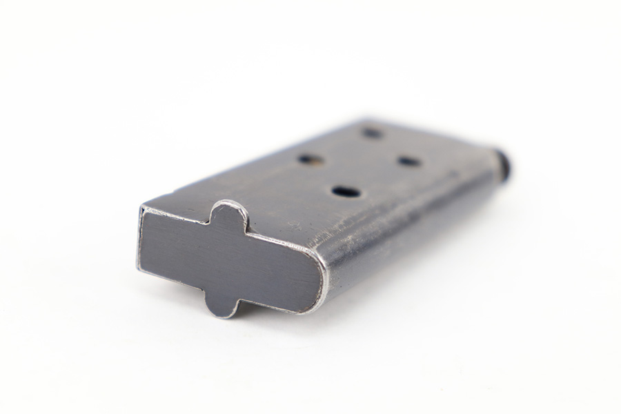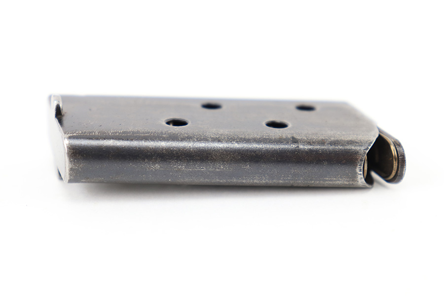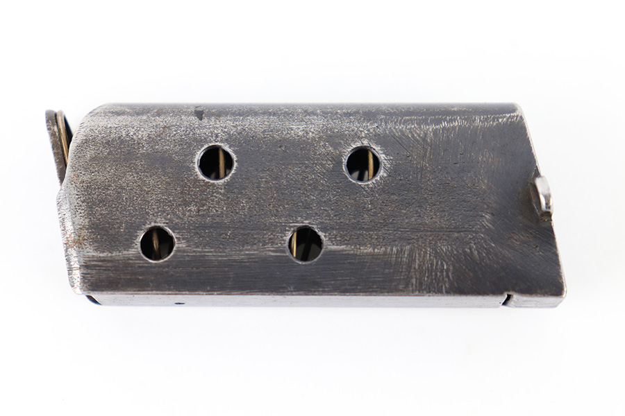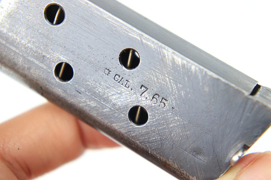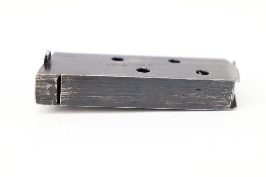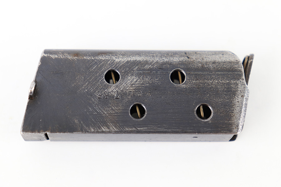8/11/23 – This is an original WW1 era production Bayard M1908 pocket pistol magazine. The magazine is in great overall condition with some natural aging and surface patina, but no major issues. The spring is strong and functional. The left side of the tube is stamped “Cal. 7,65” with no other markings.