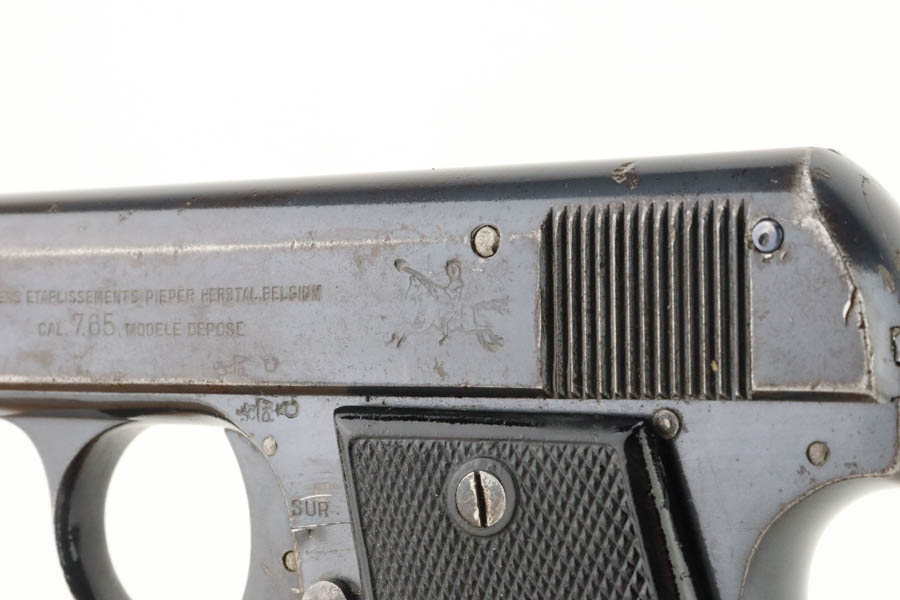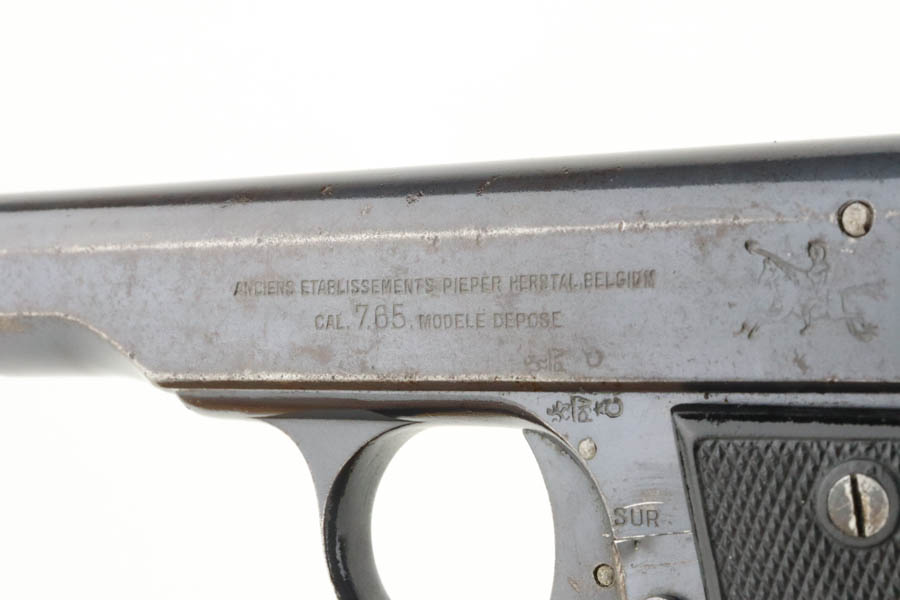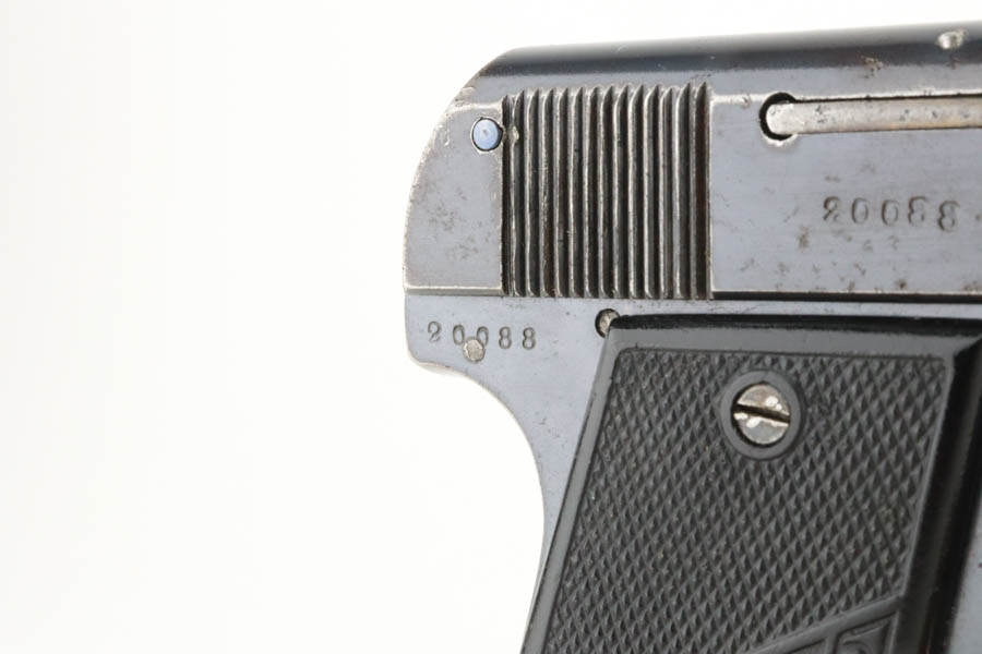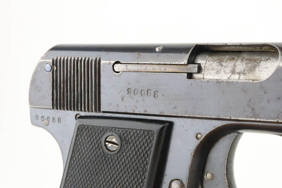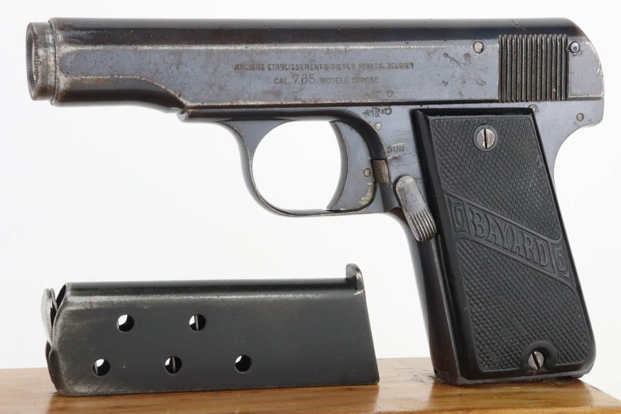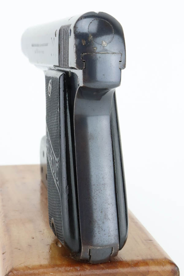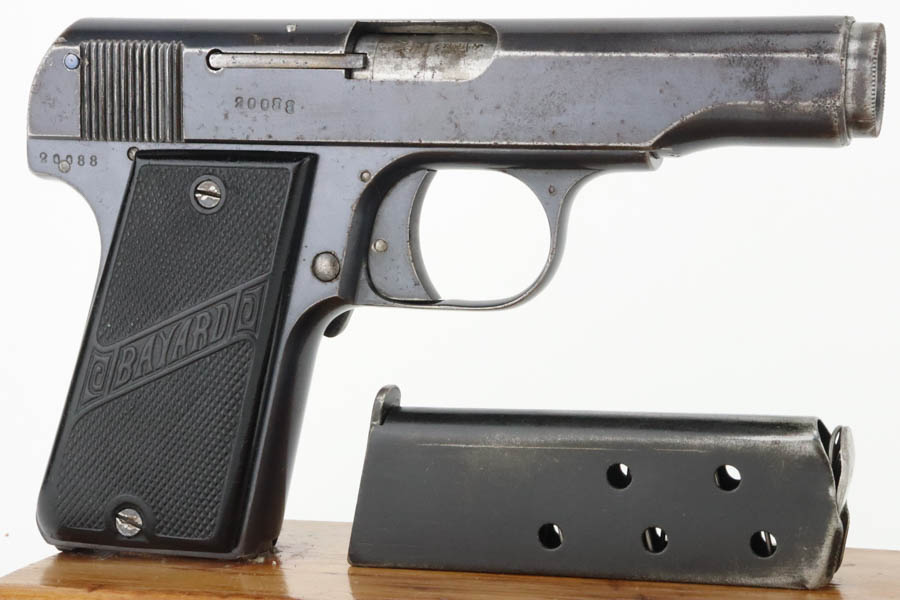 6/4/24 – This is a nice example of a Bayard Model 1923, chambered in 7.65mm. All matching with the proper Belgian proofs. It has retained about 90% of its original finish. While there isn’t much actual finish loss, there is light spotty oxidation throughout and some areas of minor pitting. Fitted with black plastic grips and comes with one magazine. Excellent bore with strong rifling.