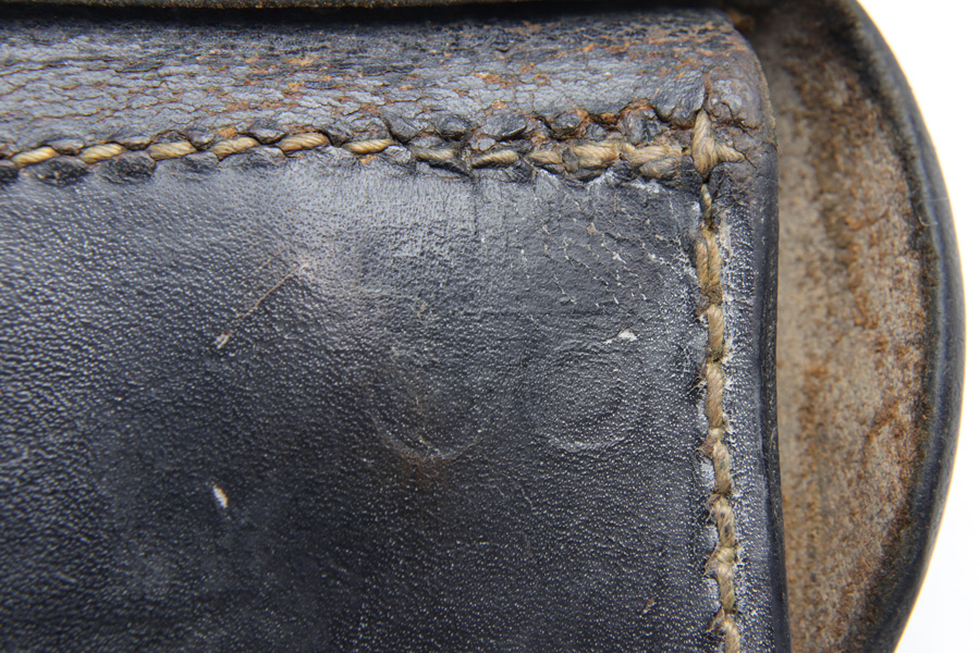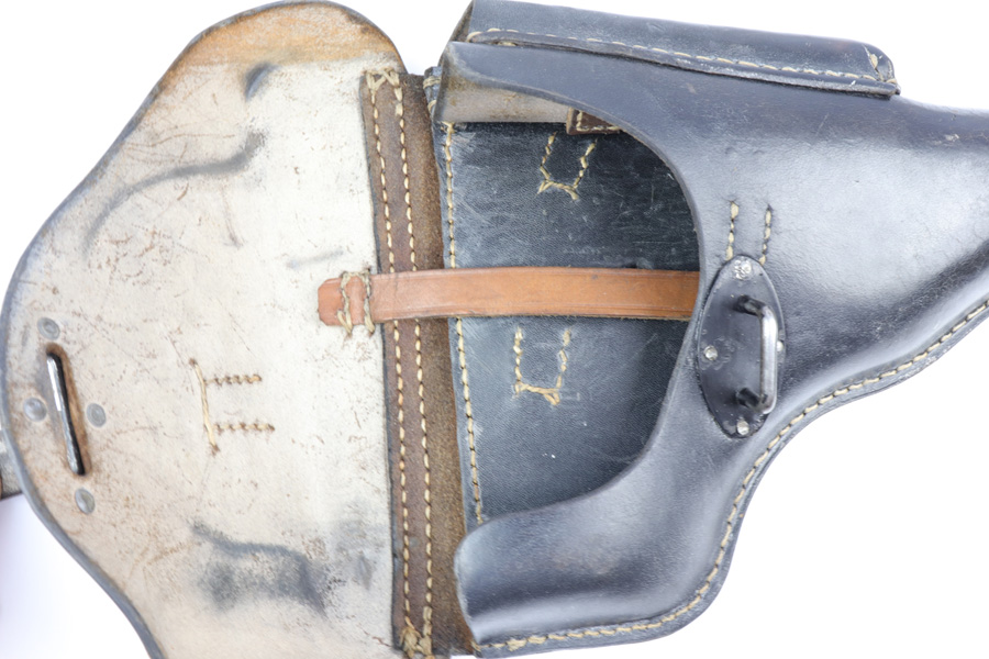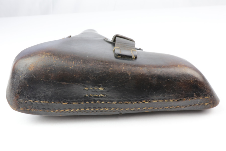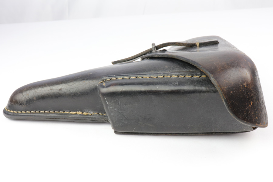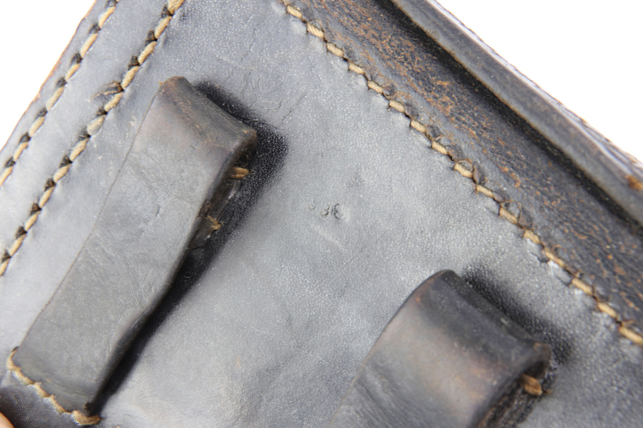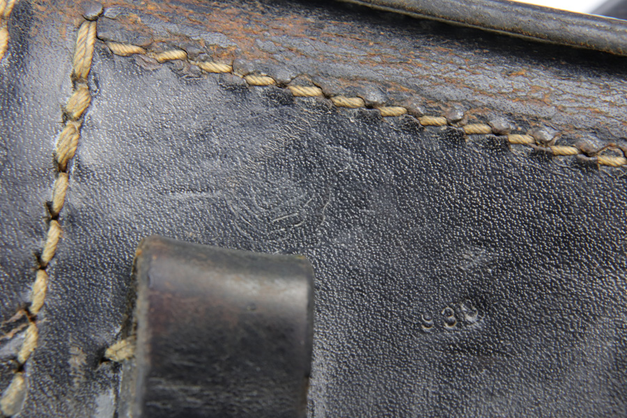 10/29/18 – This is an original WW2 production P.38 holster. The back of the holster is stamped with a “Bearskin Oakleaf 9” maker stamp. The base of the oak leaf has the date, 1943. This is a fairly scarce & desirable maker. The stamp is faint, as is the P.38 stamp on the back leather. The waffen eagle is barely visible as well, but looks like the waffen code is “WaA938”. Very nice leather and stitching with no major issues, guaranteed original and authentic.