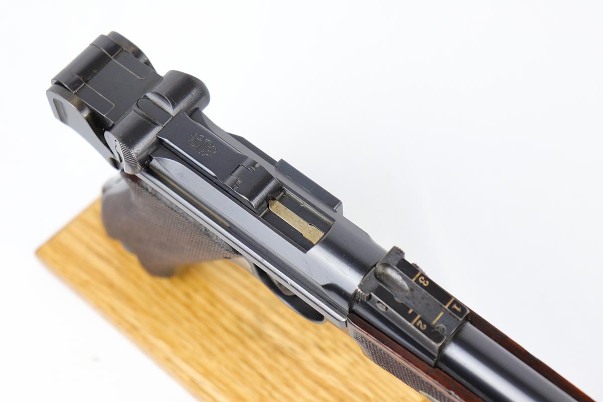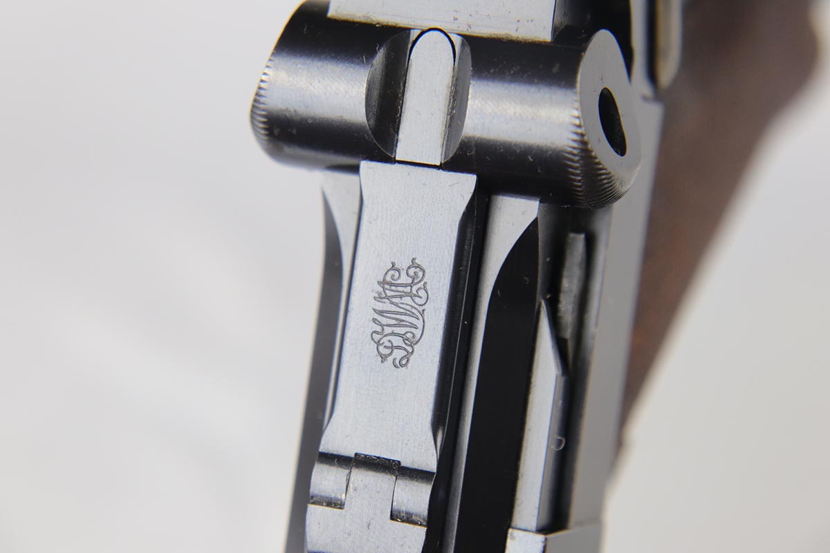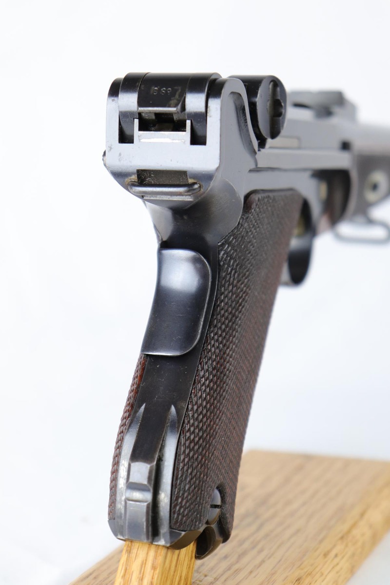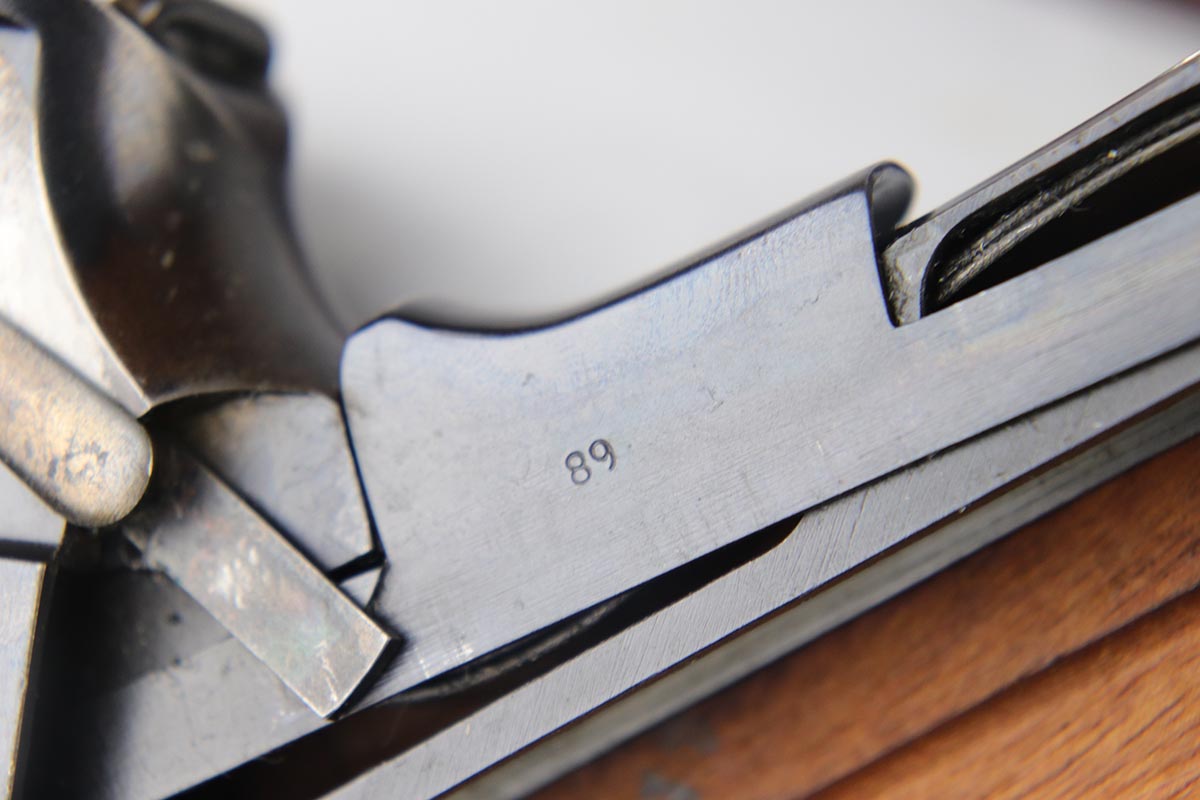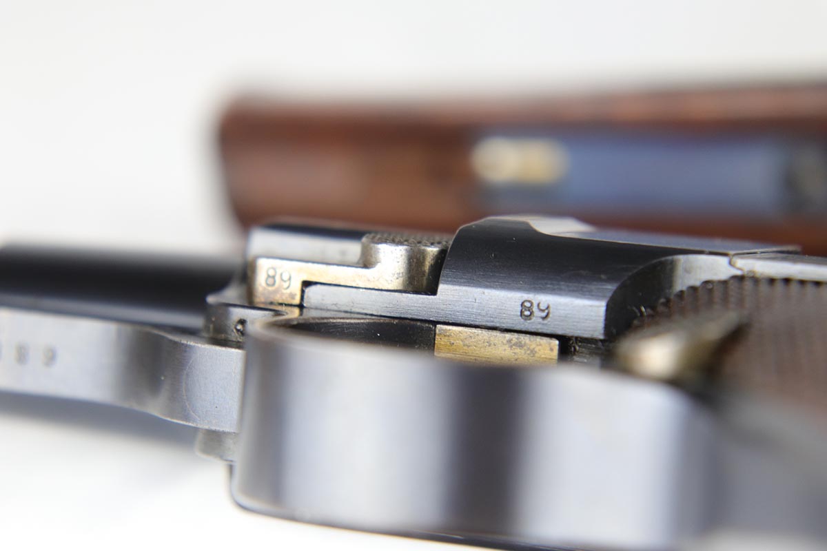 5/30/18 – This must be one of the best preserved Luger carbines in existence – an early gun in 98-99% original condition with just a hint of wear on high edges and a couple of tiny freckles here and there that are too small to show in the photographs. The 1902 Carbine was DWM’s solution to a light hunting rifle. Chambered in potent .30 luger cartridge with a detachable shoulder stock, the Luger carbine made for a compact, yet respectable alternative to the standard light sporting rifles of that era. Due to high cost, very few were made – 2500 in all – and some were either presented or purchased by the famous people of the day: Teddy Roosevelt and a President of Mexico included. This particular gun is all matching, including the shoulder stock that is also in excellent condition with a few small surface dents in the wood and an intact buttplate. Forearm is in excellent shape too with beautiful checkering that matches the pattern of the buttstock checkering. Excellent bore and grips. It appears that this gun spent most of the 116 years of its life in the safe and can’t have been shot much at all. A great historical luger that is considered by many to be at the top of the pyramid of luger collecting. An original period leather covered hard retailer case can also be made available to the buyer at an additional charge of $4500.