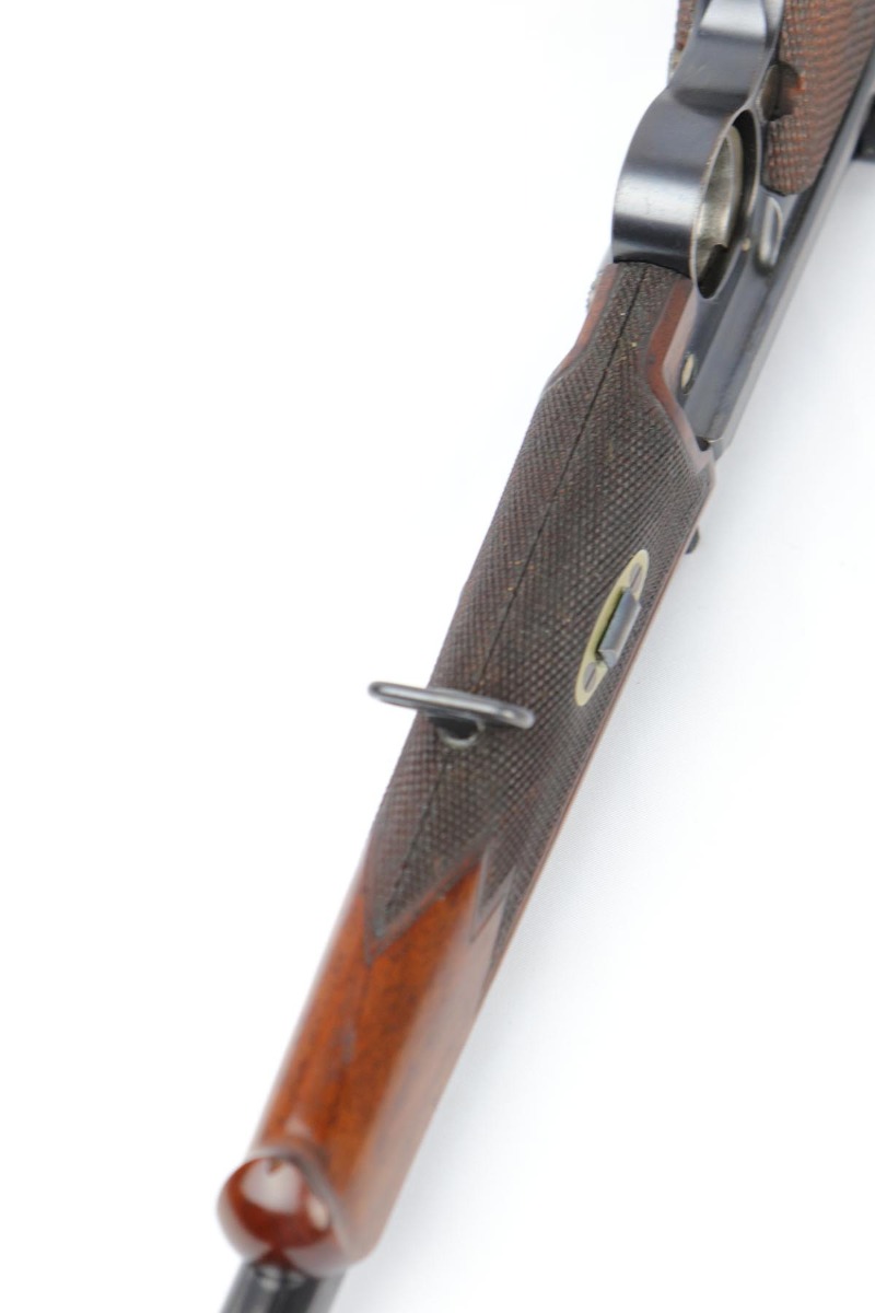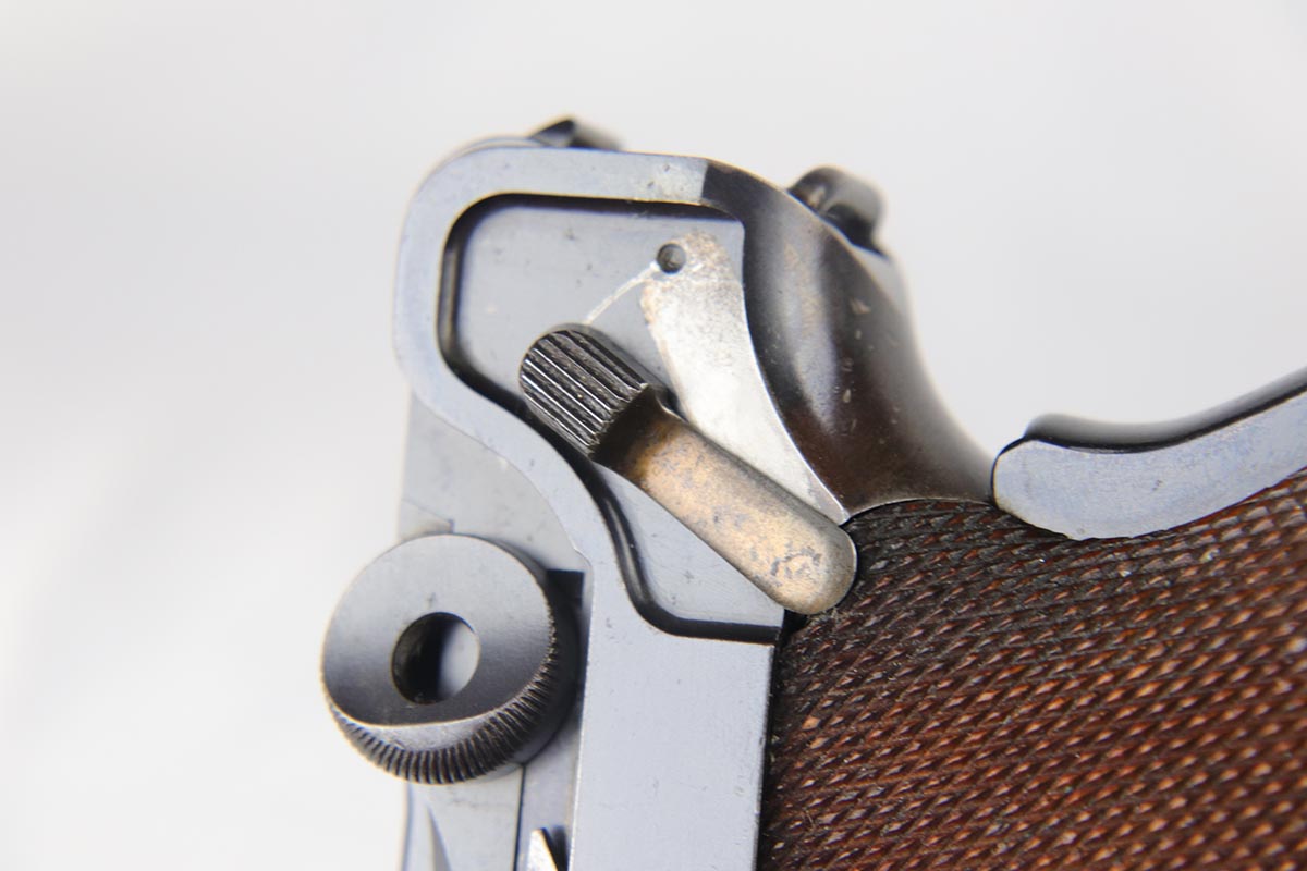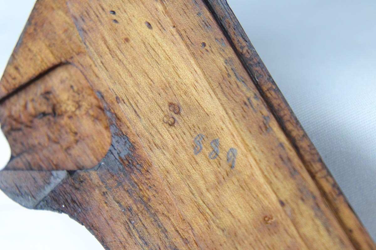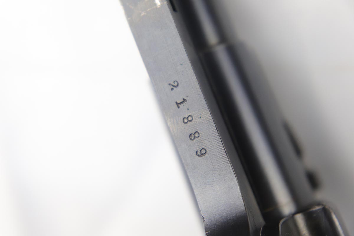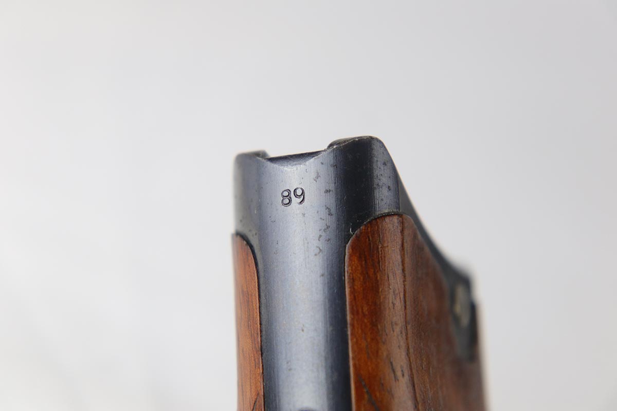 5/30/18 – This must be one of the best preserved Luger carbines in existence – an early gun in 98-99% original condition with just a hint of wear on high edges and a couple of tiny freckles here and there that are too small to show in the photographs. The 1902 Carbine was DWM’s solution to a light hunting rifle. Chambered in potent .30 luger cartridge with a detachable shoulder stock, the Luger carbine made for a compact, yet respectable alternative to the standard light sporting rifles of that era. Due to high cost, very few were made – 2500 in all – and some were either presented or purchased by the famous people of the day: Teddy Roosevelt and a President of Mexico included. This particular gun is all matching, including the shoulder stock that is also in excellent condition with a few small surface dents in the wood and an intact buttplate. Forearm is in excellent shape too with beautiful checkering that matches the pattern of the buttstock checkering. Excellent bore and grips. It appears that this gun spent most of the 116 years of its life in the safe and can’t have been shot much at all. A great historical luger that is considered by many to be at the top of the pyramid of luger collecting. An original period leather covered hard retailer case can also be made available to the buyer at an additional charge of $4500.